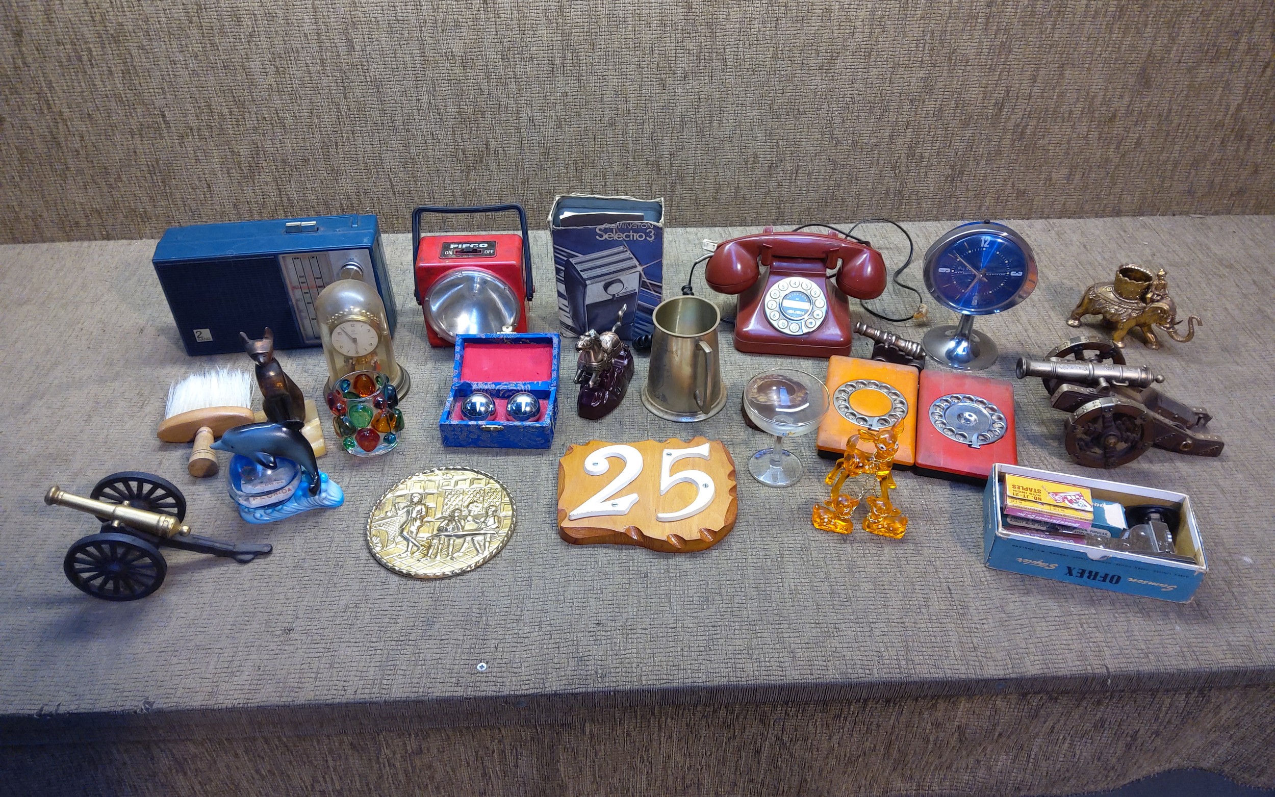 Vintage electronic items include a Dansette Oxford radio, a vintage Bush telephone and babycham glasses.