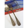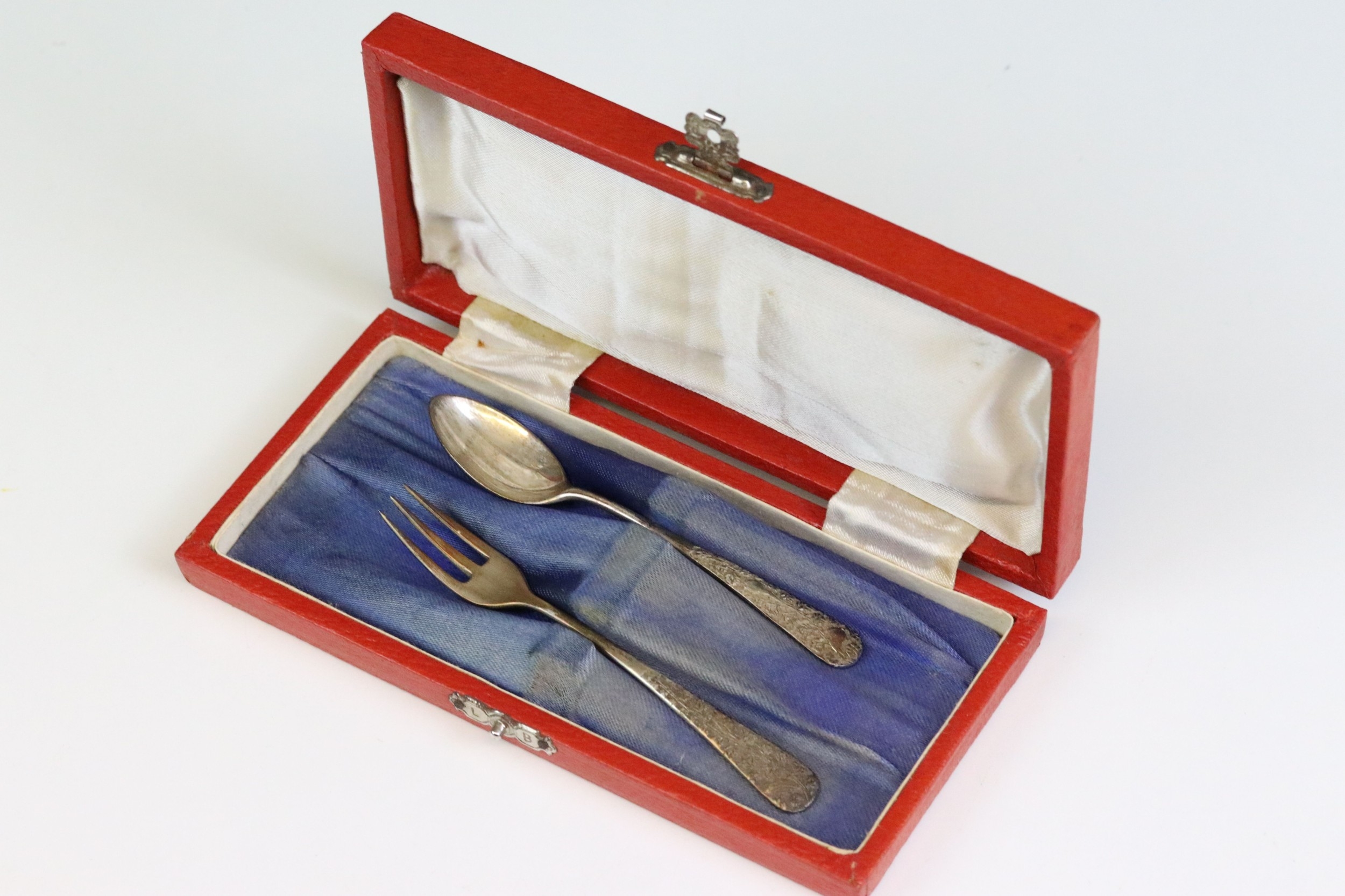 Silver christening spoon and fork with floral embossed detail to handles, housed within presentation box, stamped silver