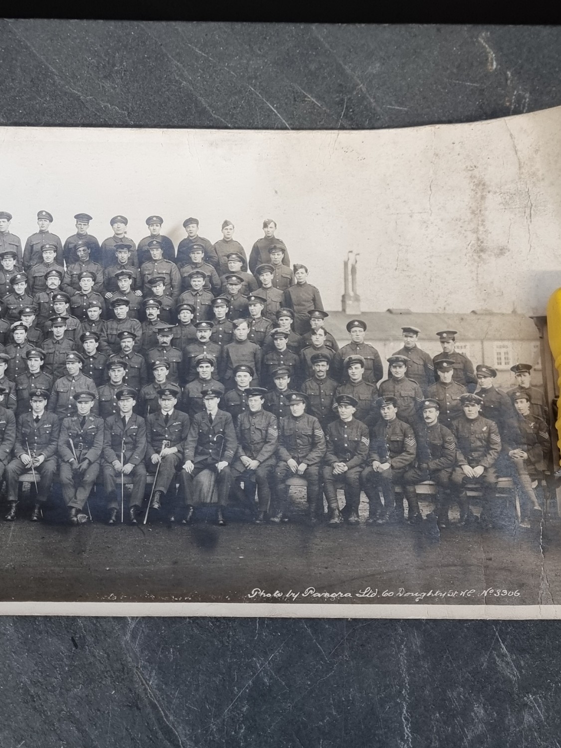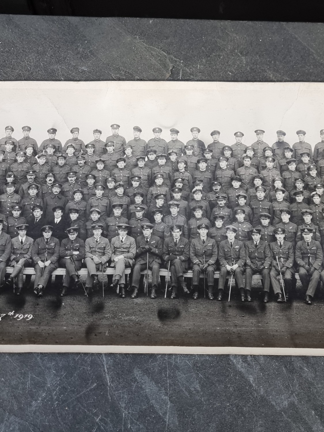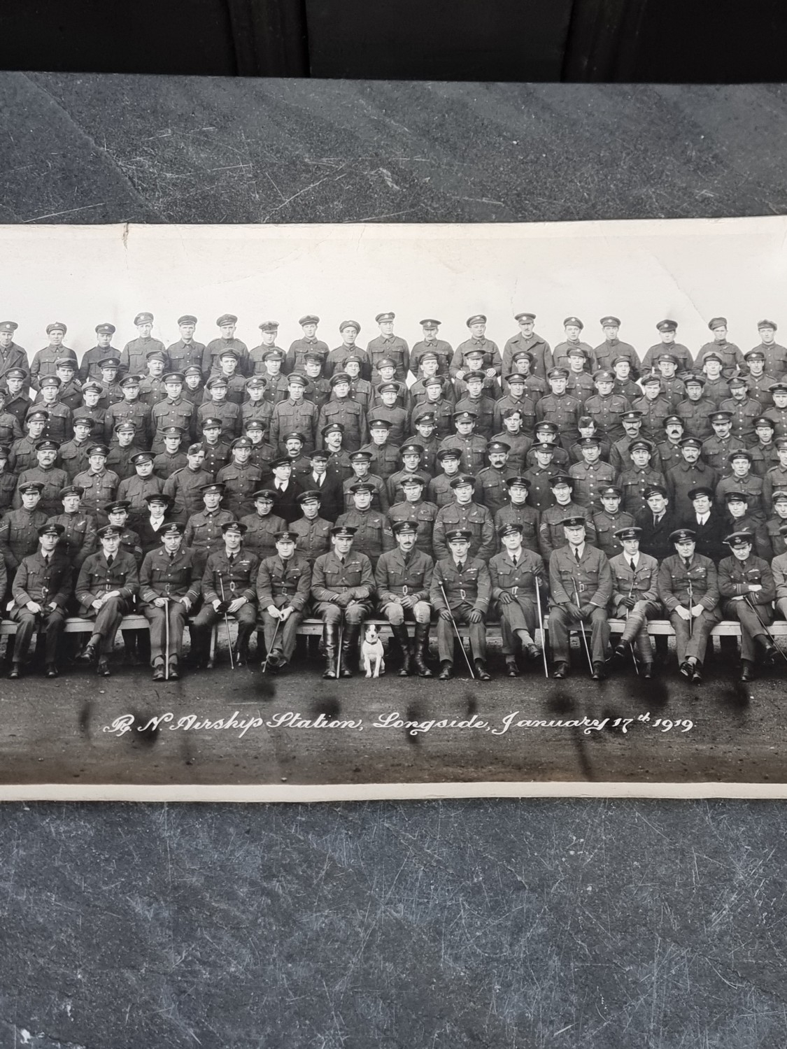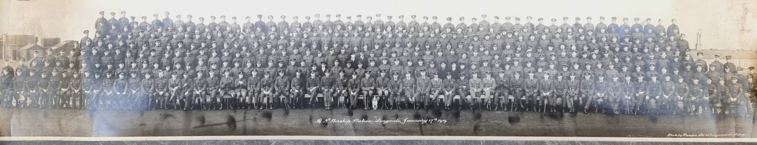 A WWI panoramic monochrome photograph of a group of Royal Naval Airship officers and men, titled 'R.N Airship Station, Longside, January 17th 1919', by Panora Ltd, 60 Doughtry St, KC, 104 X 20.5cm, rolled.