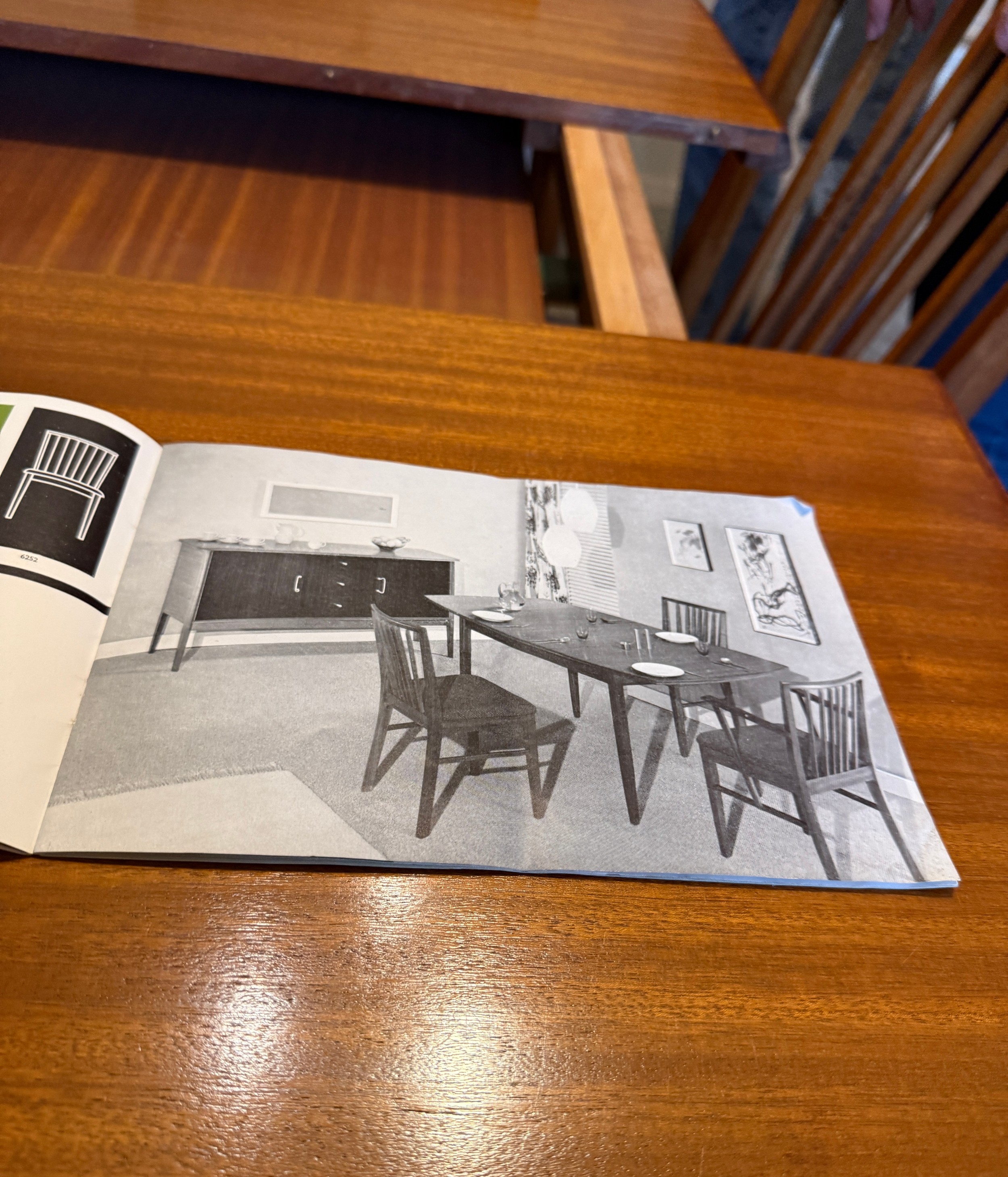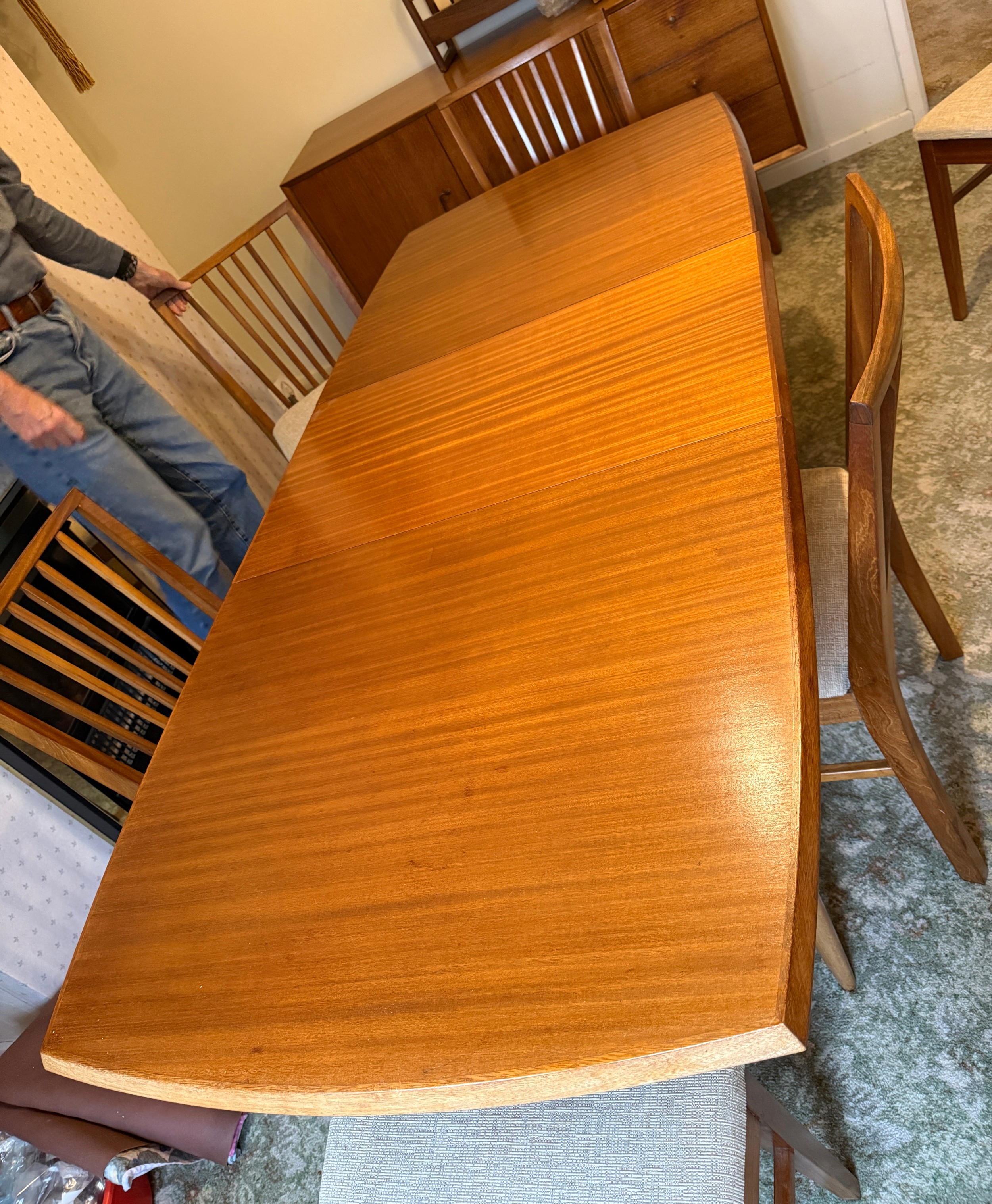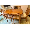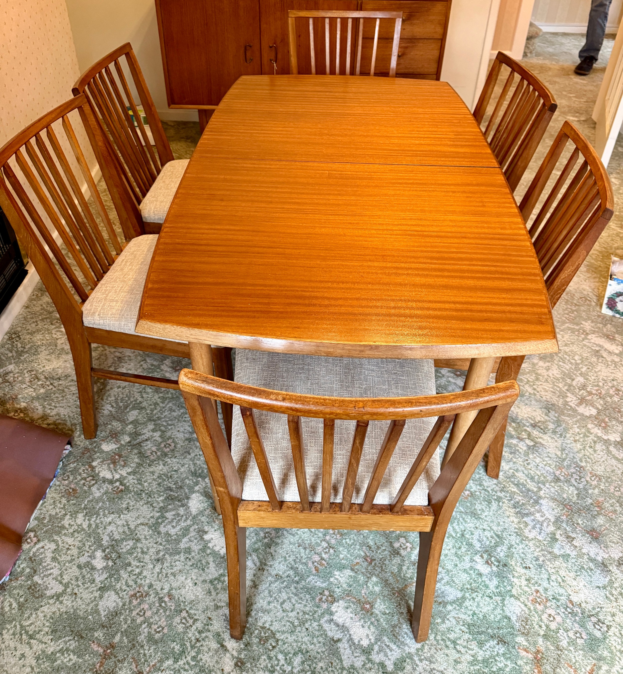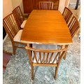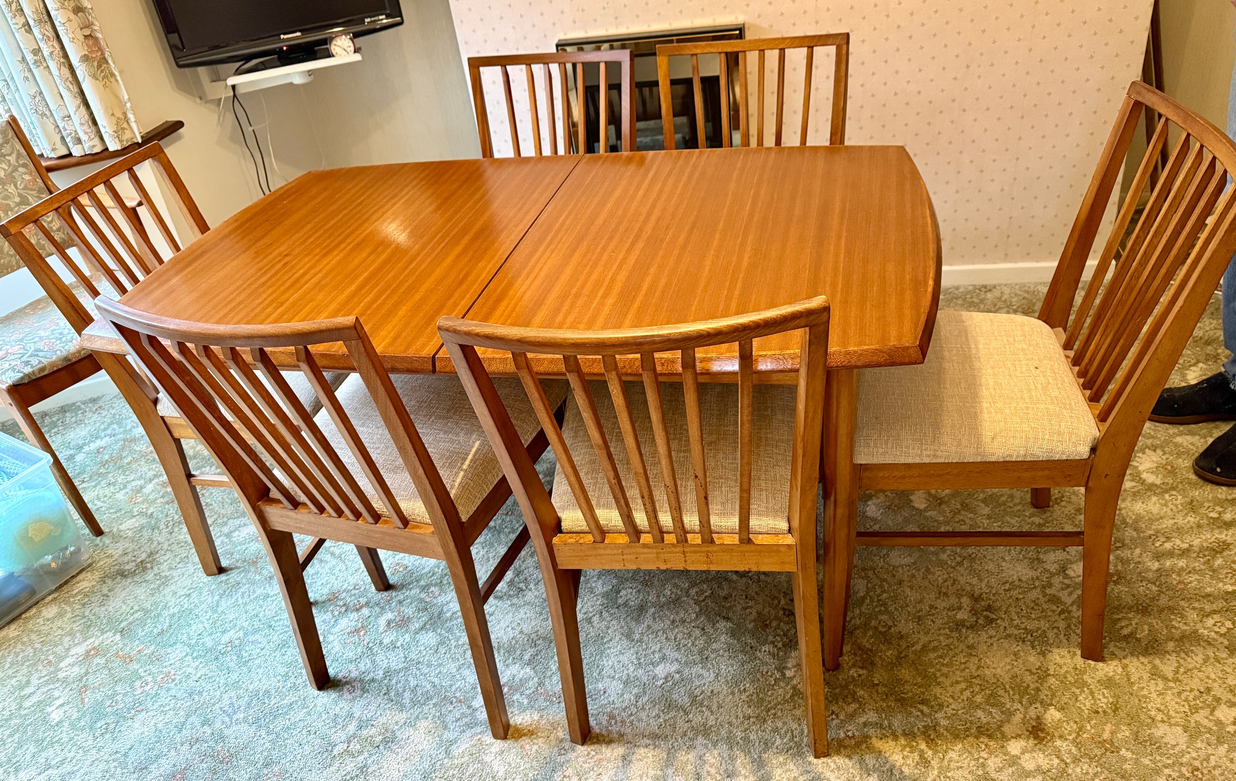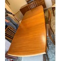 A mid 20thC Vanson teak extending dining table and six chairs. Closed 139 x 82w, extended 181cm l.