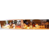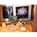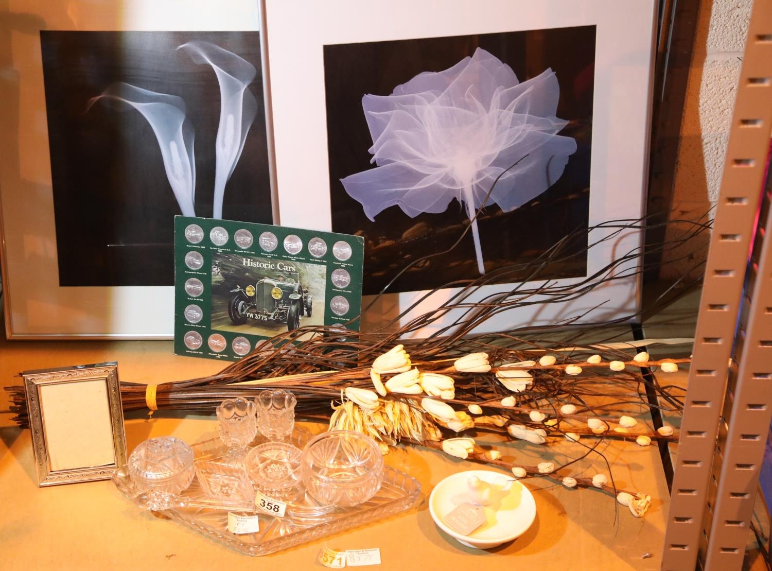 Shelf of mixed glass, pottery, coins, dried flowers and two framed floral prints. Not available for in-house P&P, contact Paul O'Hea at Mailboxes on 01925 659133