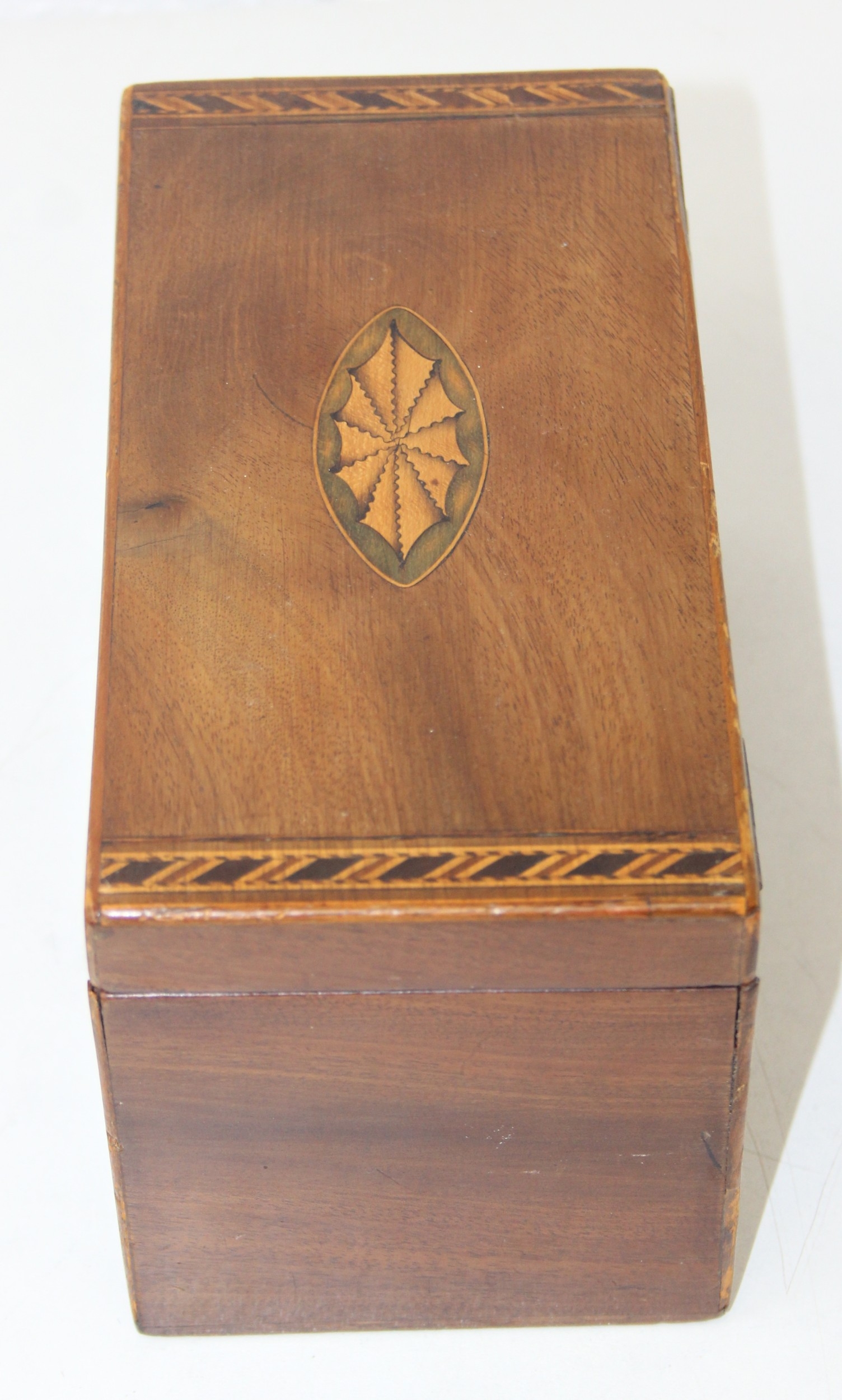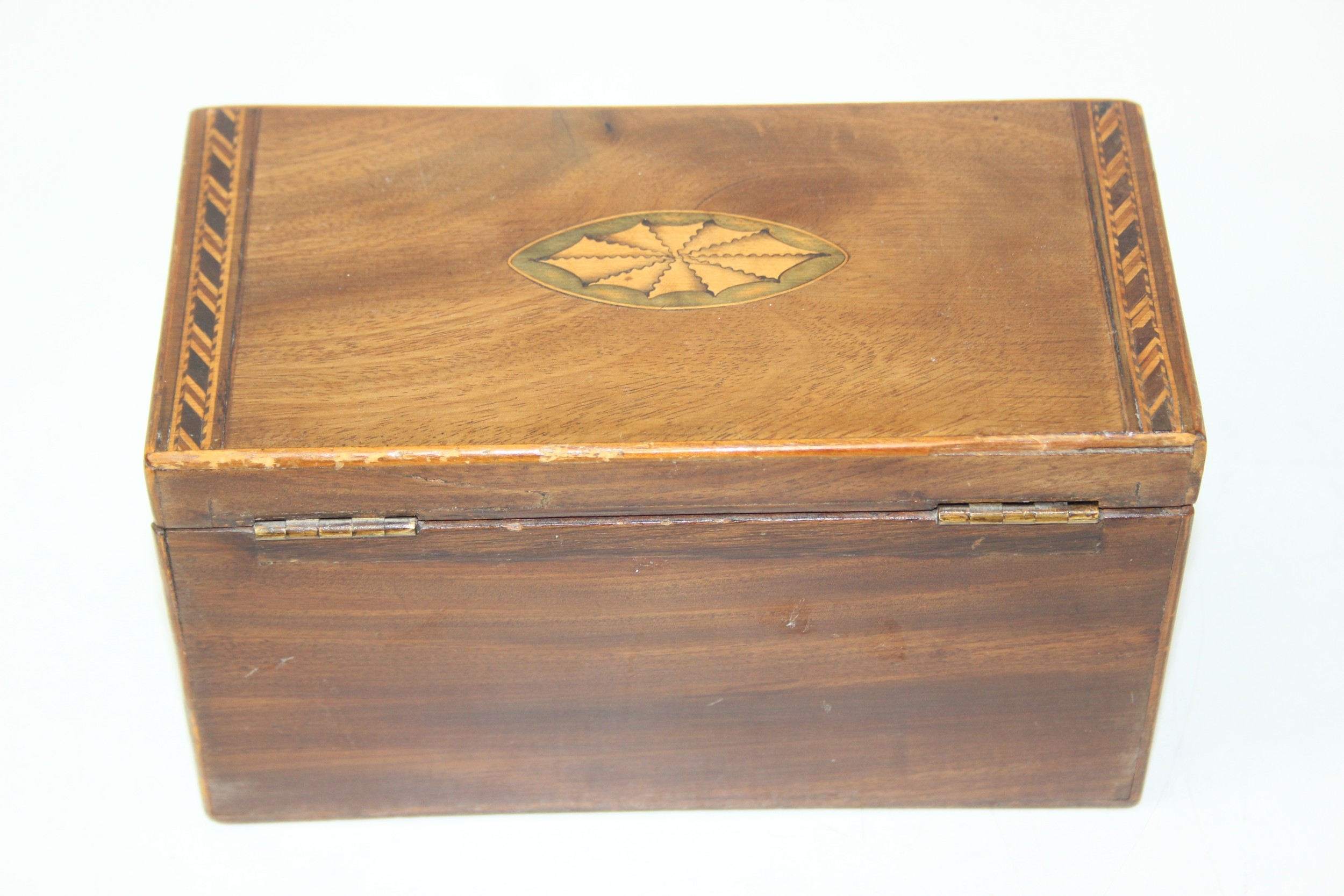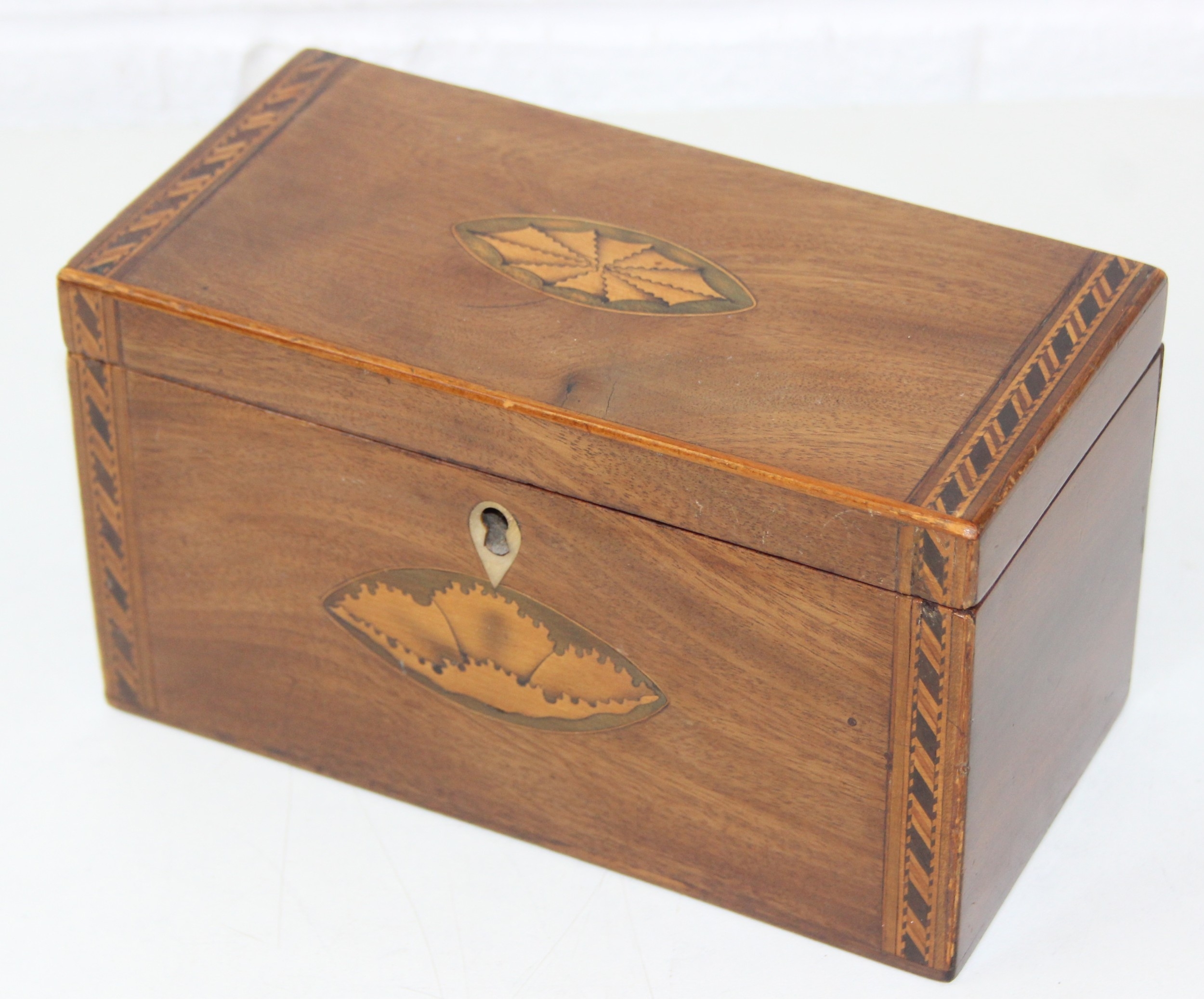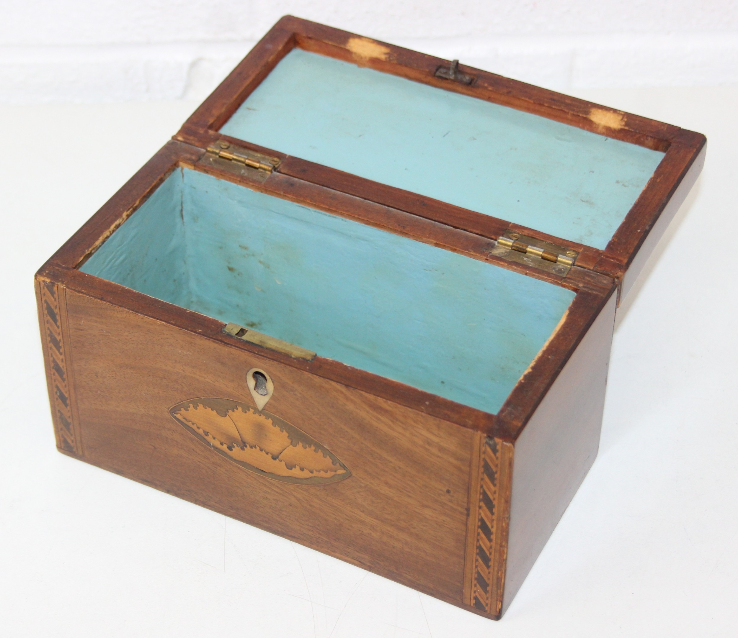 A Georgian Sheraton inlaid mahogany tea caddy with inlaid shell motifs and decorative border, lacking interior, 20cm wide