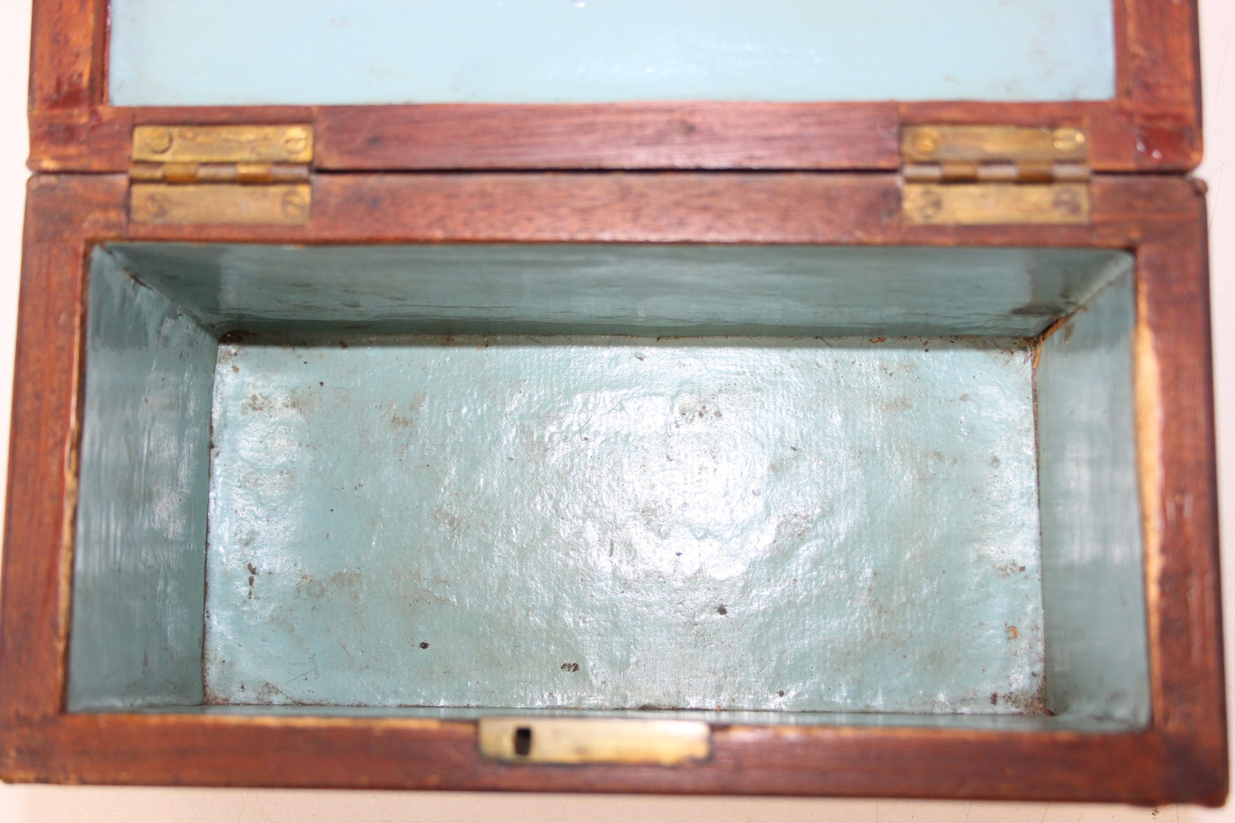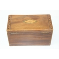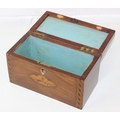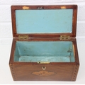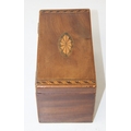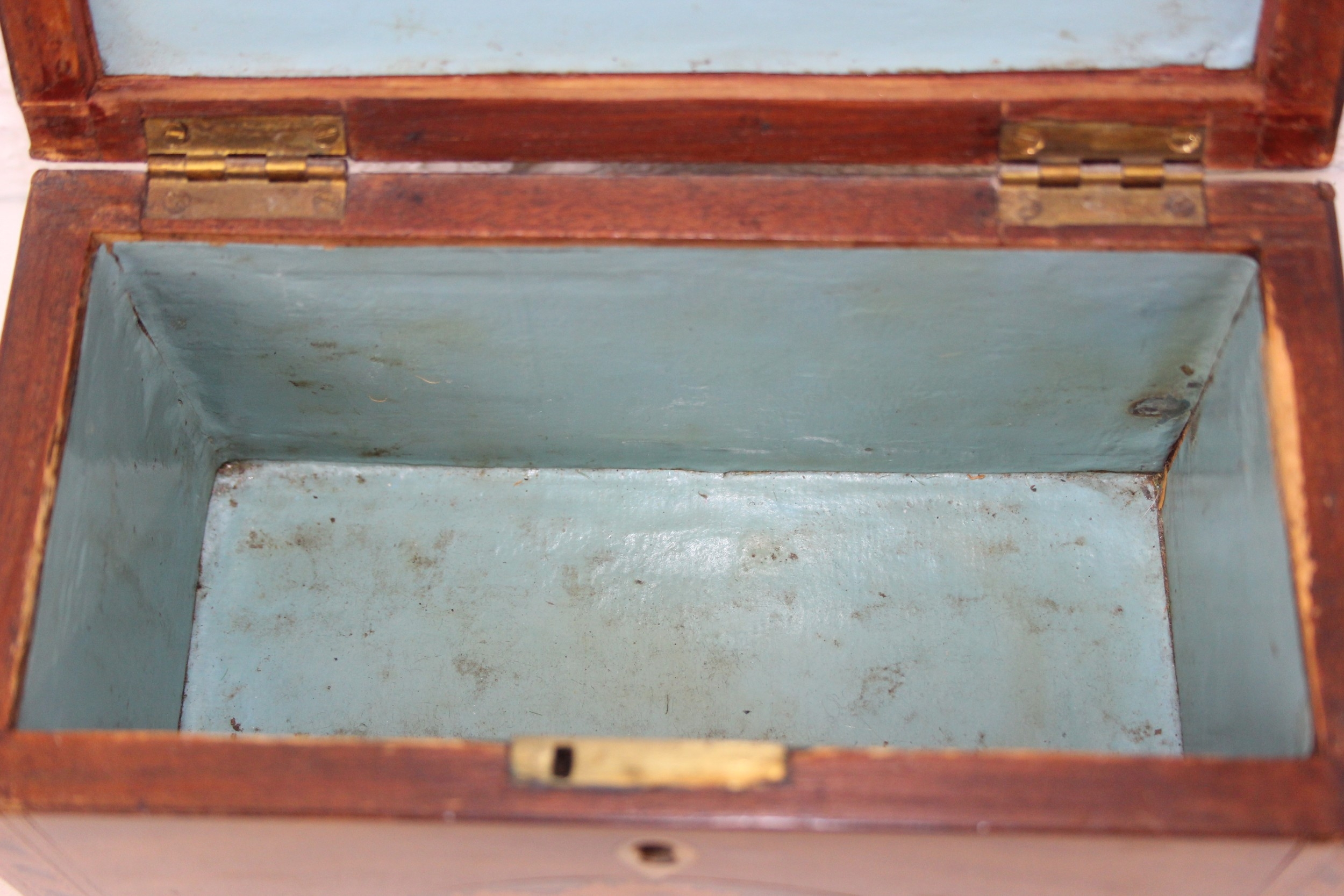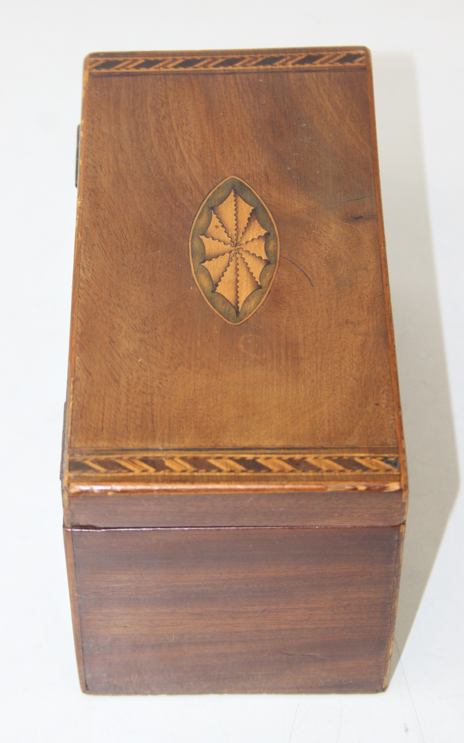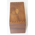 A Georgian Sheraton inlaid mahogany tea caddy with inlaid shell motifs and decorative border, lacking interior, 20cm wide