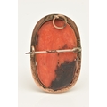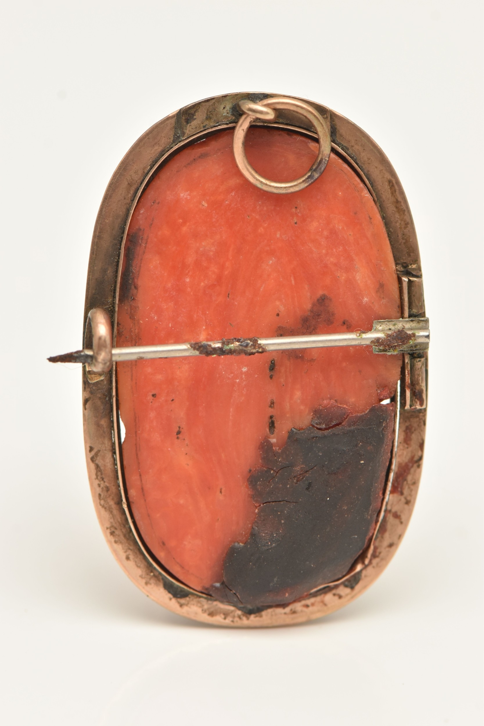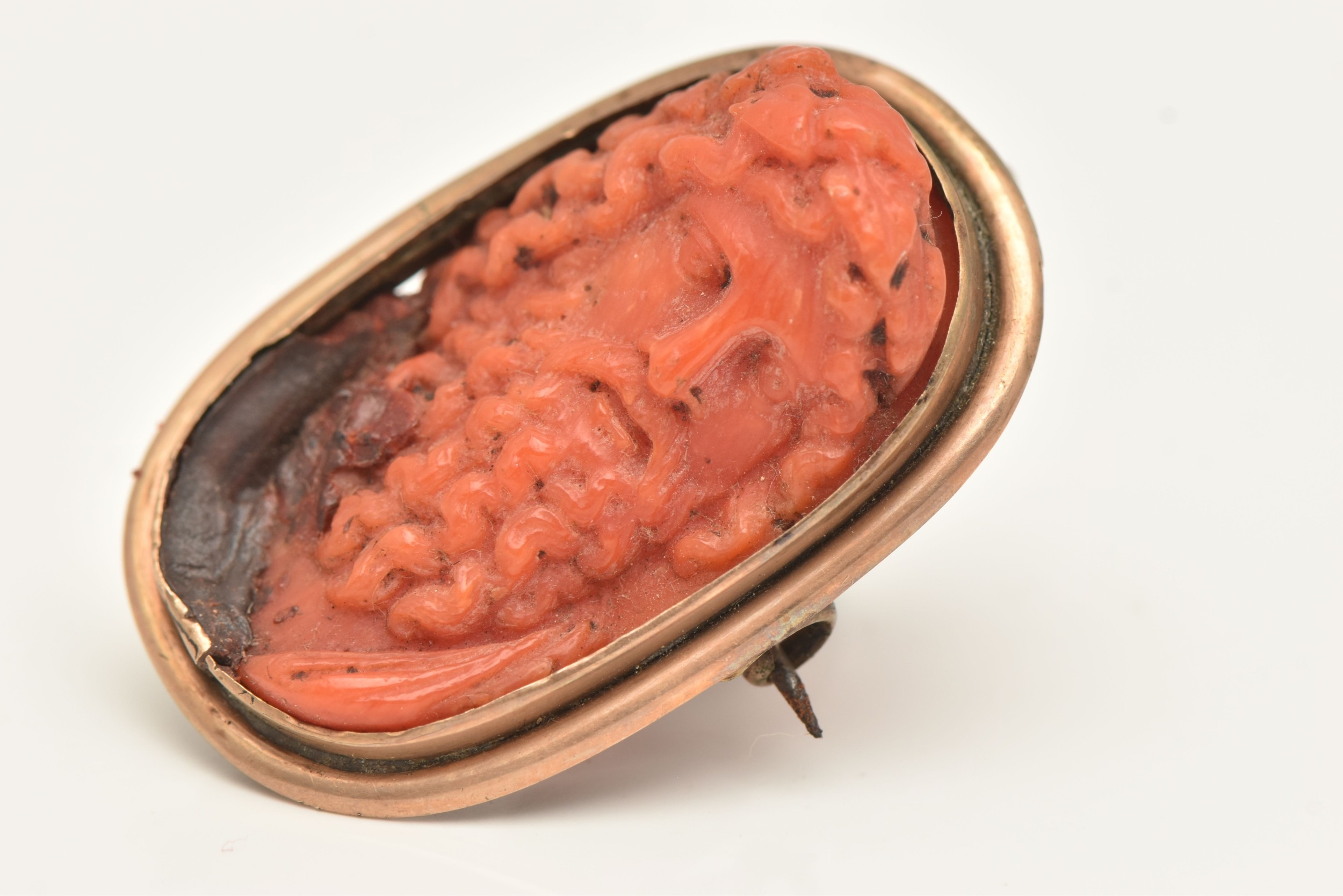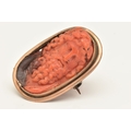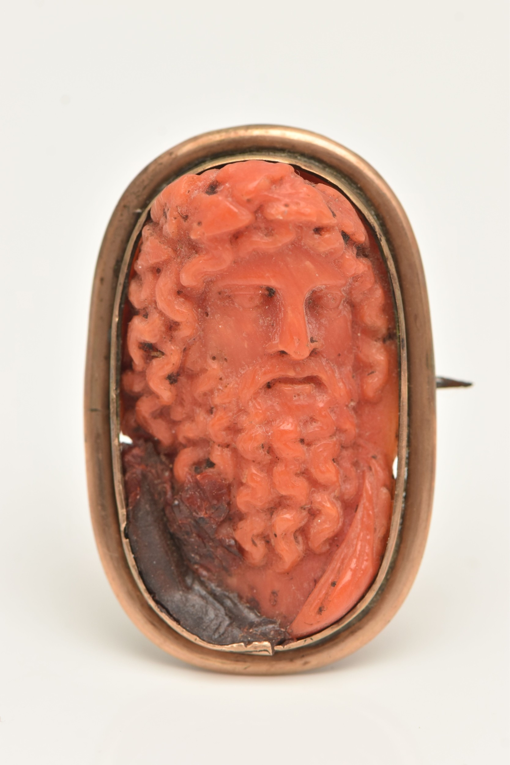 A CARVED CORAL BROOCH PENDANT, oval form depiction of Zeus, yellow metal surround, unmarked, fitted with base metal pin, approximate gross weight 10 grams, (condition report: general moderate wear)