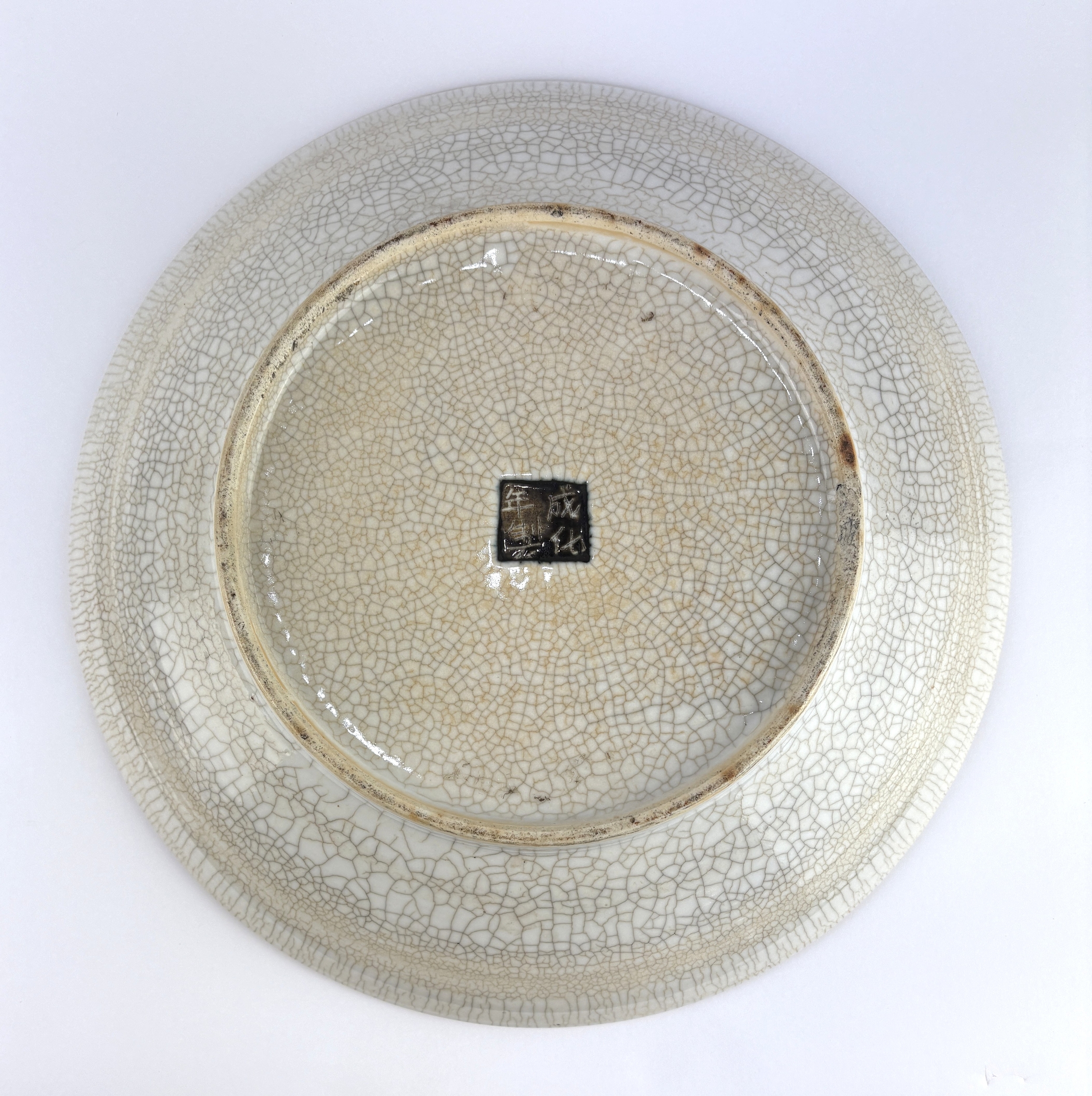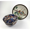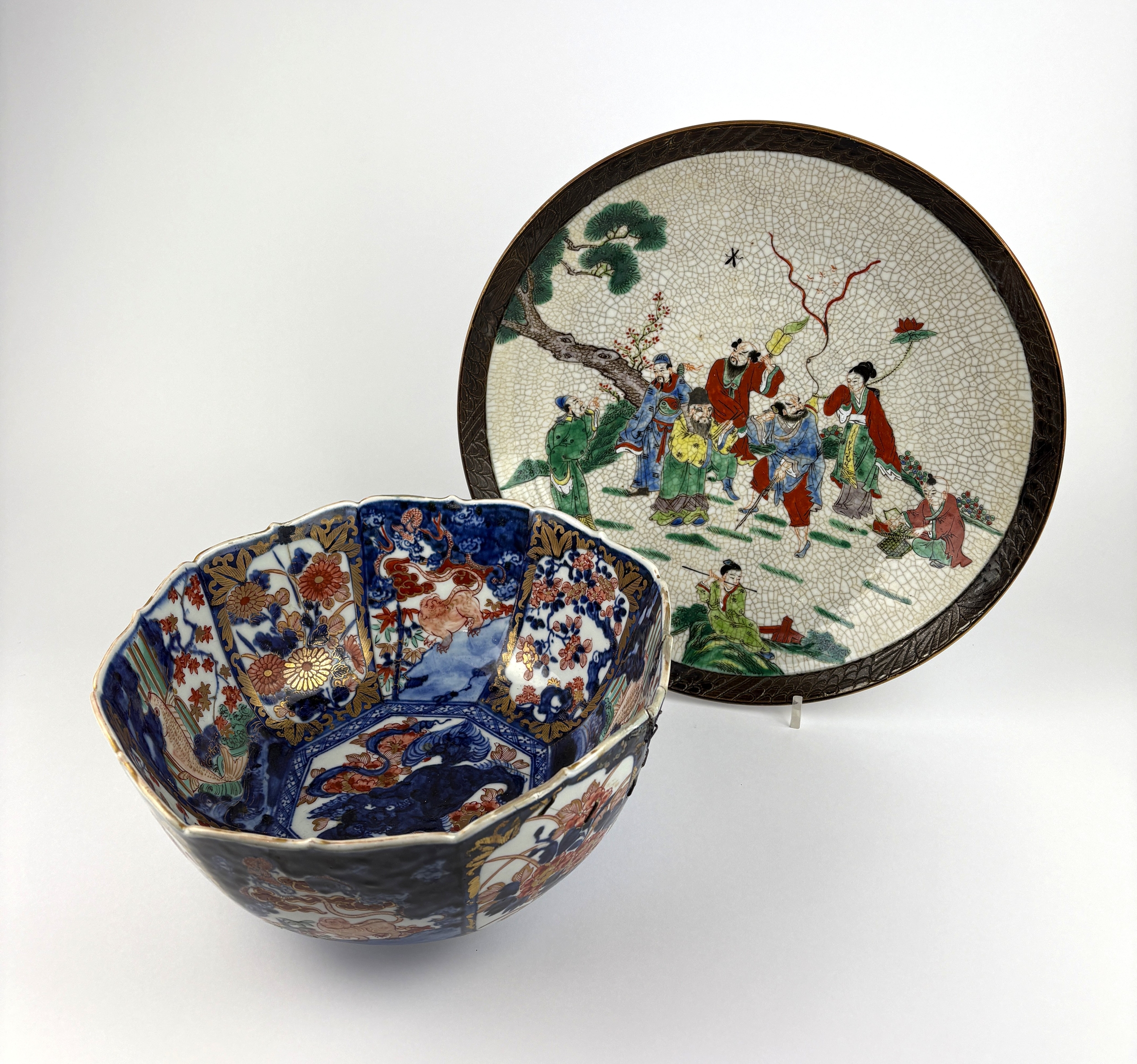 A Chinese charger, crackle glazed, centrally decorated in enamels with figural scenes within a landscape, bronzed rim, bearing impressed character type mark to base, diameter 33.5cm, and a Japanese Imari porcelain bowl with gilt embellishments, blue square mark to base, stapled repair, 26cm diameter