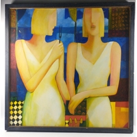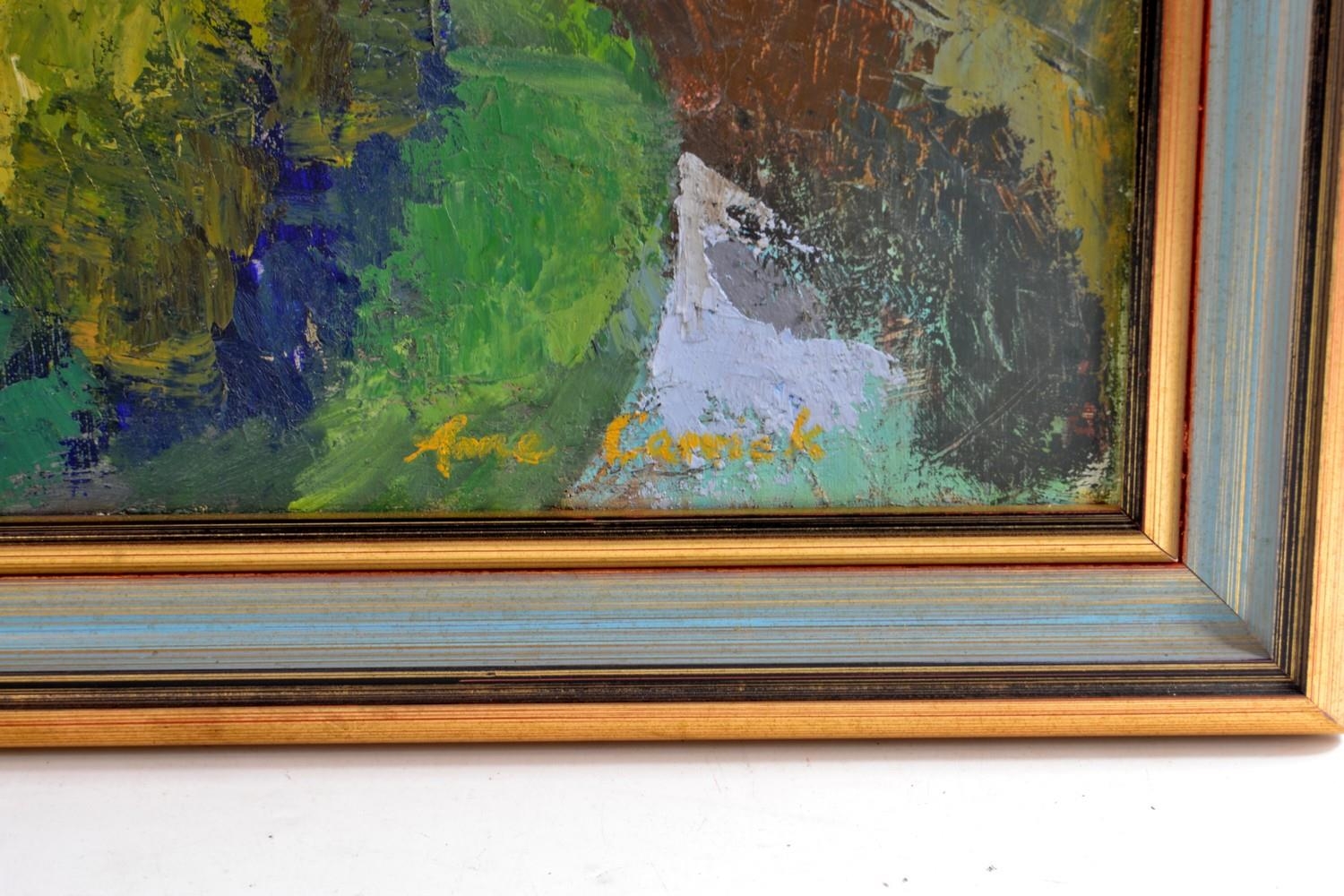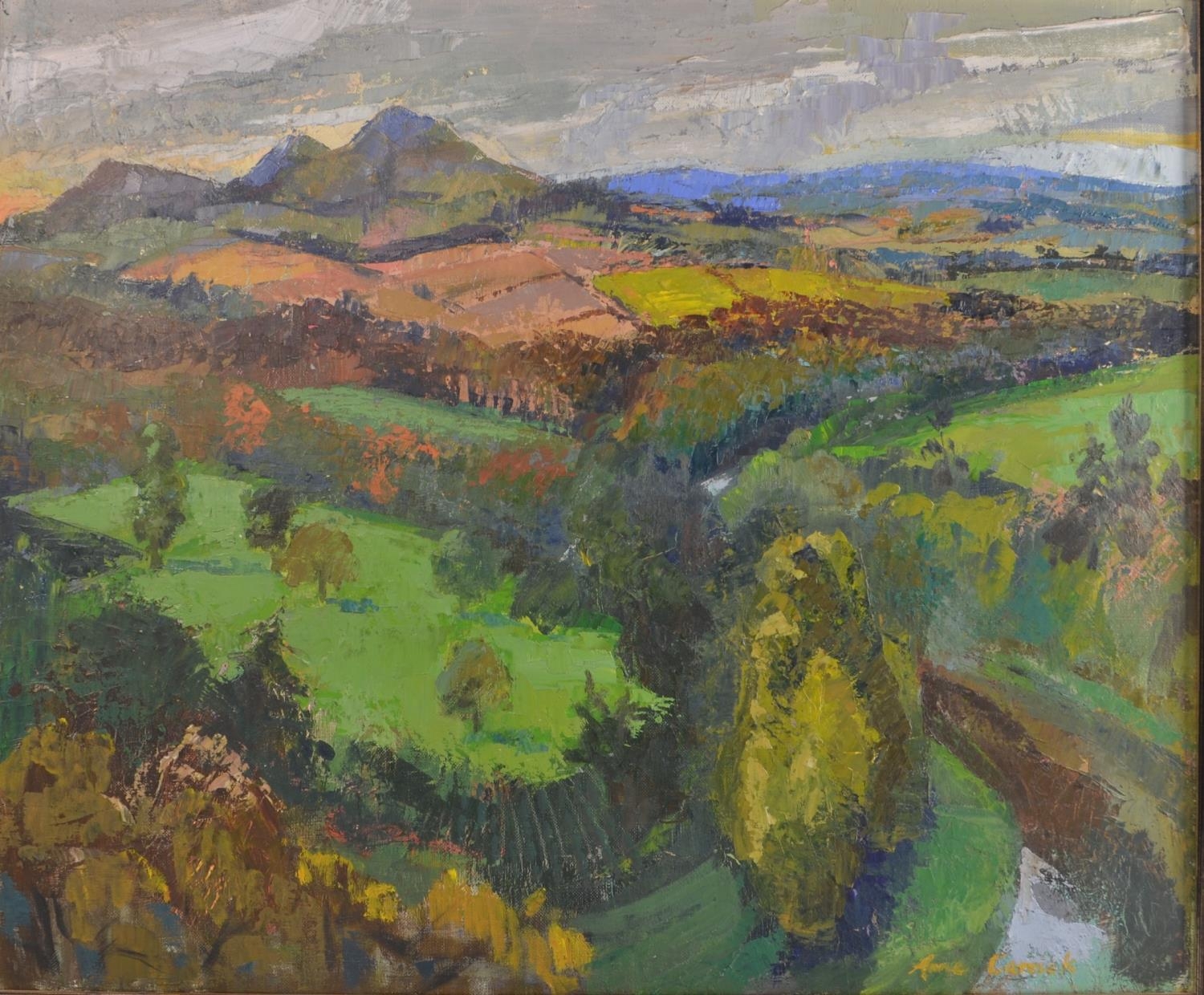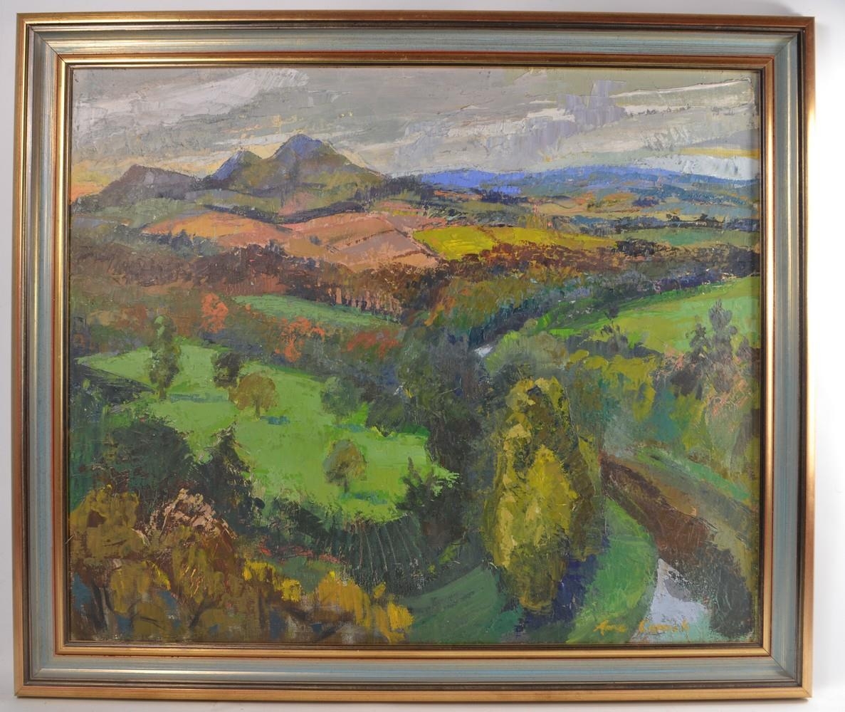 LOCAL INTEREST Framed ANNE CARRICK original oil on canvas SIGNED 1964 ' SCOTT'S VIEW depicting Scott's View looking towards Bemersyde, The River Tweed & Eildon Hills, VERSO showing Mainhill Gallery label