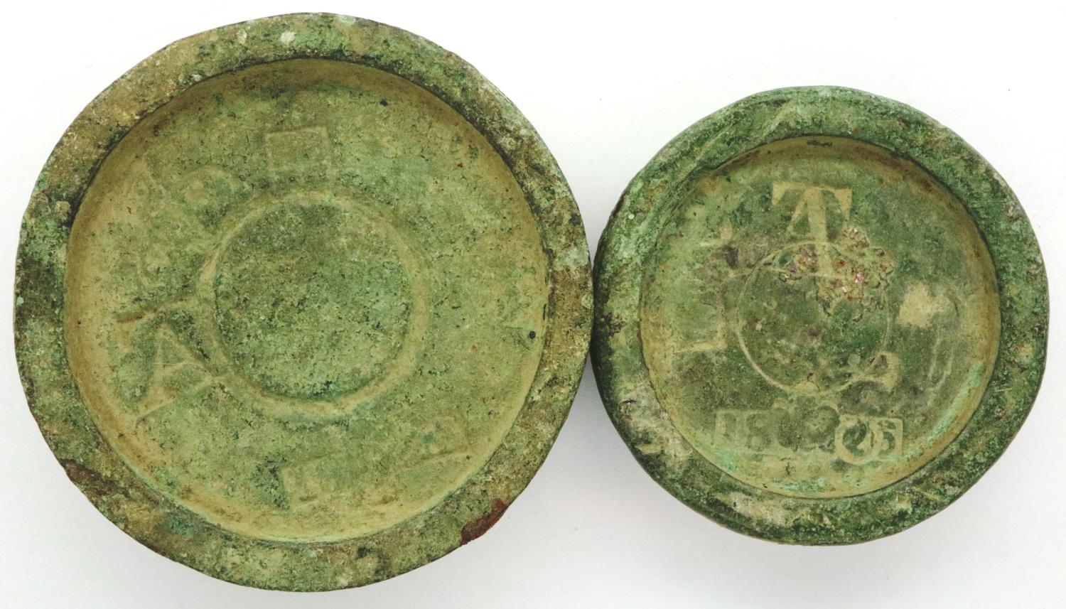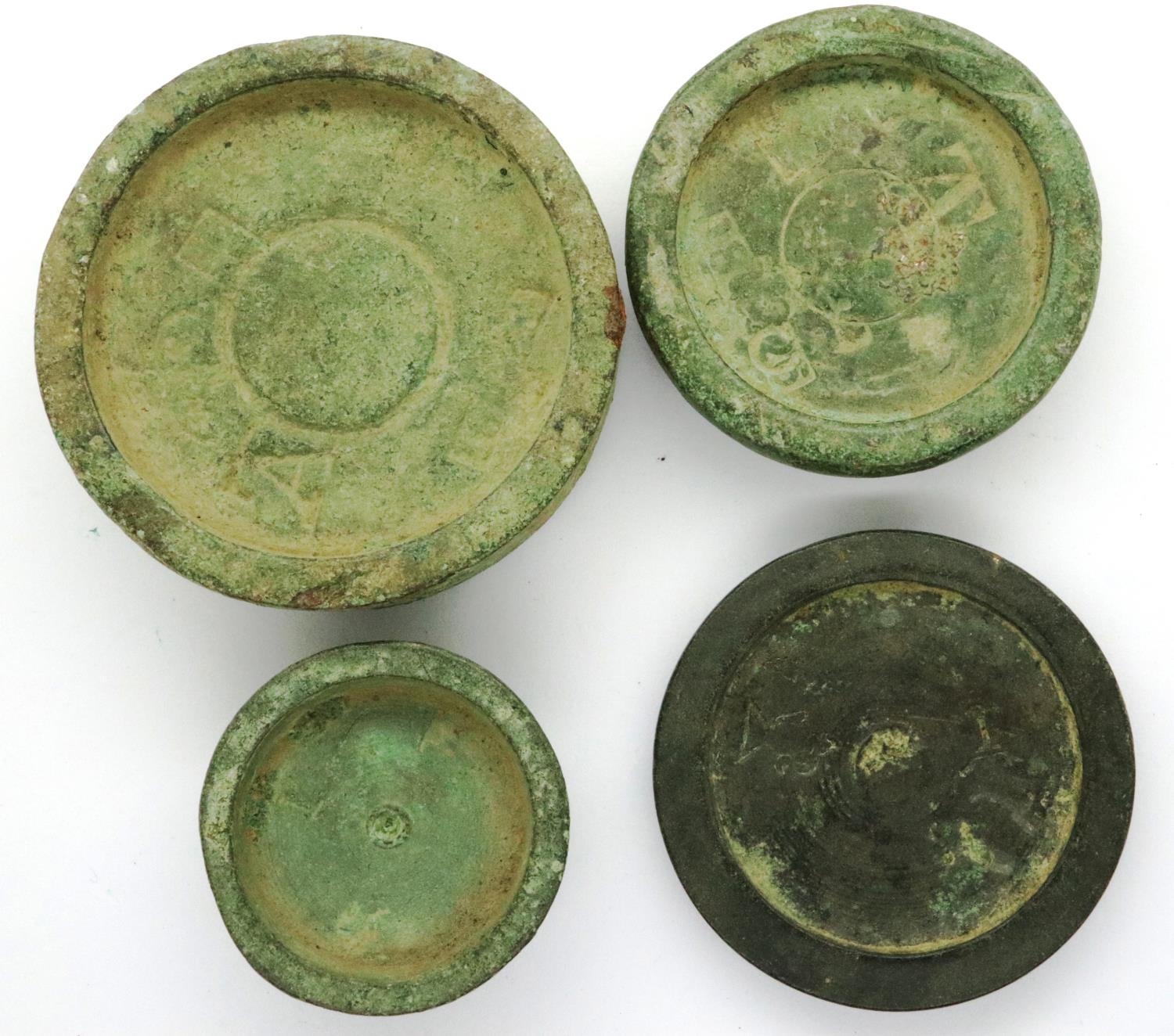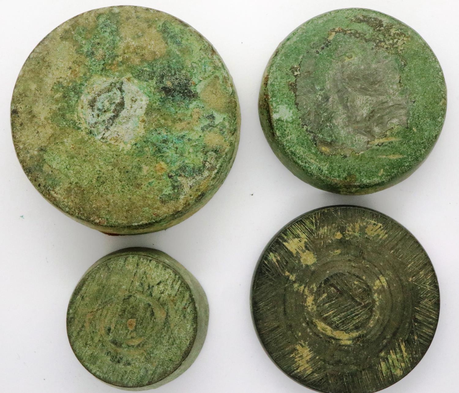 Victorian period weight counters/trade balances, largest D: 45 mm. P&P Group 0 (£5+VAT for the first lot and £1+VAT for subsequent lots)