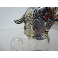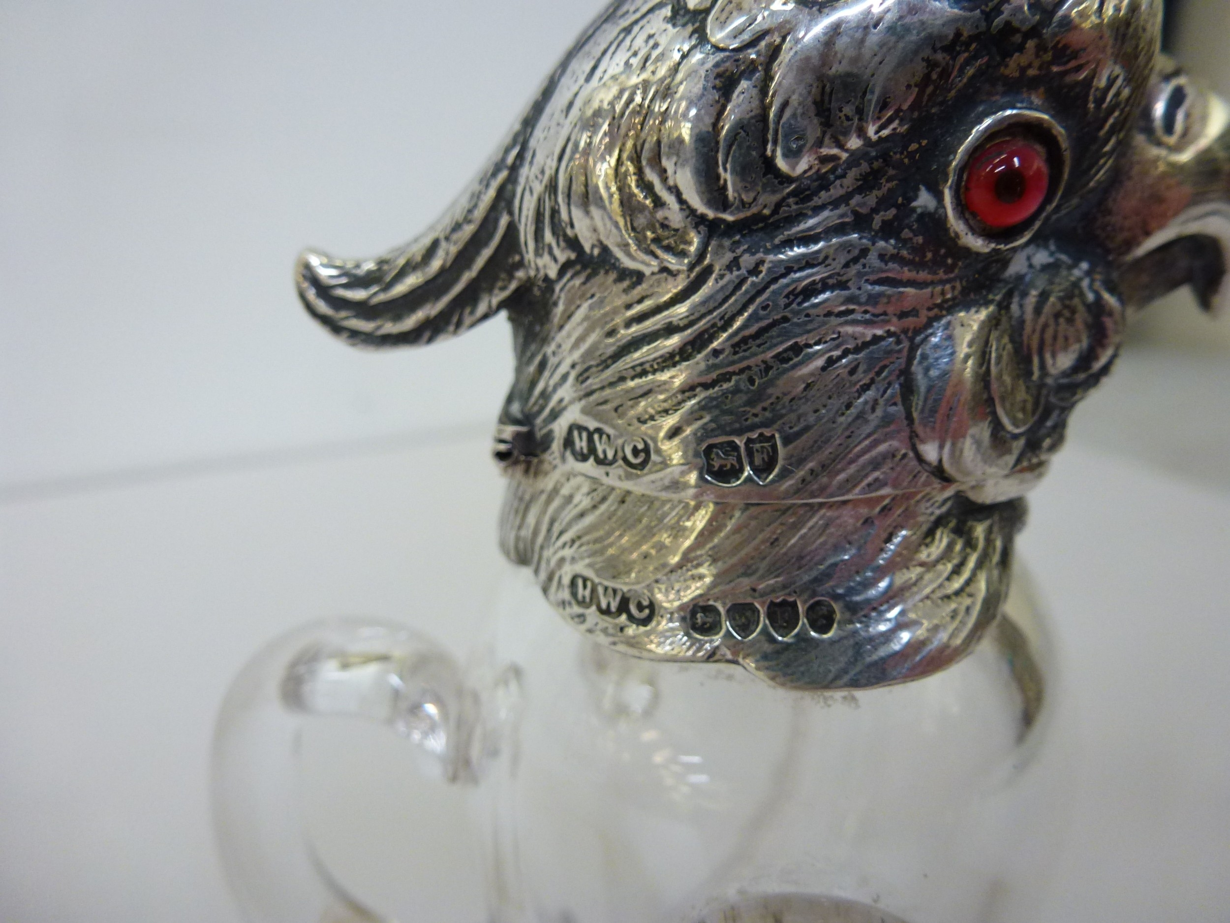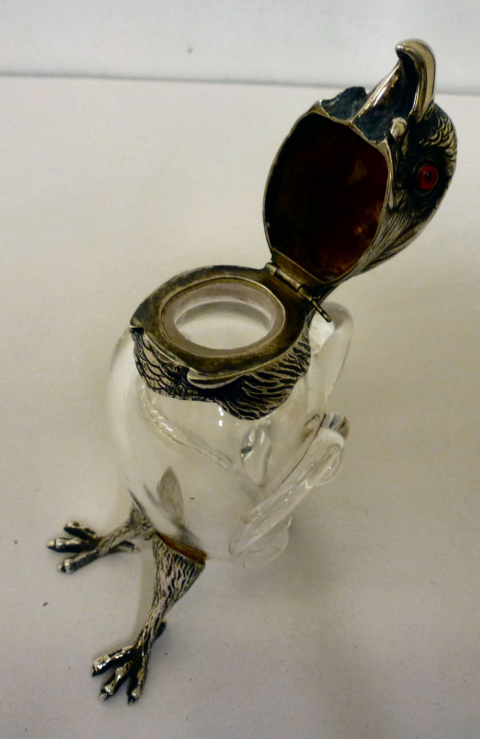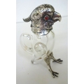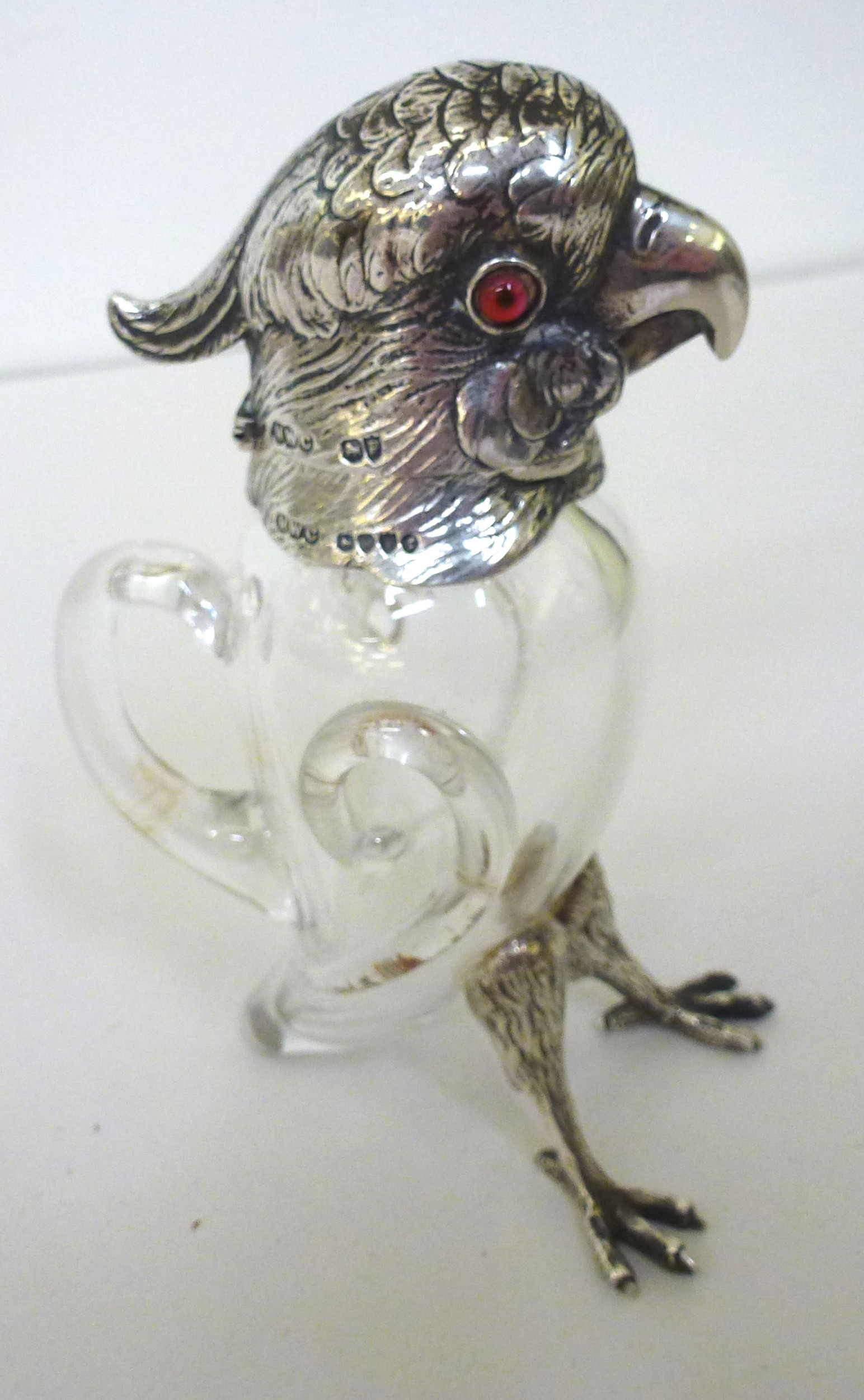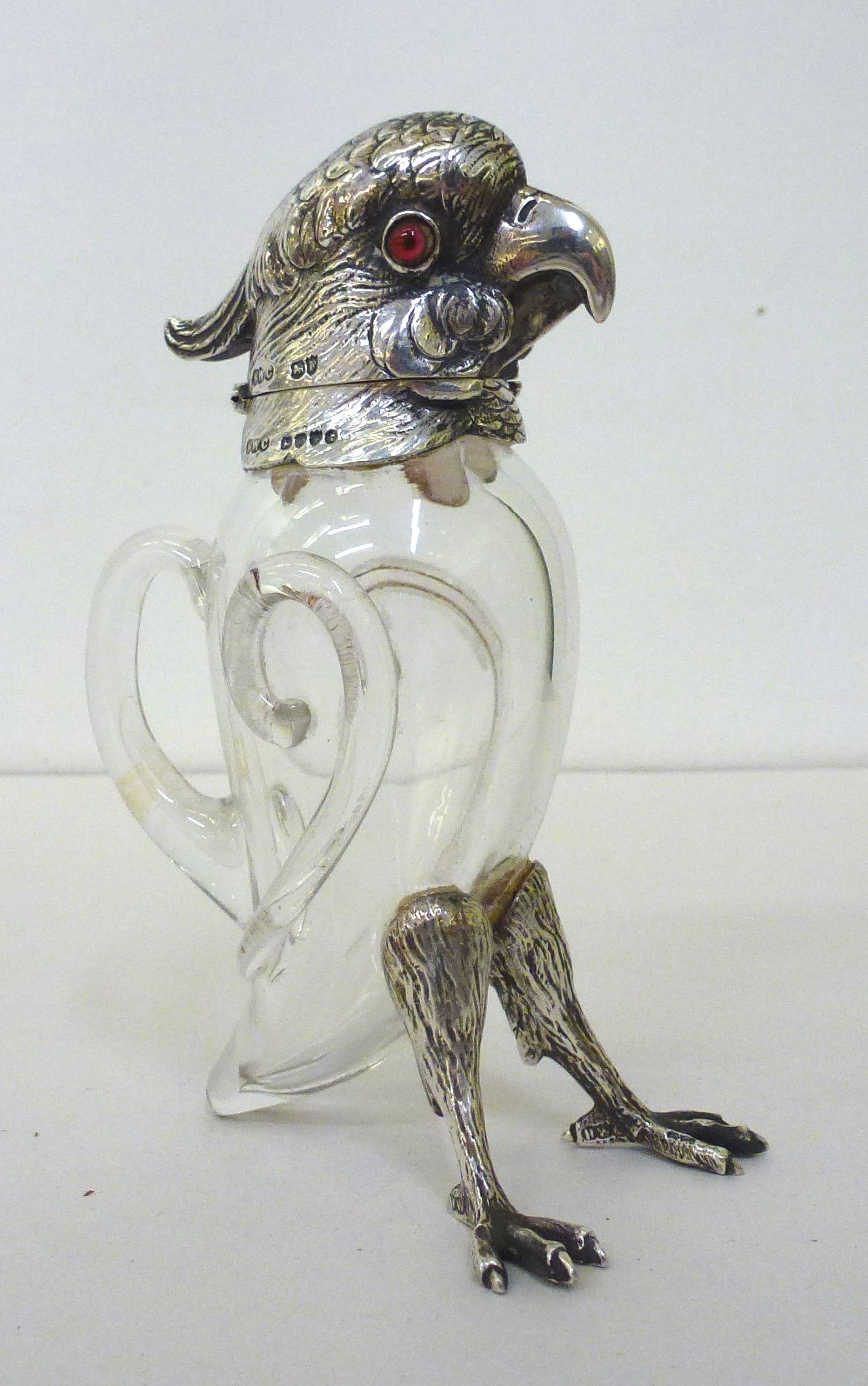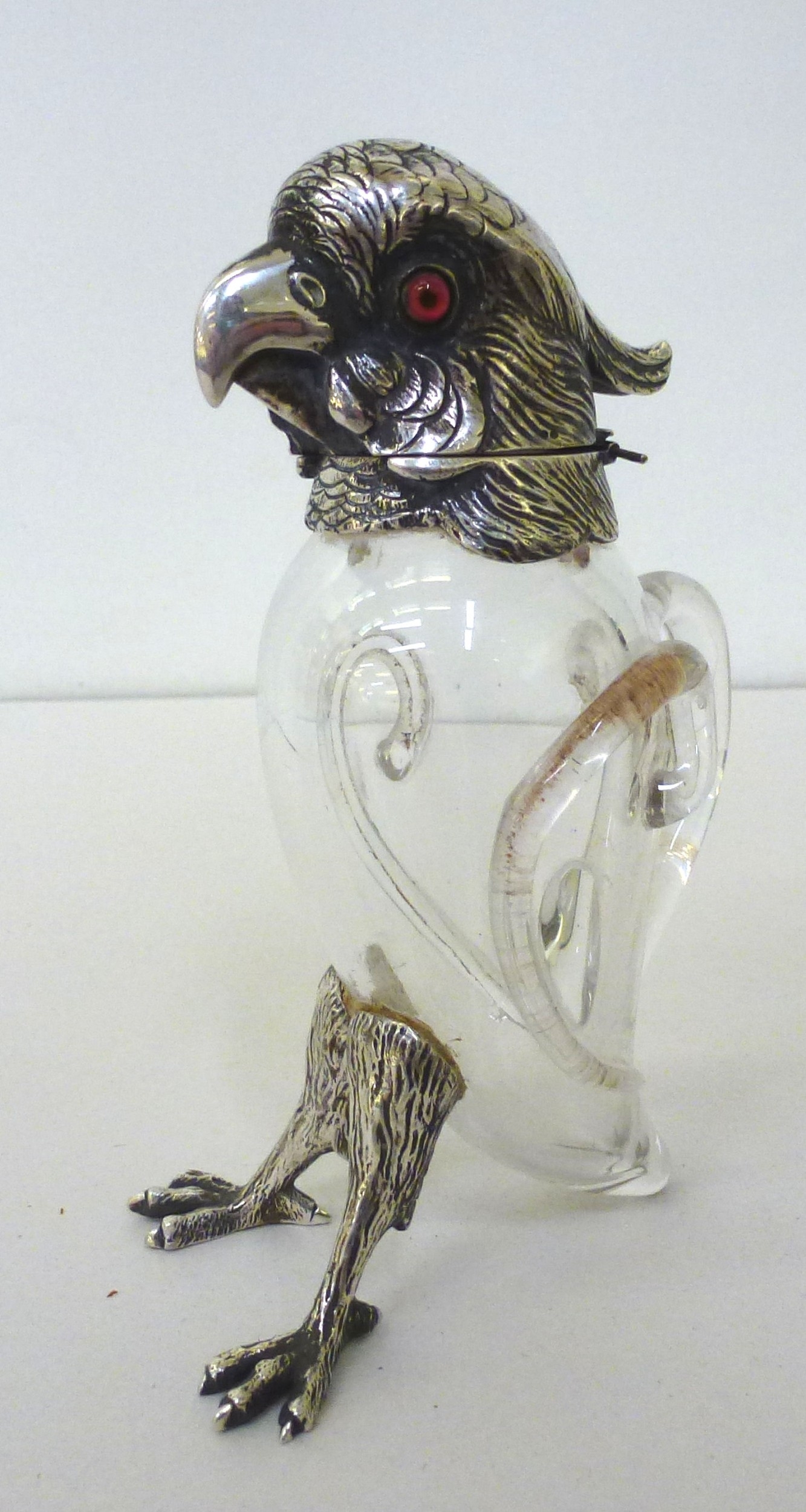 A late Victorian whisky decanter, fashioned as a parrot with a silver collar, head and legs Henry William Currey London import marks 1881 6"h