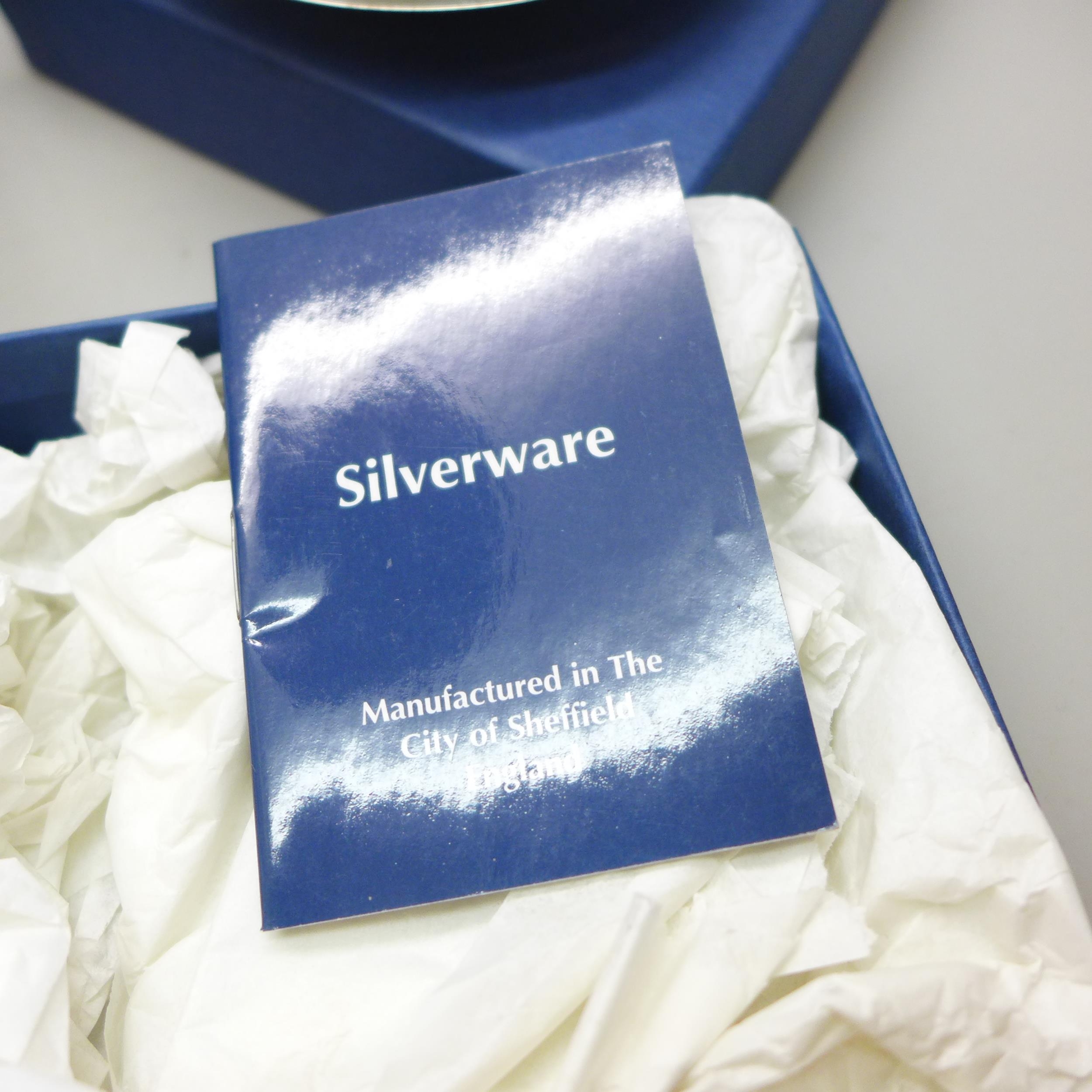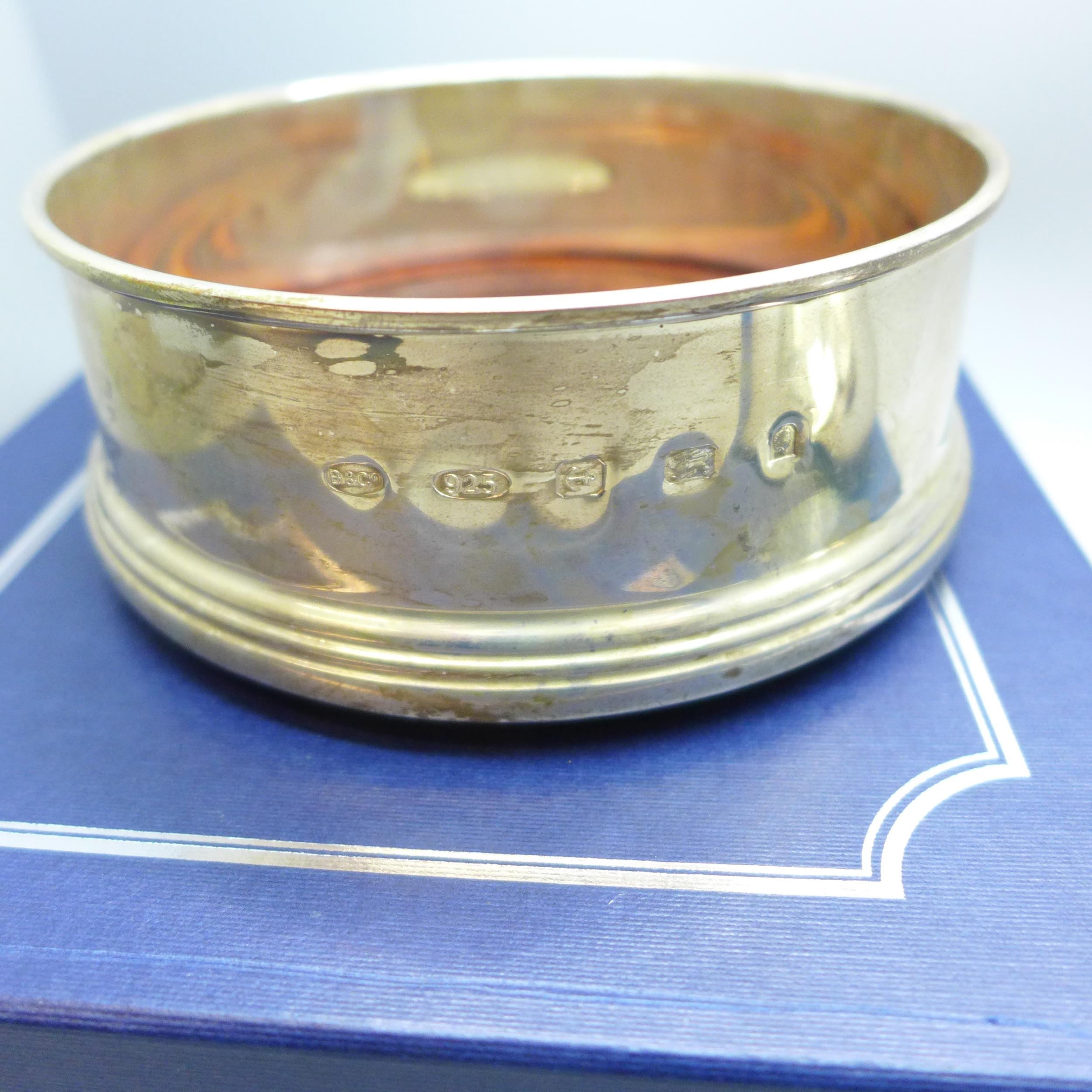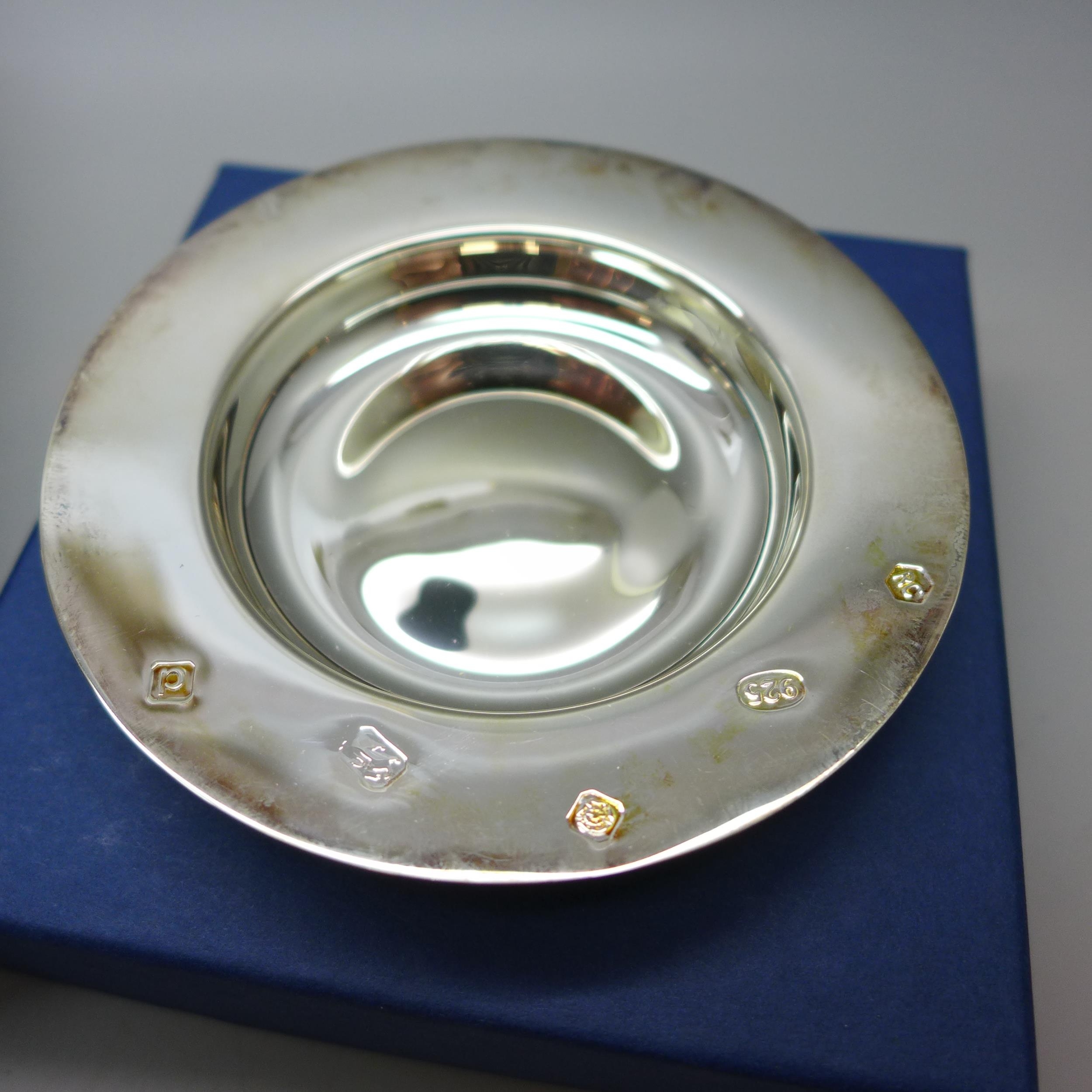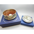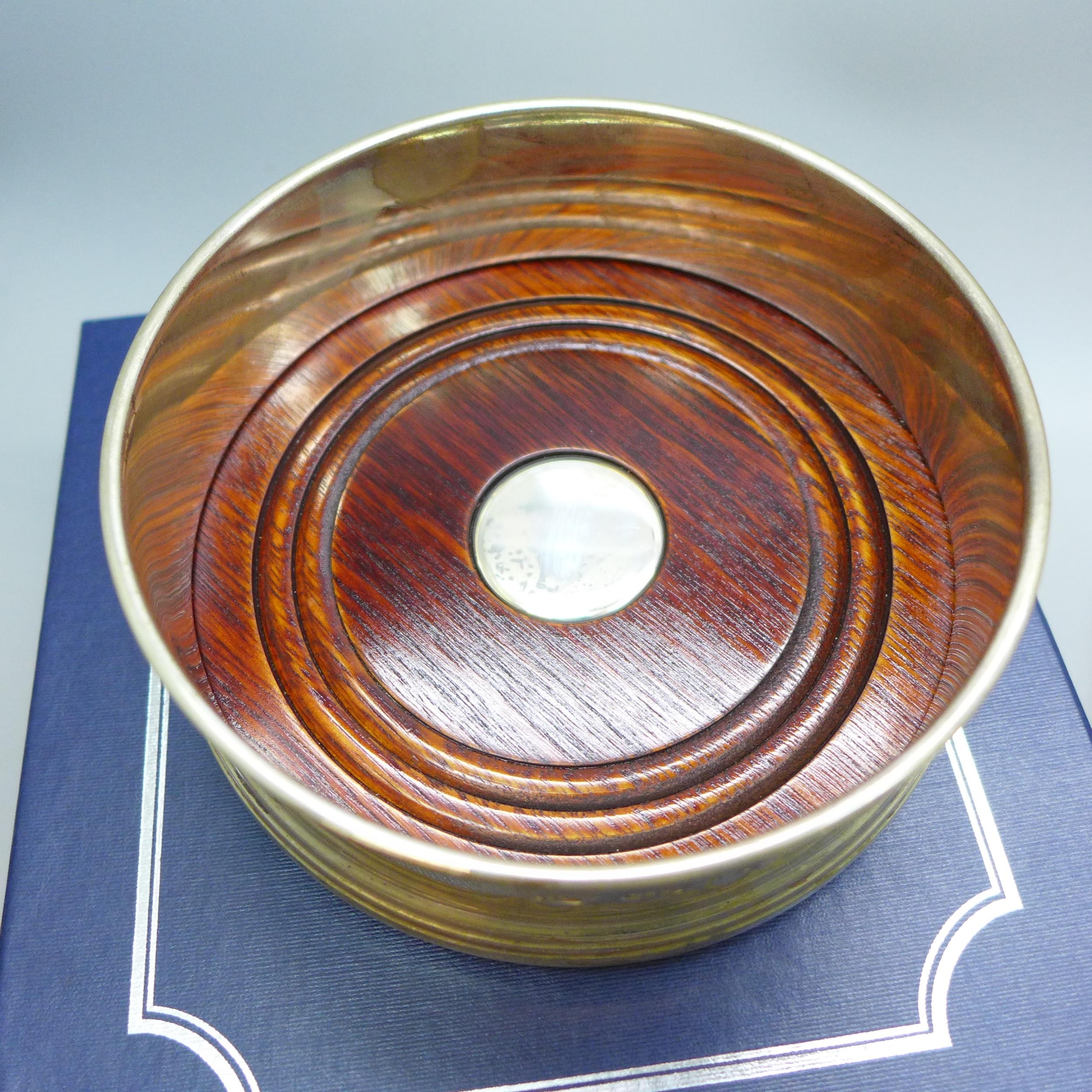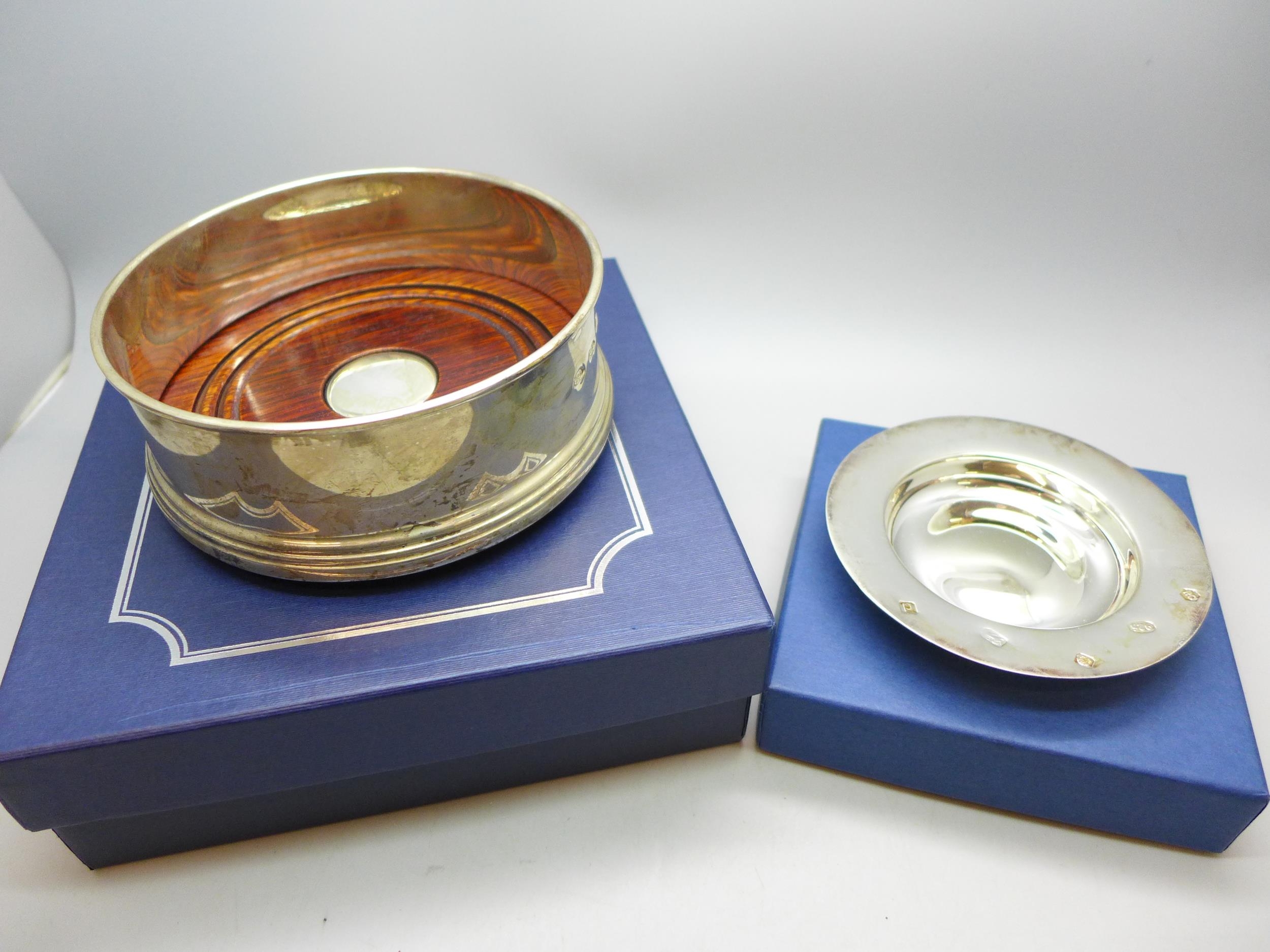 A silver dish, 10cm, 58g, and a silver and turned wood bottle coaster, 12cm