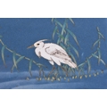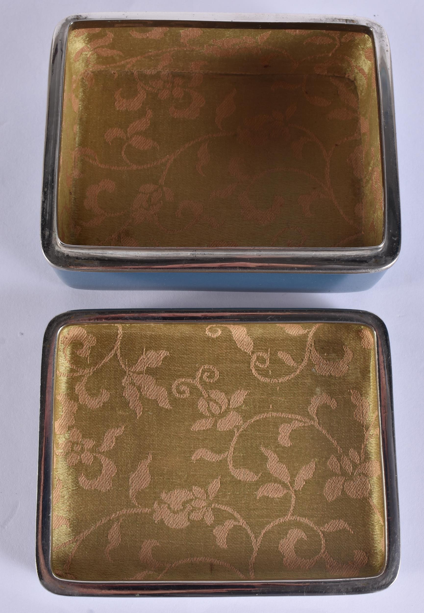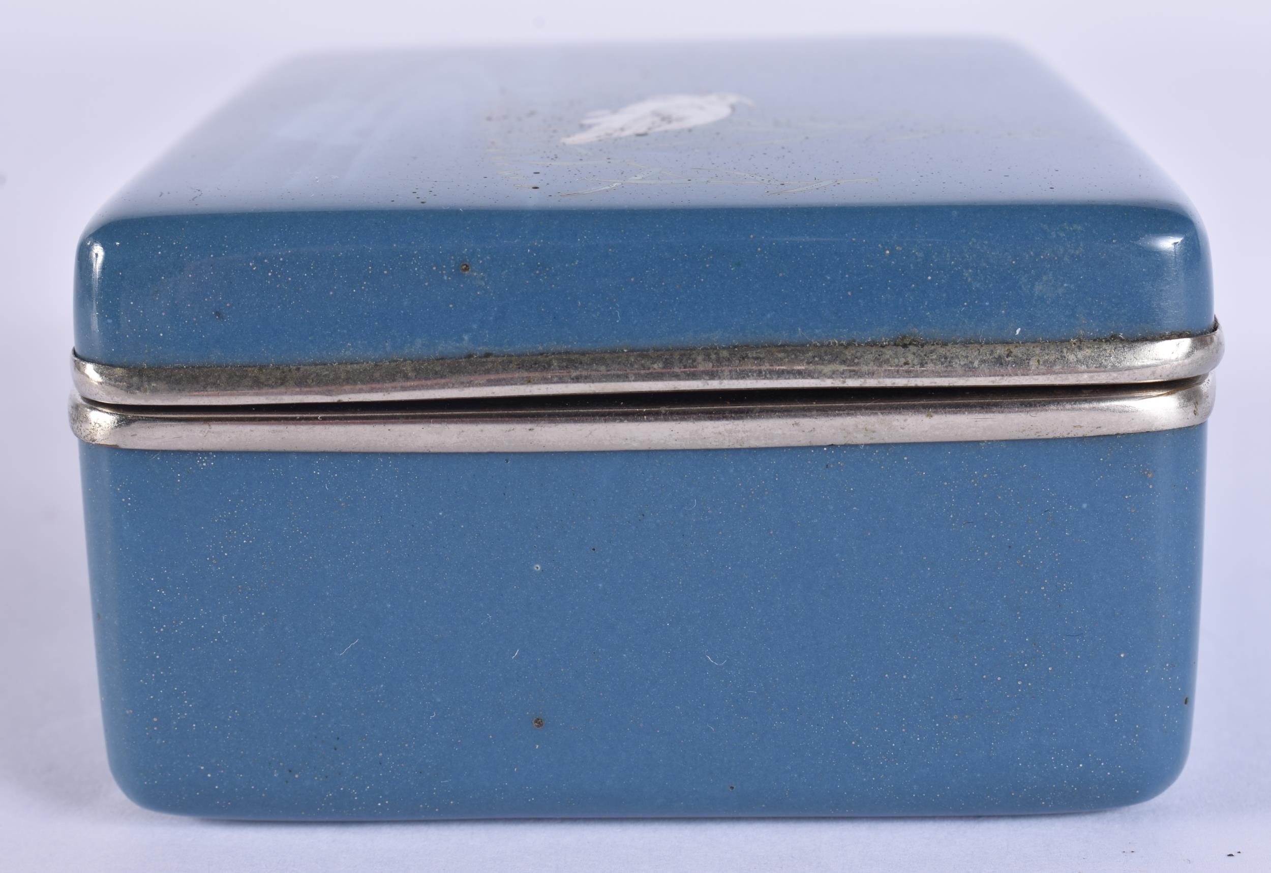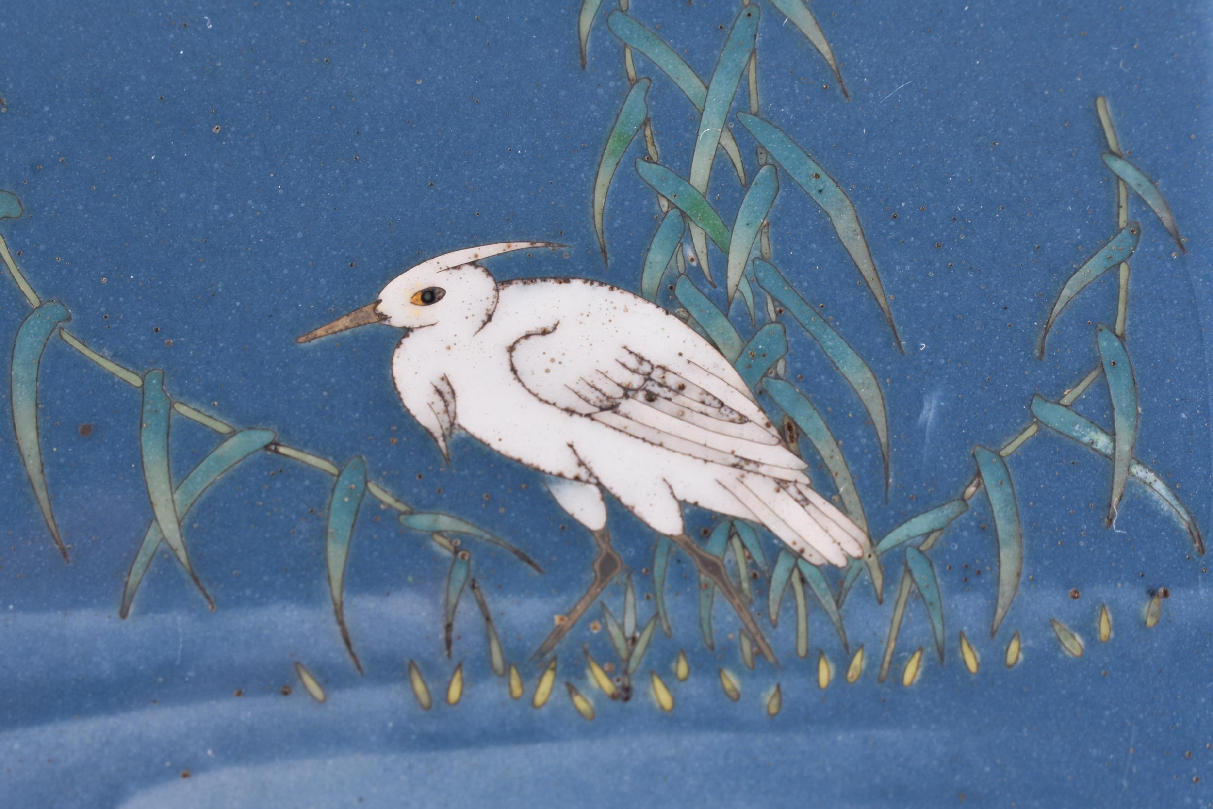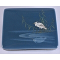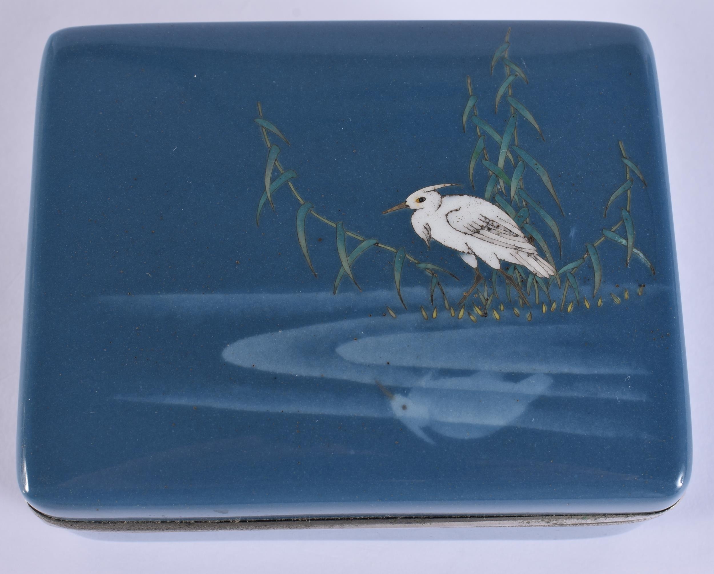 AN EARLY 20TH CENTURY JAPANESE MEIJI PERIOD CLOISONNE ENAMEL BOX AND COVER decorated with a bird mirrored within a lake. 10 cm x 8 cm.