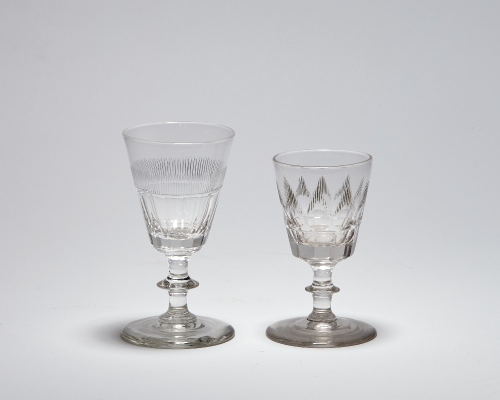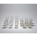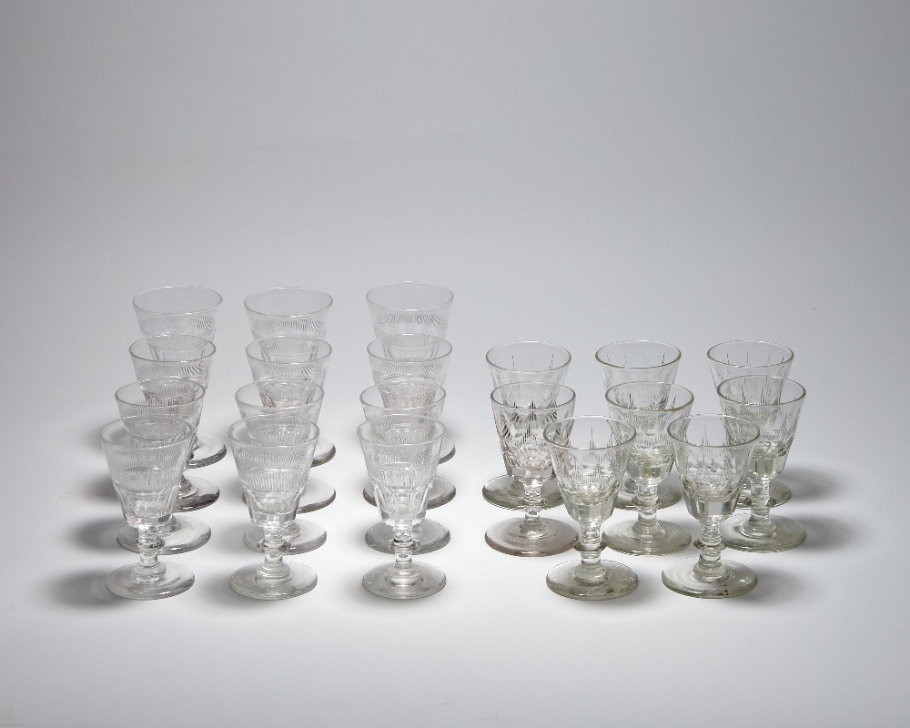 Eight Regency / early Victorian port glasses, with knopped stems, the bowls with cut circle and sunburst ornament, approx. 10.6cm high, together with twelve later similarly designed port glasses, in different sizes, the largest 12.4cm high (20)