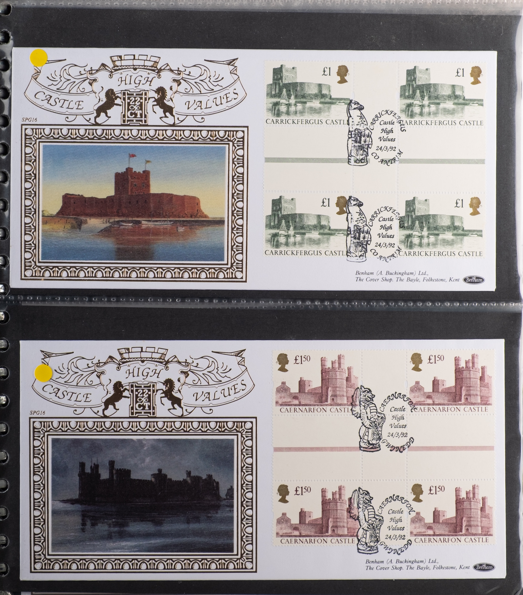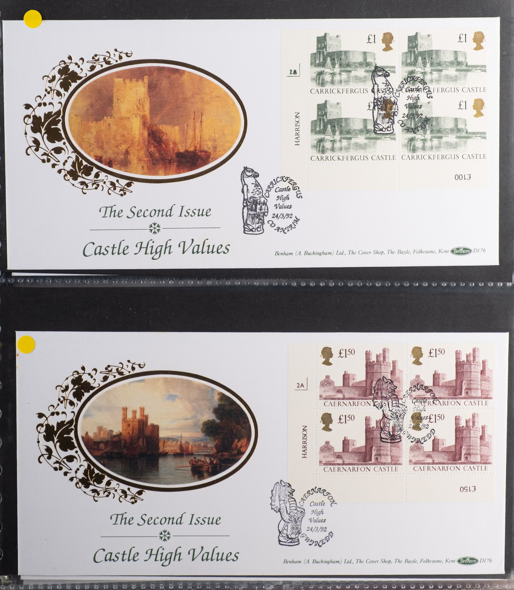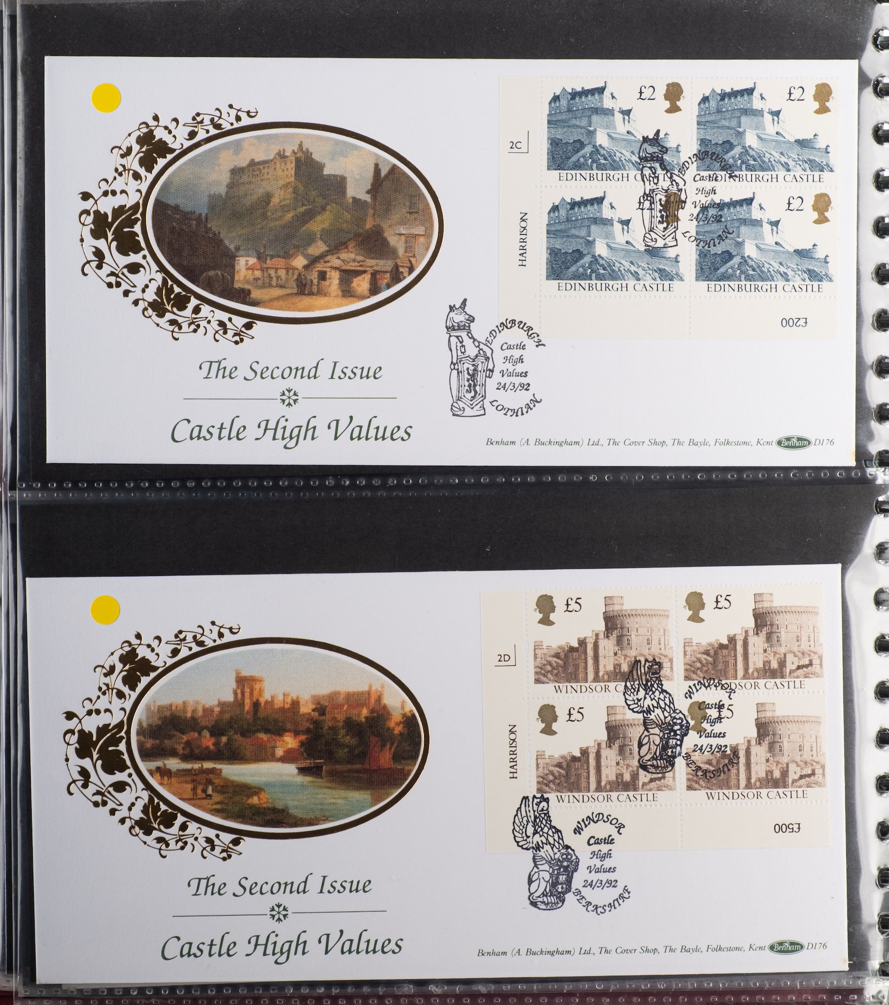 Great Britain. A collection of mostly better QEII First Day Covers in three albums, including 32 x Castle High Value covers, with blocks, Gutter Pairs, 22ct Benhams etc.