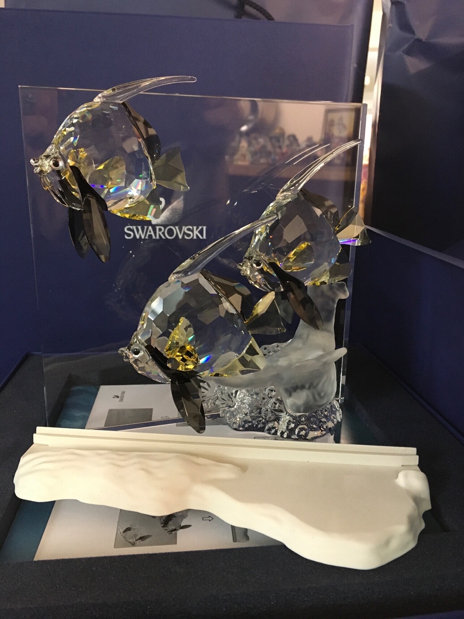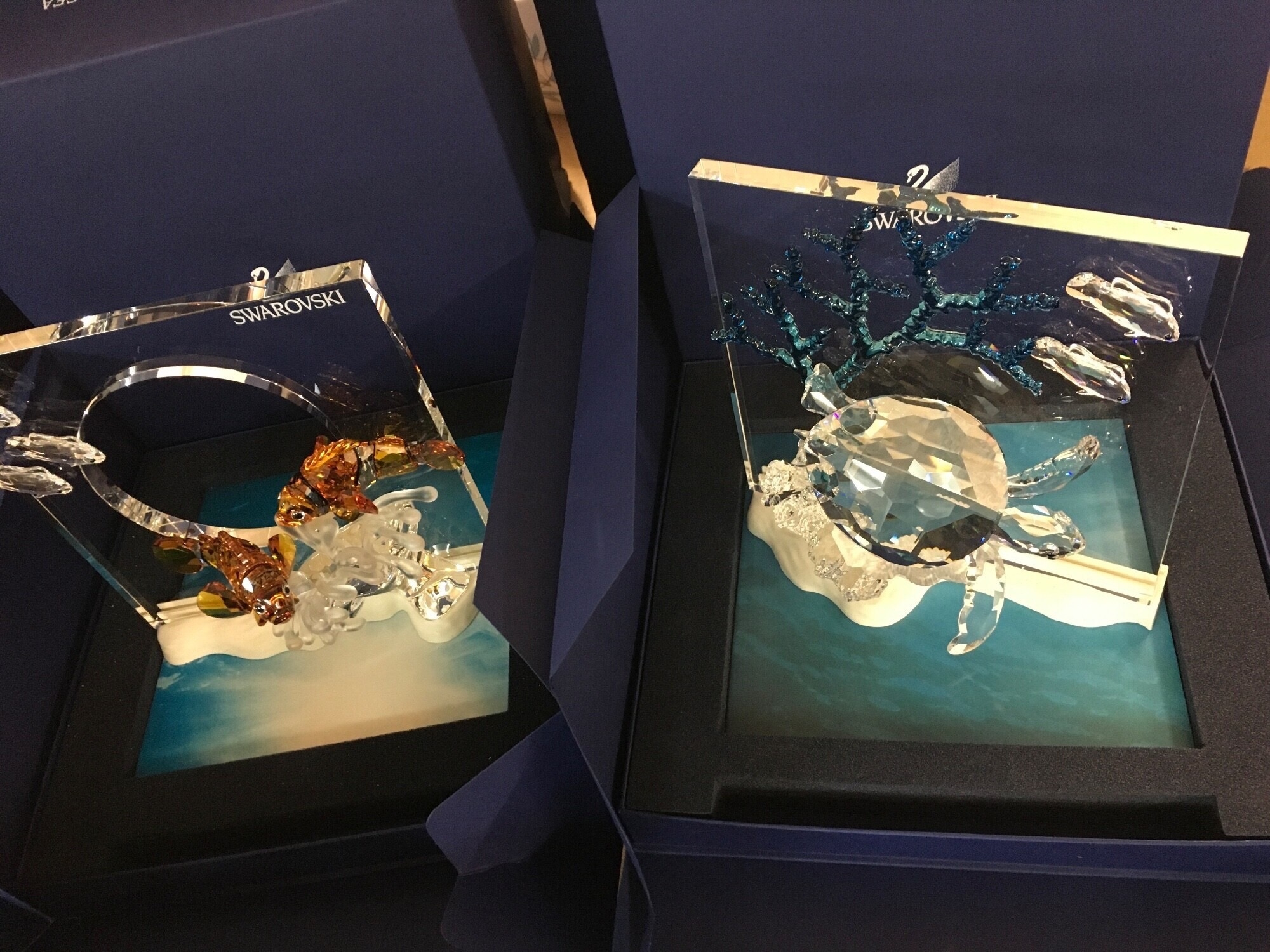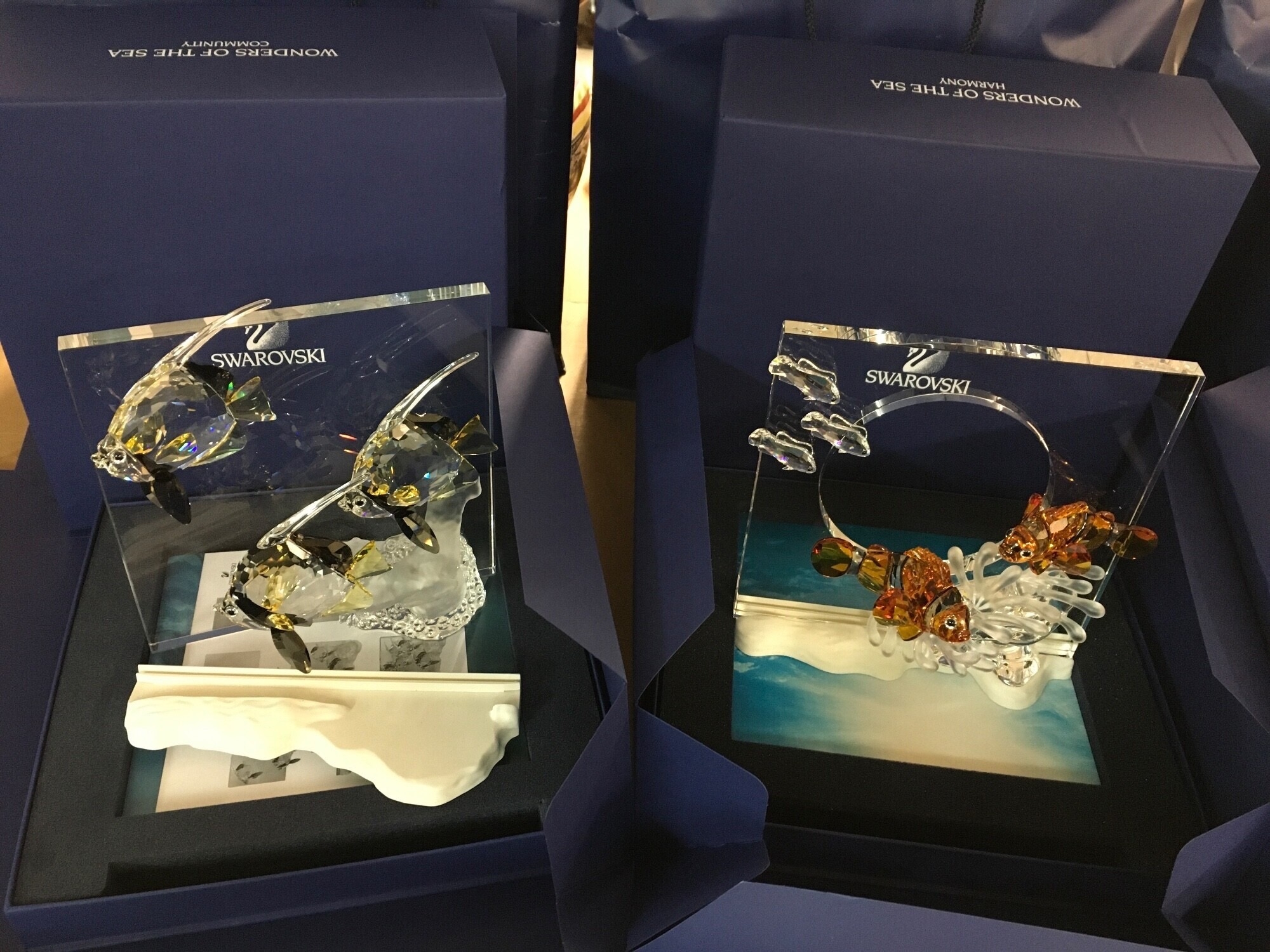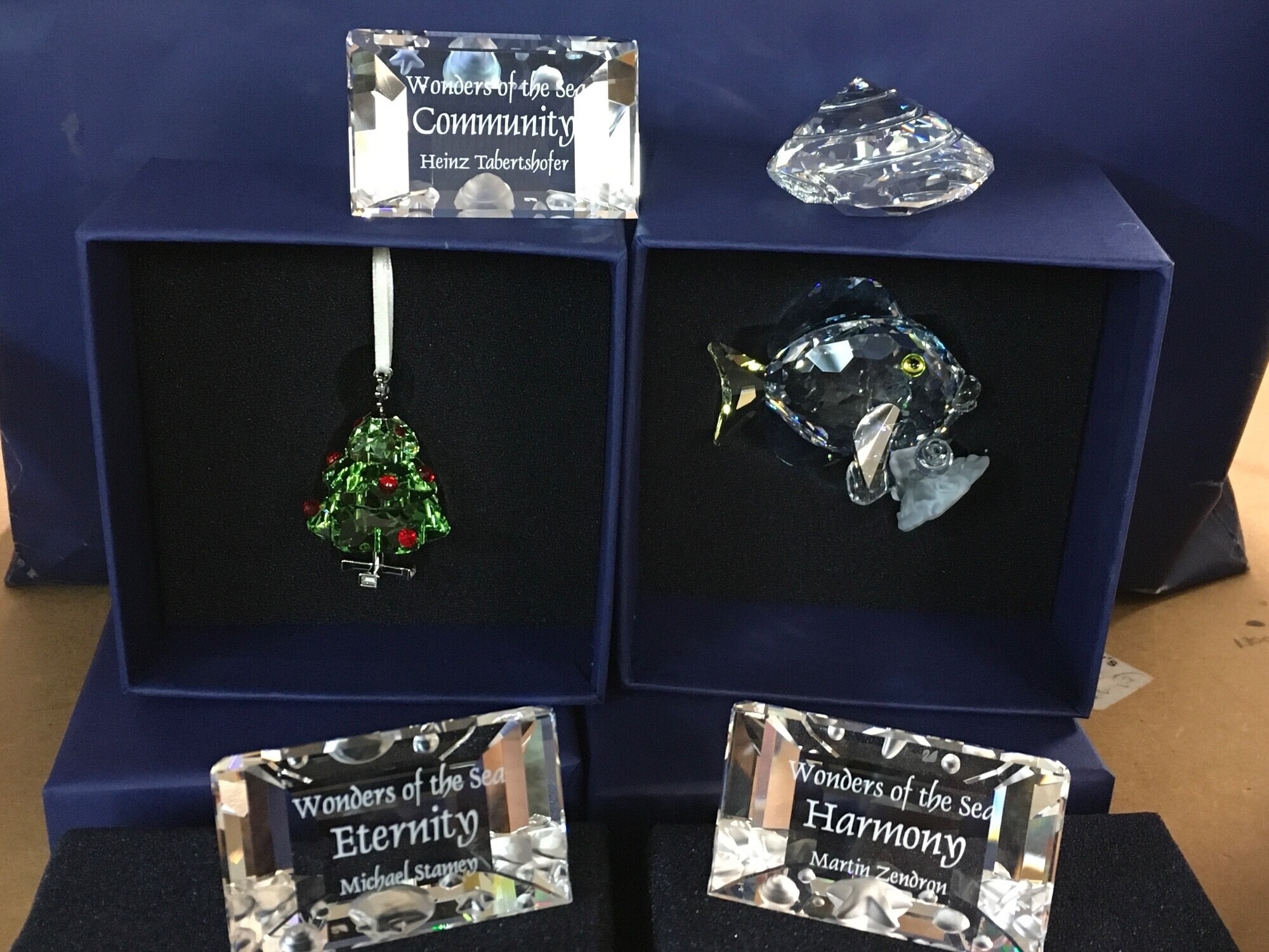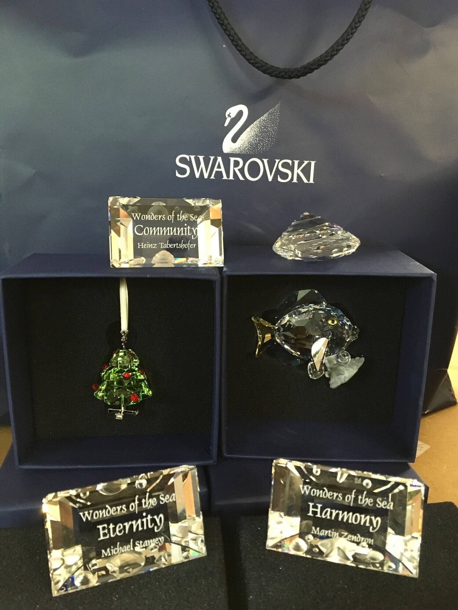 Swarovski Wonders Of The Sea boxed Trio- including Community, Harmony and Eternity. Together with three boxed Wonders of The Sea Title plaque paperweights, a figure of a fish and a Christmas Tree ornament. No obvious damage or restoration