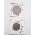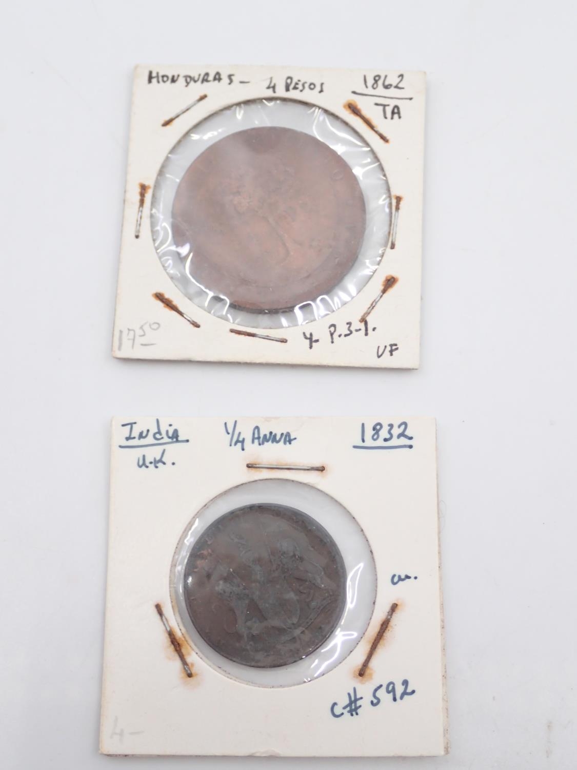 Two coins: Honduras 4 Peso dated 1862 & India 1/4 Anna dated 1832