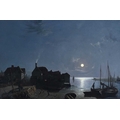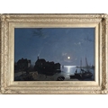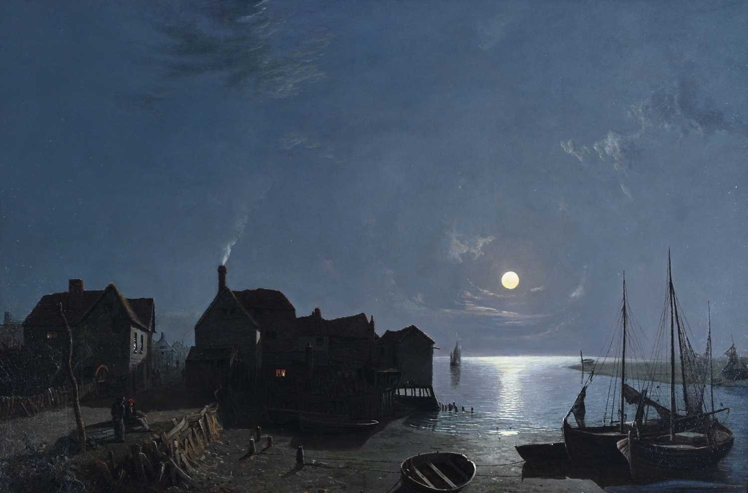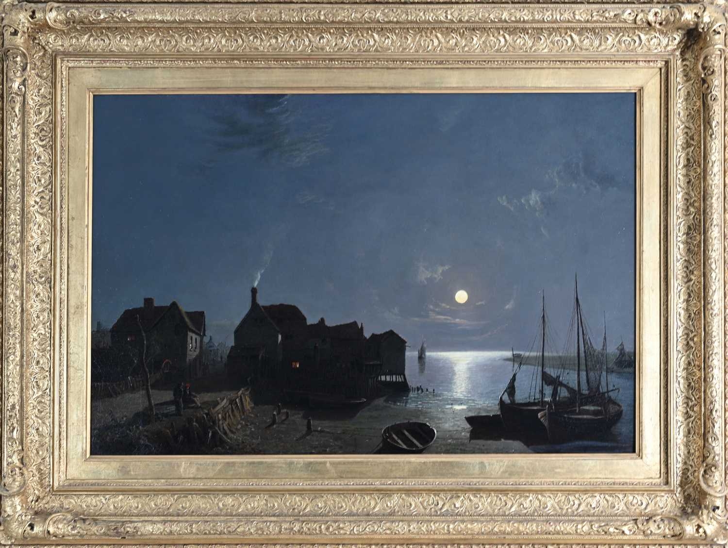 Henry Pether (British, 1800-1880), a moonlit estuary, moored fishing boats, and figures on a harbour in the foreground, signed and dated 1851 l.r., oil on canvas, 60 by 90cm, gilt frame. Note: typical of the celebrated 'Moonlight Pethers', the scene depicted is possibly the Thames Estuary. Provenance: a Private Collection, Cotswolds