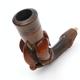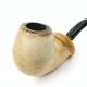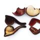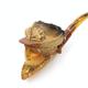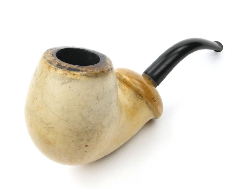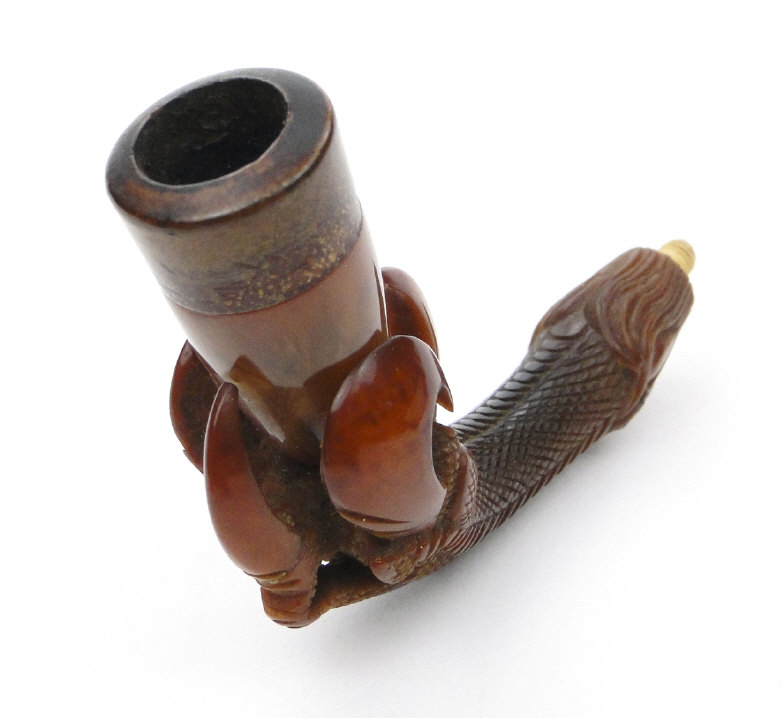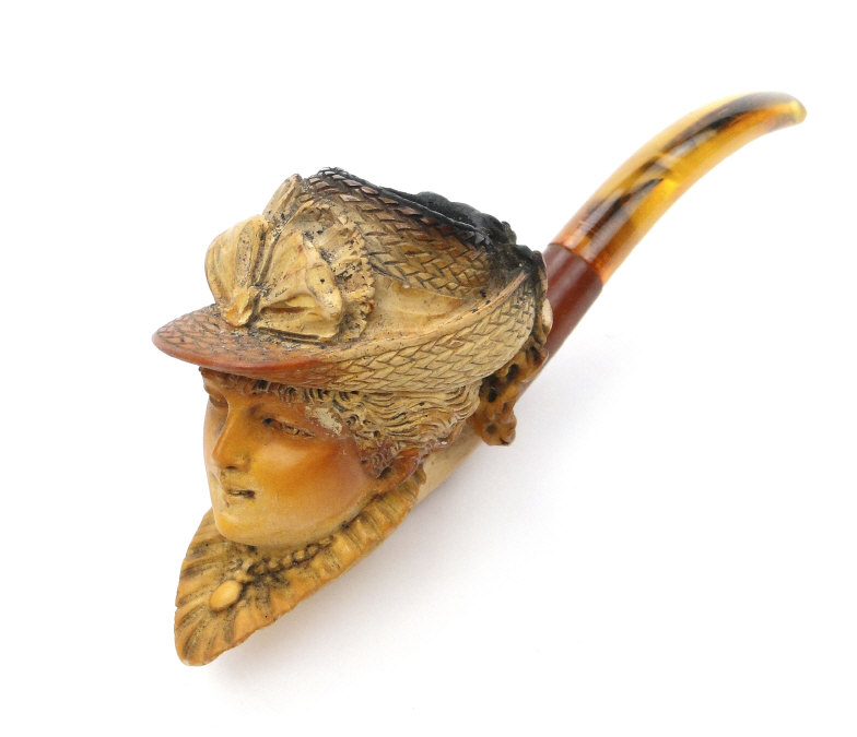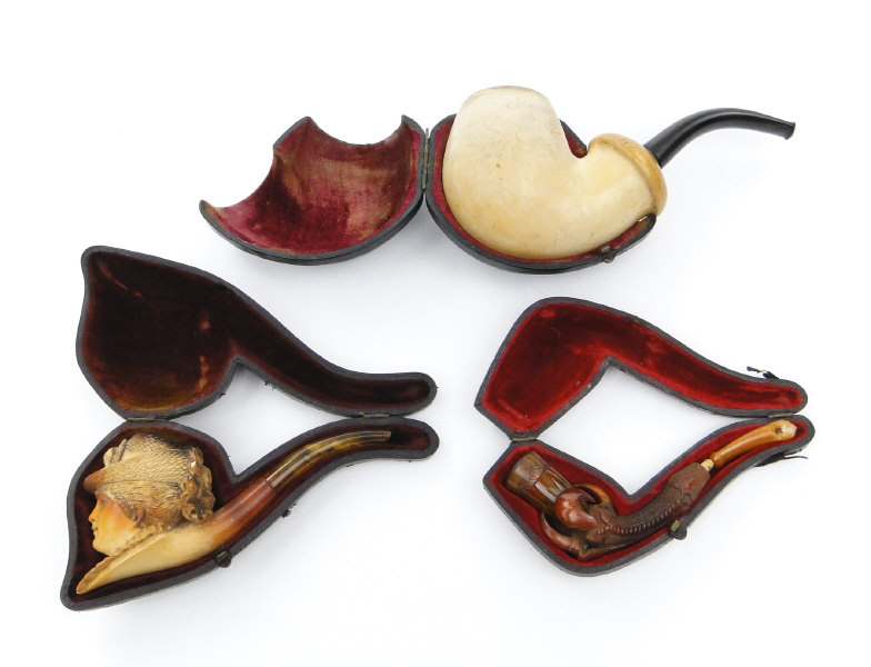 Three leather cased meerschaum pipes comprising a bulbous example, a bird's talon and a female bust, the larger 16cm in length