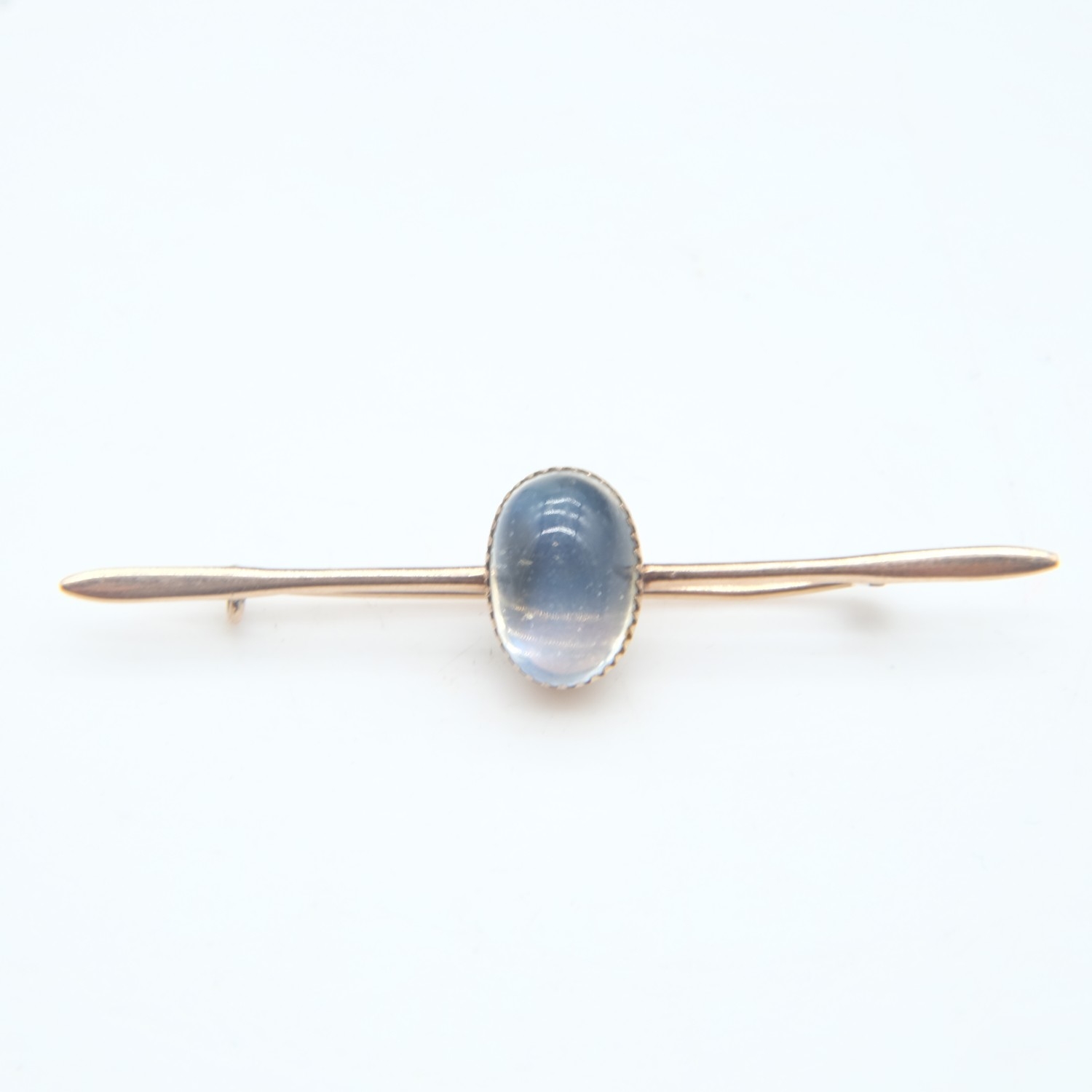 9ct rose gold and moonstone bar brooch, L: 50 mm, 2.1g. UK P&P Group 0 (£7+VAT for the first lot and £1+VAT for subsequent lots)