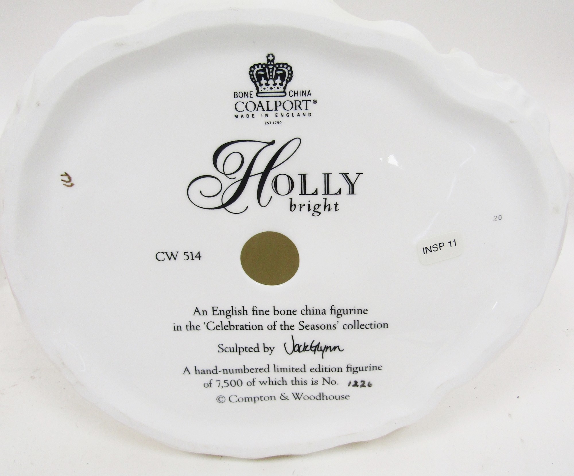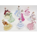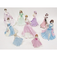Nine Coalport bone china figures of ladies, comprising Holly Bright from the Celebration of the Seasons collection, limited edition 1226/7500, printed black marks for Compton & Woodhouse, 23cm high, a figure of Sentiments Coming of Age, Classical Elegance Forever Yours, Sentiments Good Luck and Ladies of Fashion Josephine, Sentiments Picked Specially for You, Special Occasion, Special Celebration and Birthday Wishes, various printed black marks and painted letters (9)