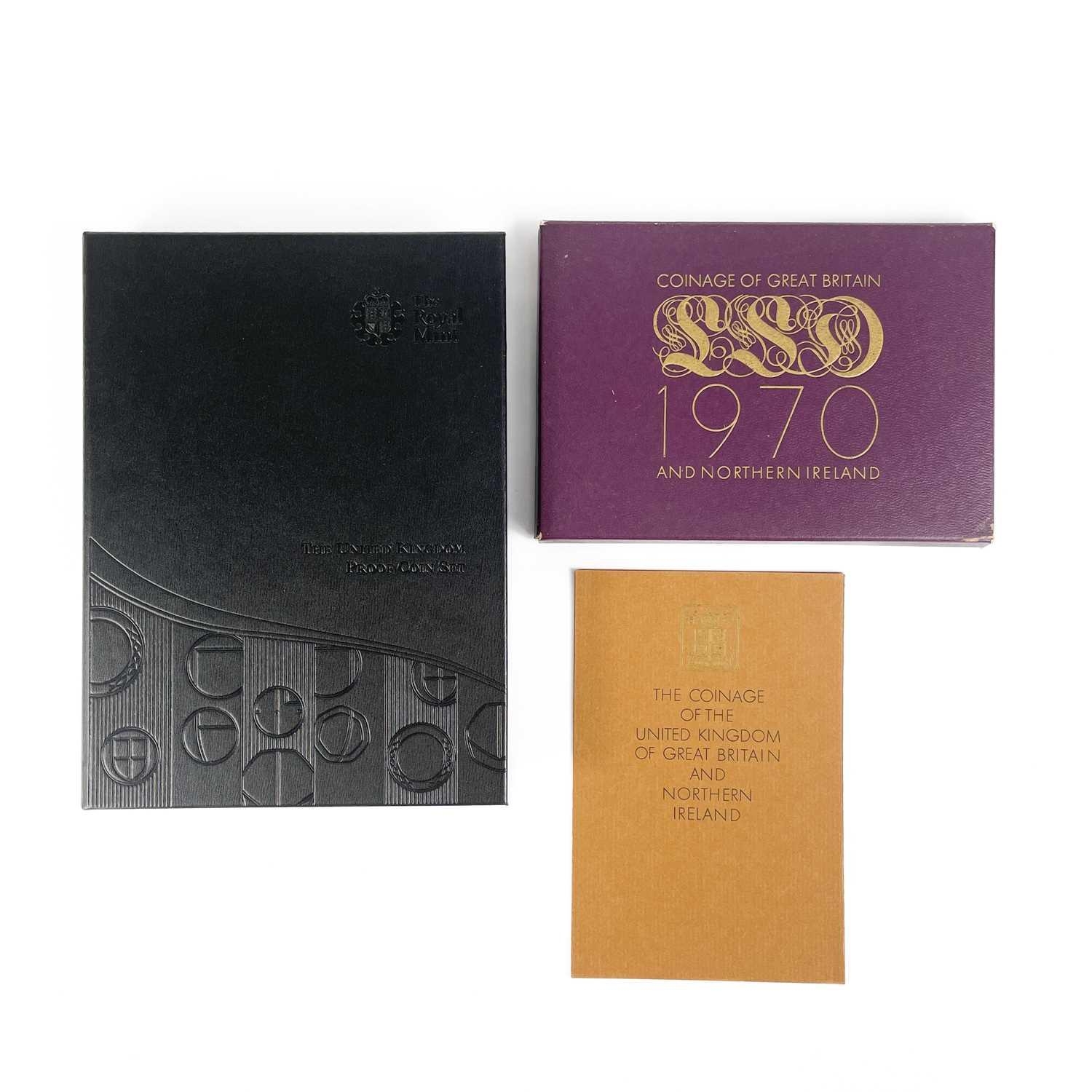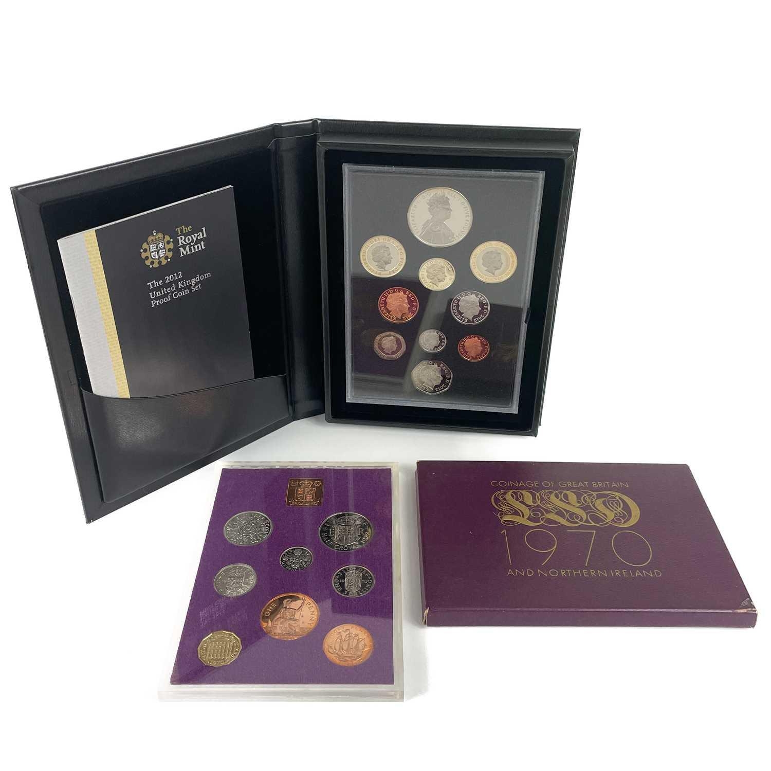 Royal Mint 1970 and 2012 UK Proof coin sets. Comprising. 1. A 1970 last pounds shillings pence proof set of eight coins from 1/2d to half crown in bright, untoned condition. 2. A 2012 UK proof coin set from 1P to £5 in box of issue. Coins are in bright, untoned condition.