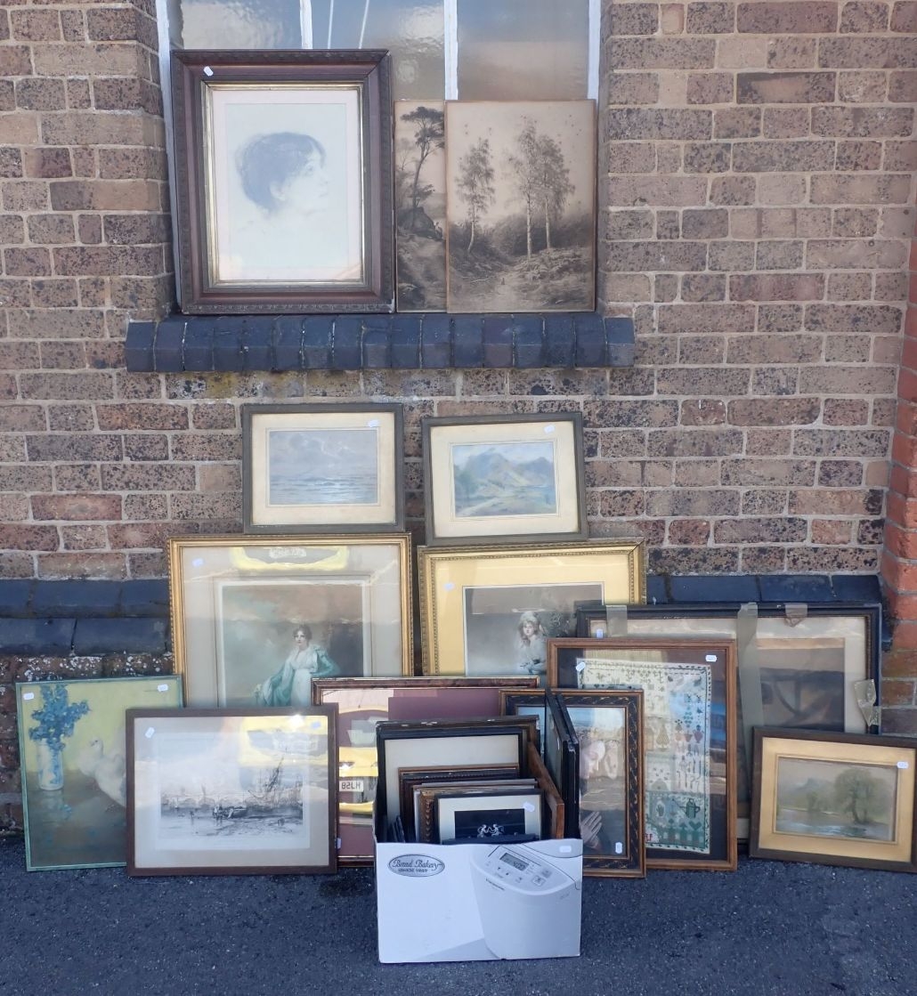 A COLLECTION OF PICTURES AND PRINTS including a mezzotint after Raeburn, another similar, a modern sampler, photographs (inc. signed Sacha Distel) and other items