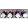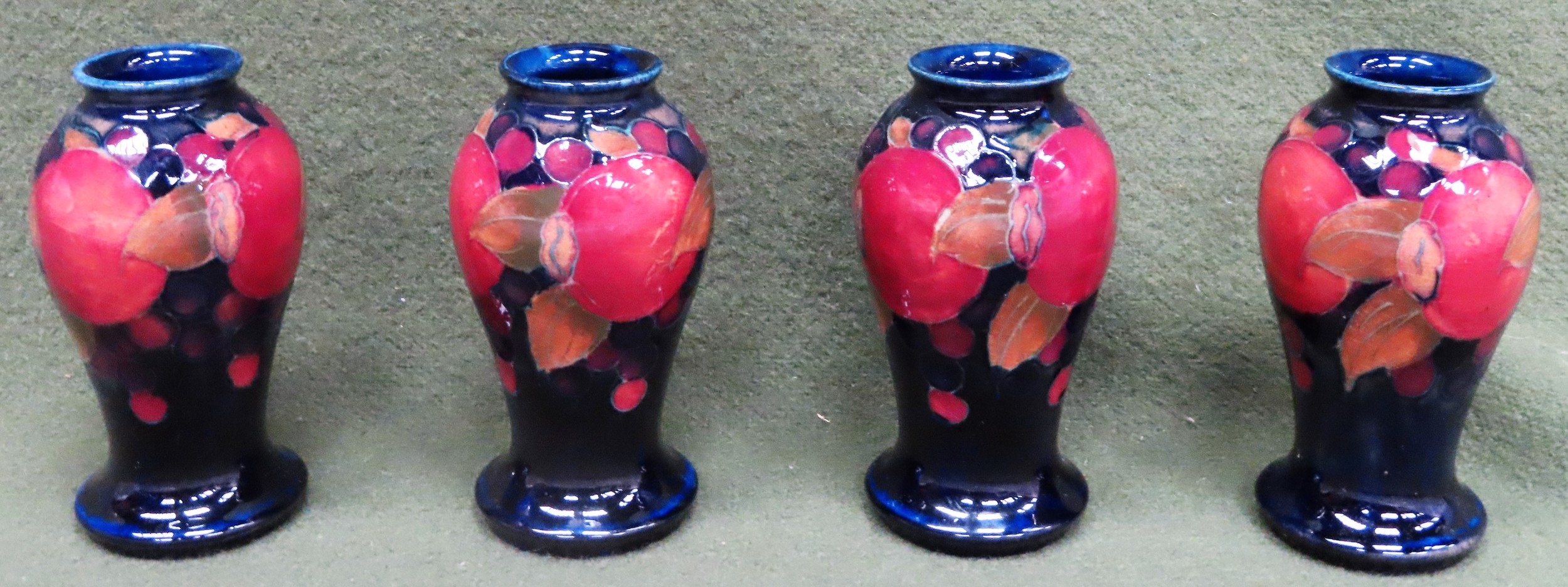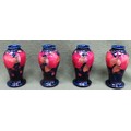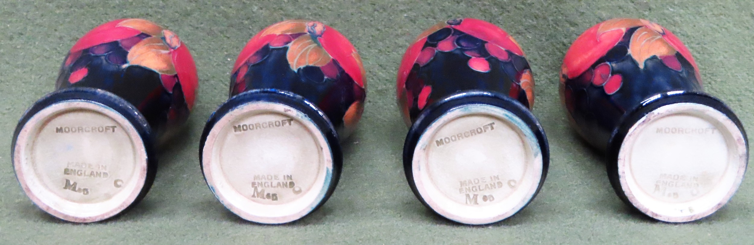 Set of four Moorcroft tube lined 'Pomegranate' pattern glazed ceramic vases, all stamped 'M45'. Approx. 9.5cms H