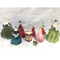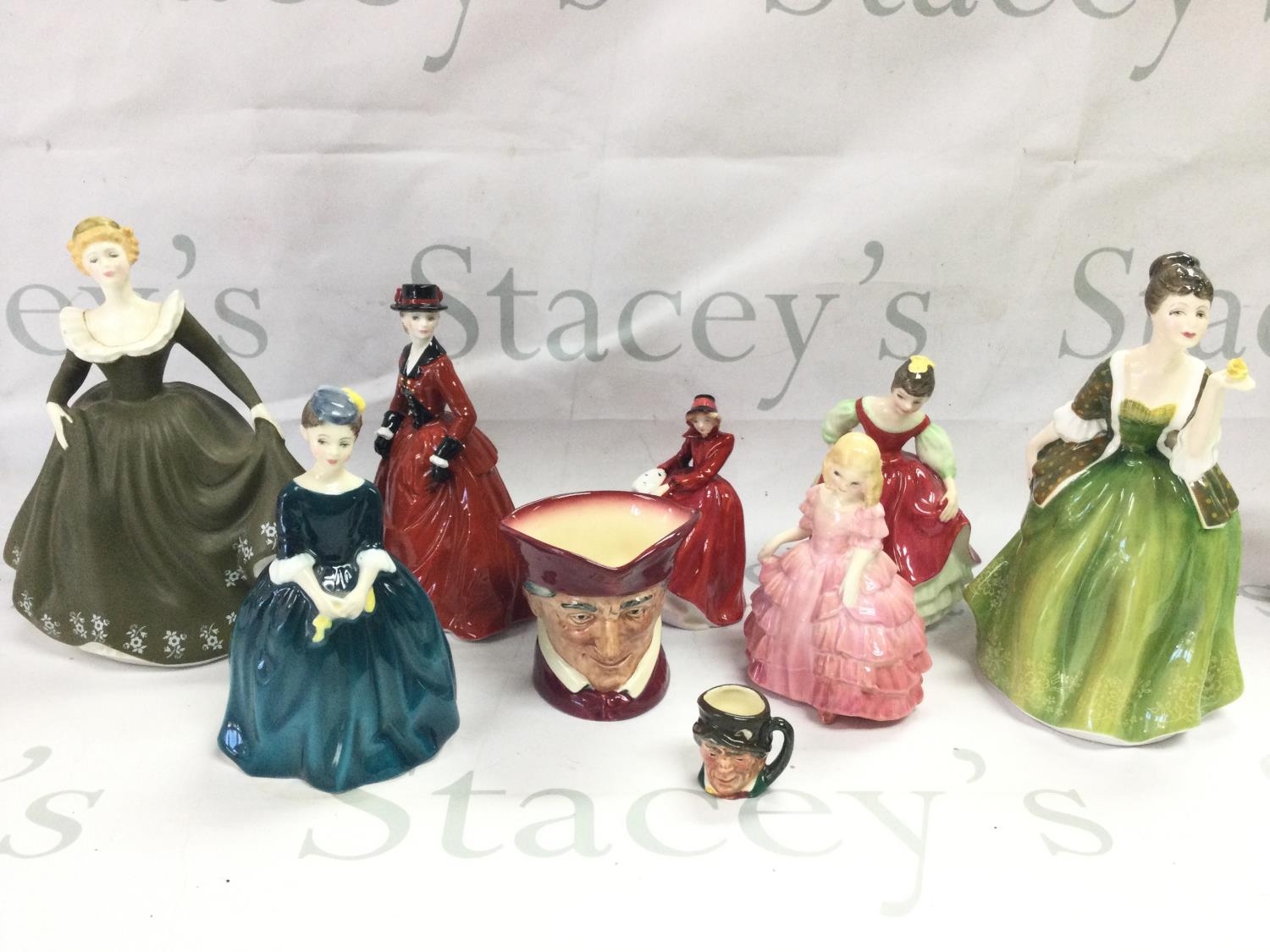 A collection of Royal Doulton and Worcester porcelain figures including Fleur, Cherrie, Fair Maiden, Rose (damaged) and character jugs. This lot cannot be posted