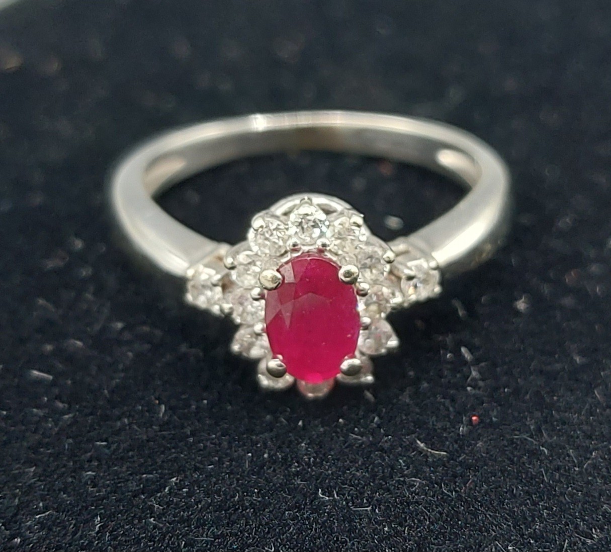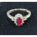 A 14ct gold ring set with a central oval Ruby surrounded by Diamonds with Diamond shoulders, 2.9gms, ring size K