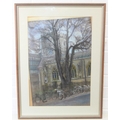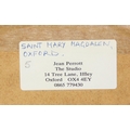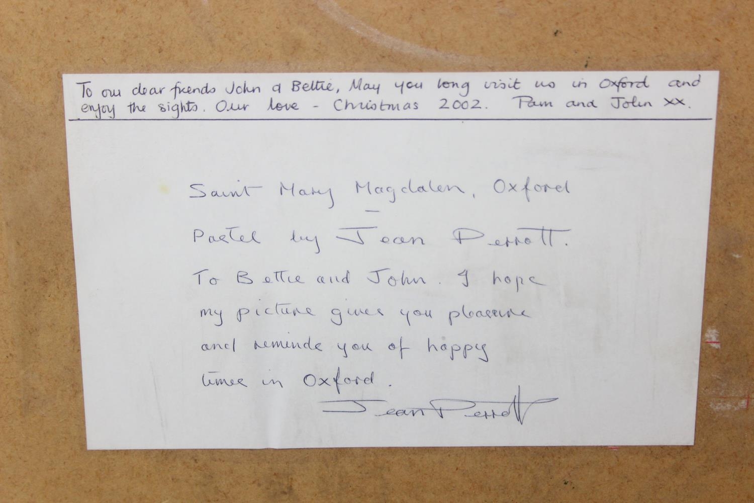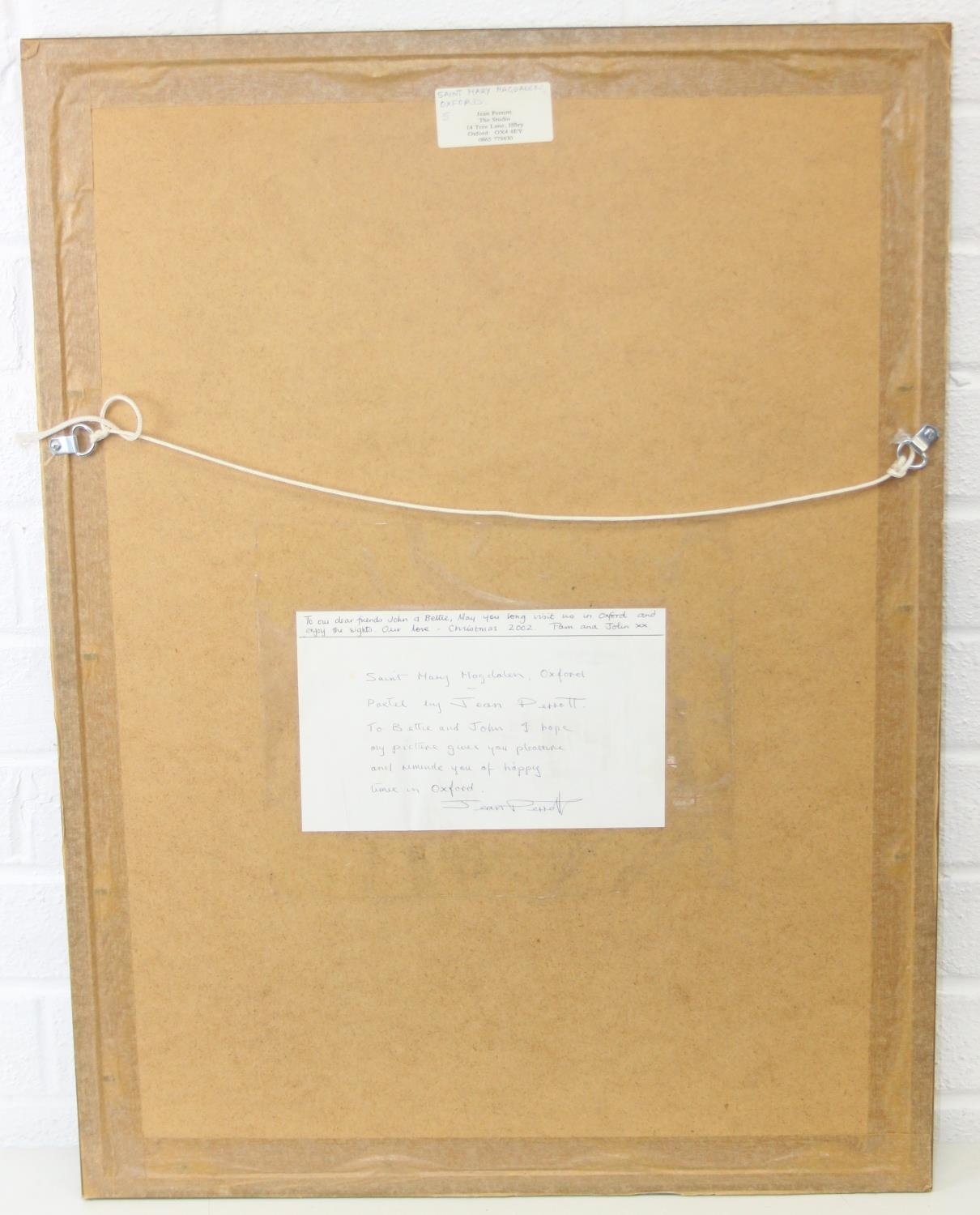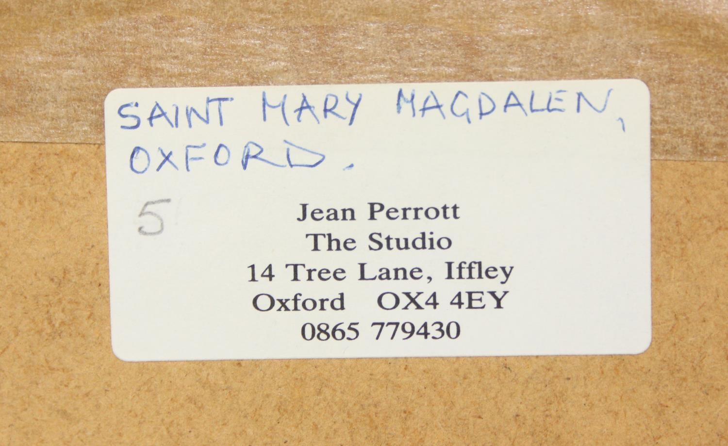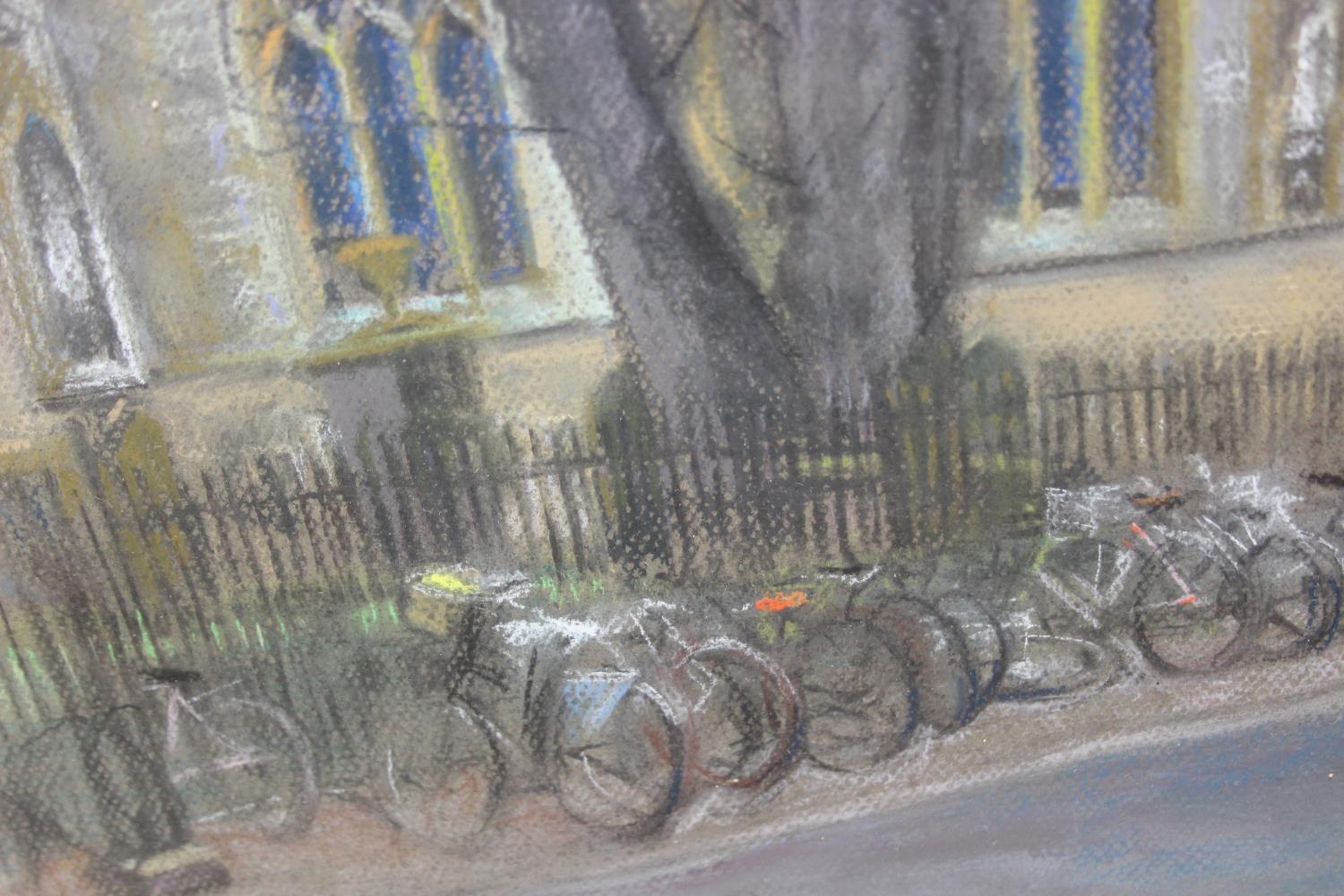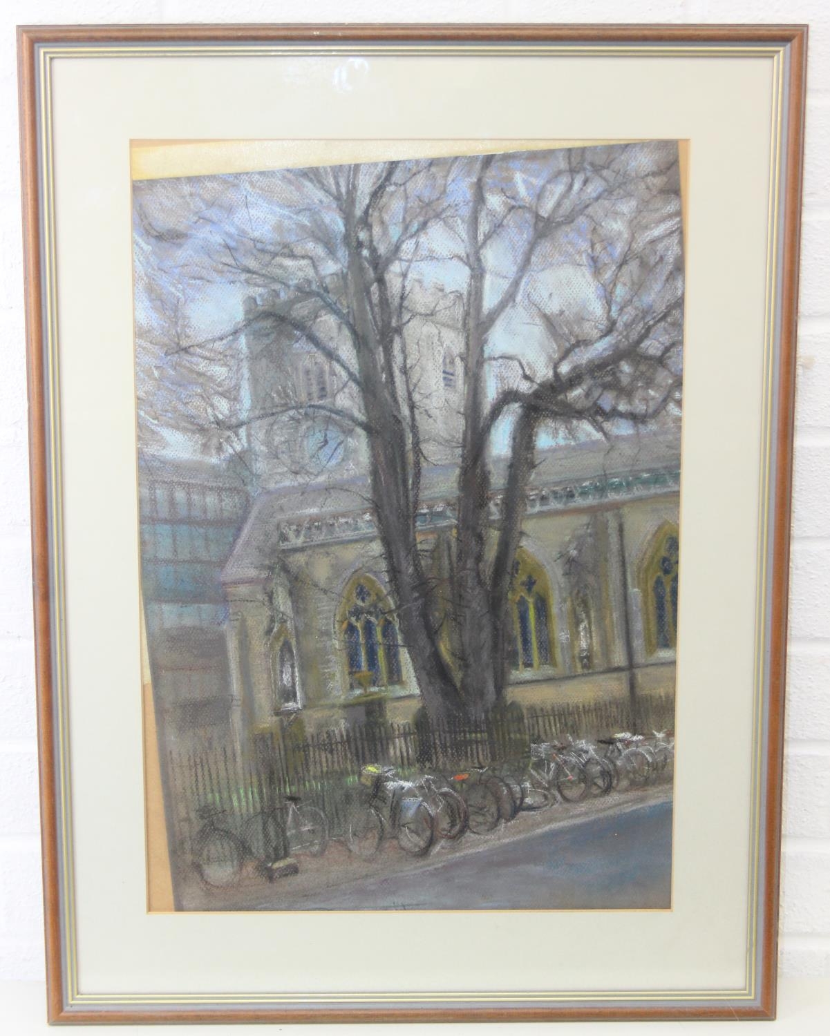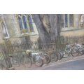 Jean Perrott (Oxford Artist, 20th century), a pastel artwork of St Mary Magdalen in Oxford with bicycles, seemingly unsigned but slipped in frame, various labels verso, 69cm x 51cm