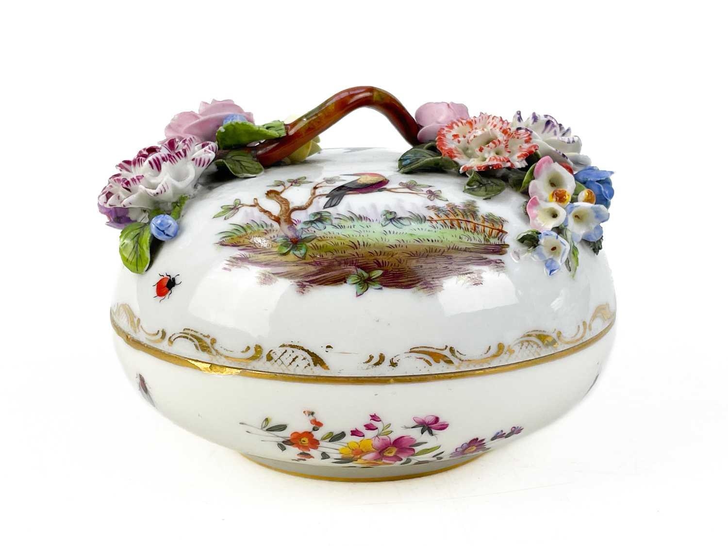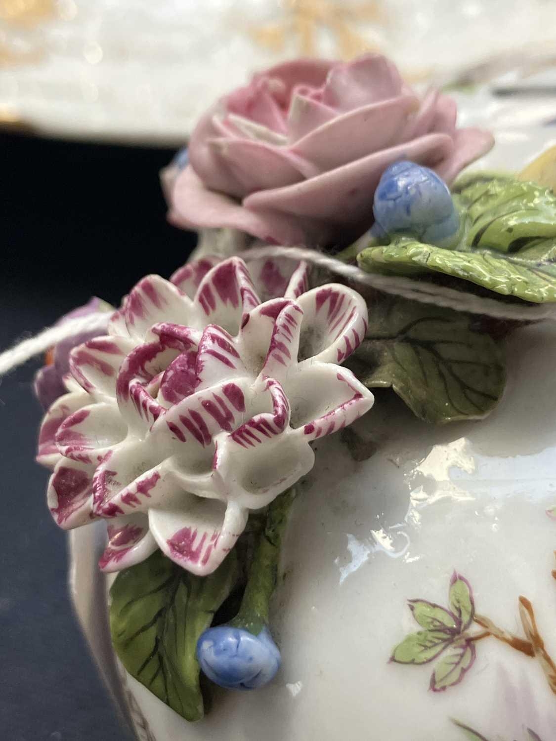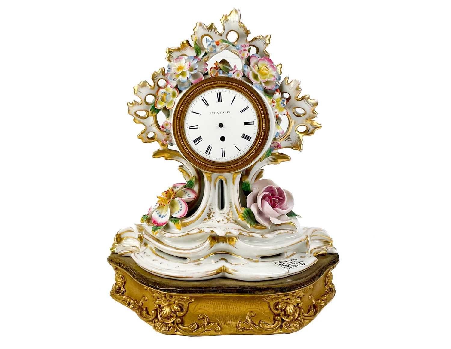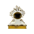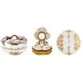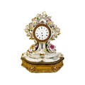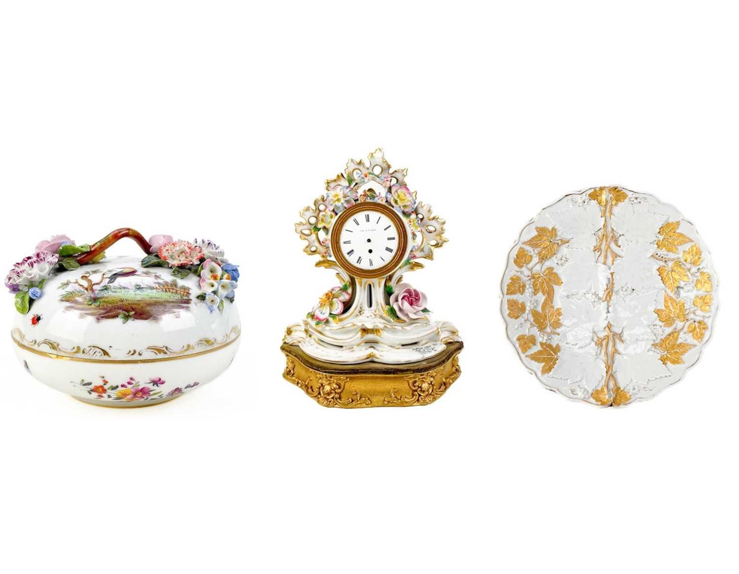 A French porcelain Jacob Petit style clock. With a watch movement by Thomas Woodward Gosport, height including stand 28cm, together with a German porcelain box and cover and a Meissen gilt vine plate. (3) Chips to inner foot rim of Meissen plate rubbing to gilt. Small chips to encrusted flowers on the clock and box. Images of affected areas online.