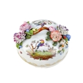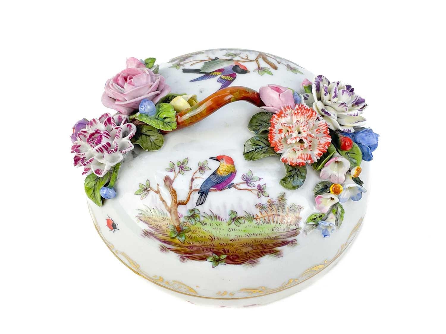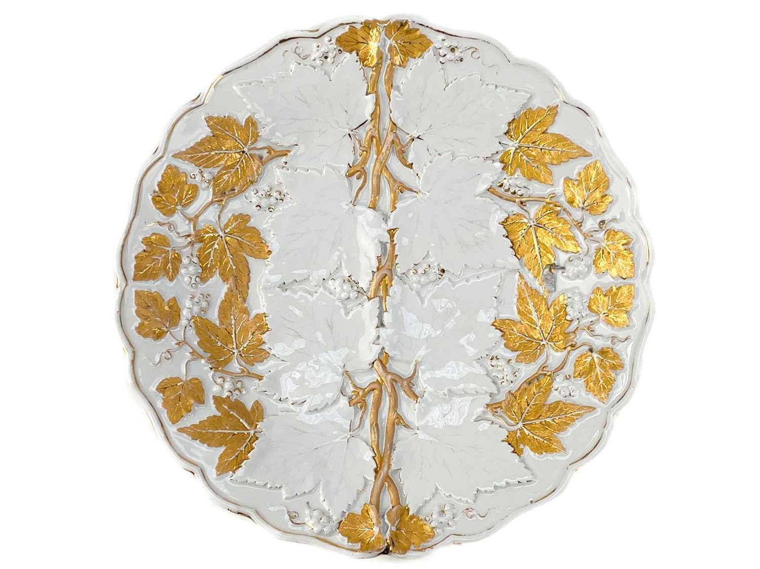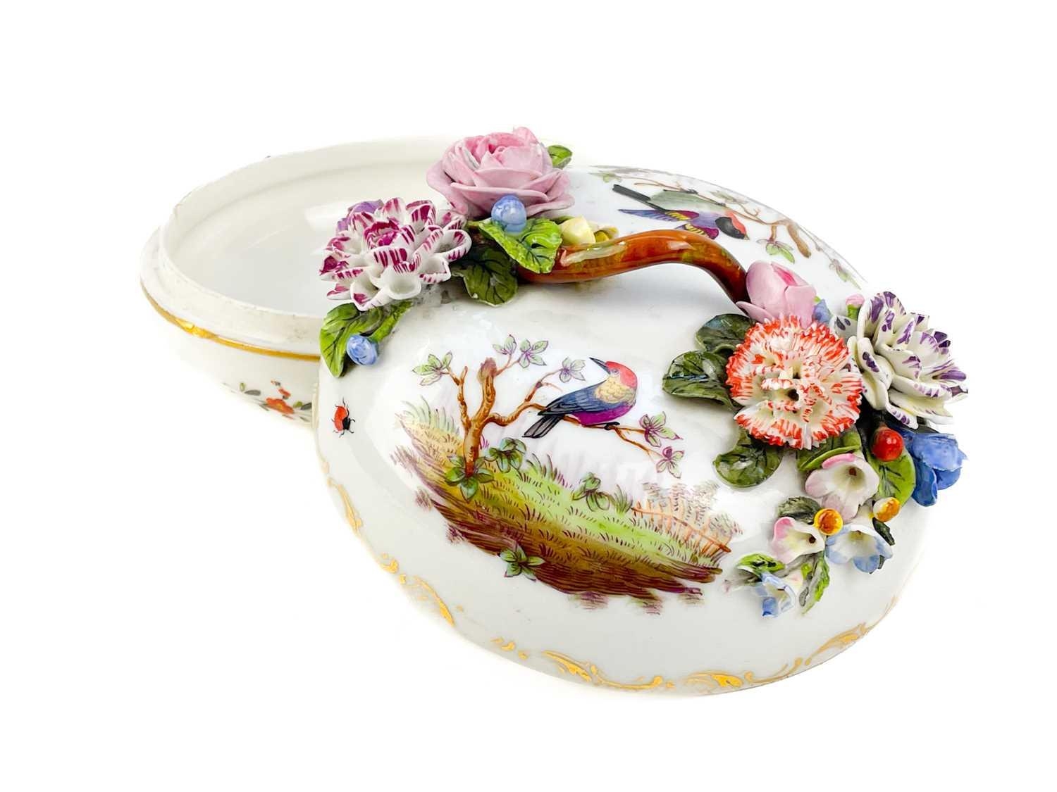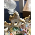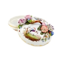 A French porcelain Jacob Petit style clock. With a watch movement by Thomas Woodward Gosport, height including stand 28cm, together with a German porcelain box and cover and a Meissen gilt vine plate. (3) Chips to inner foot rim of Meissen plate rubbing to gilt. Small chips to encrusted flowers on the clock and box. Images of affected areas online.