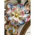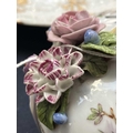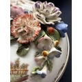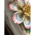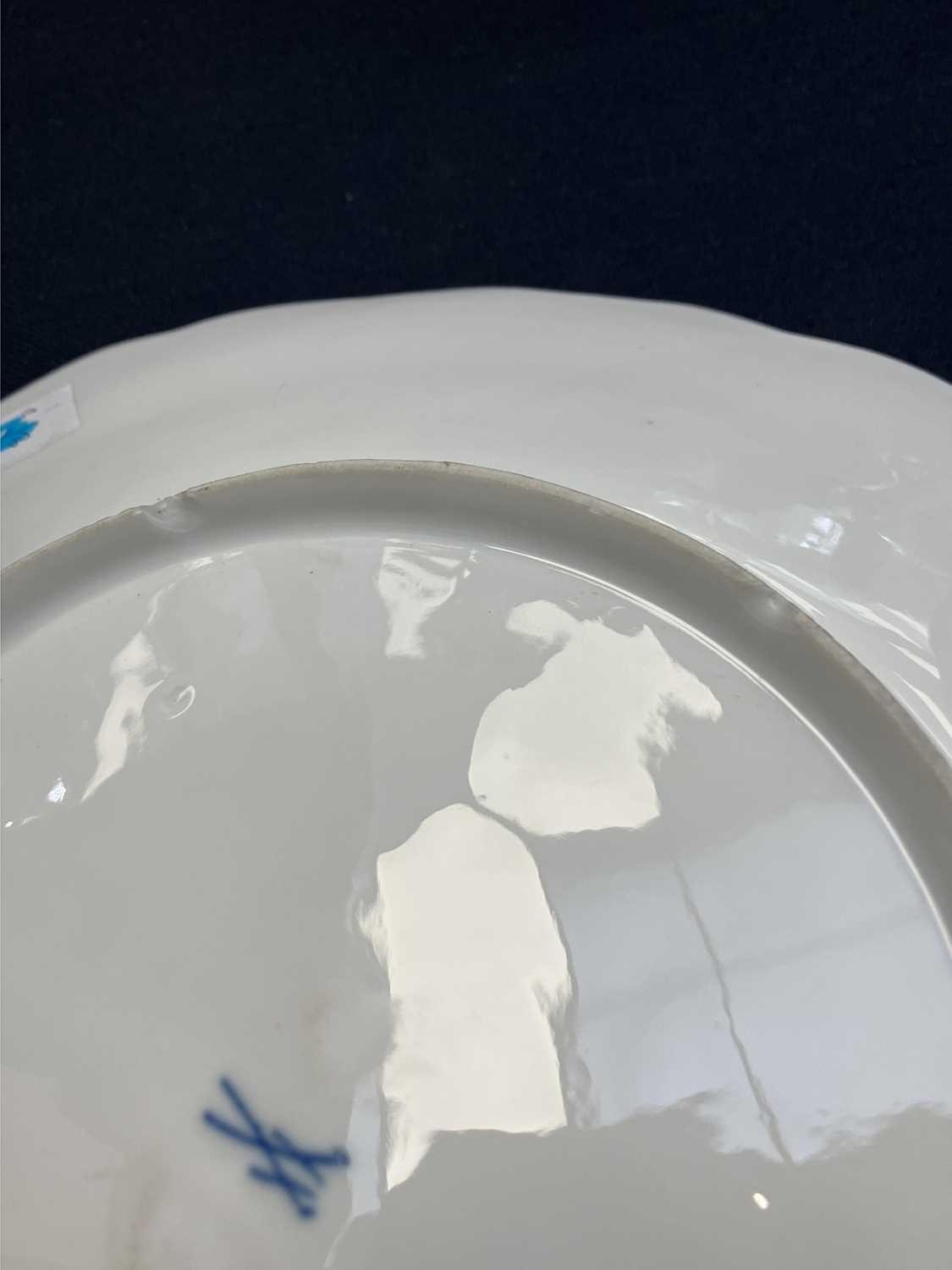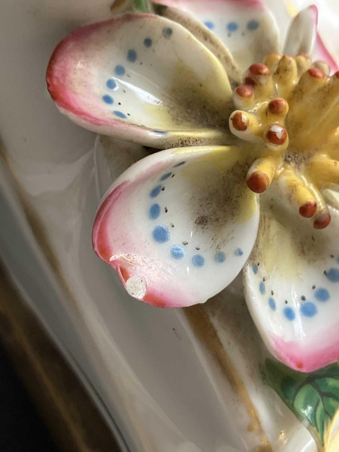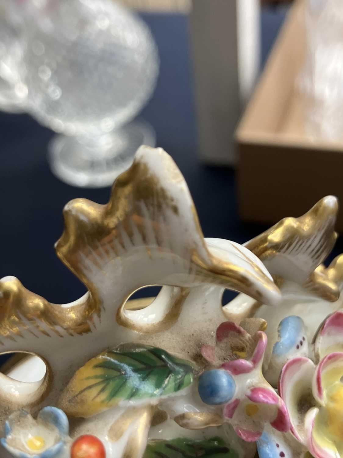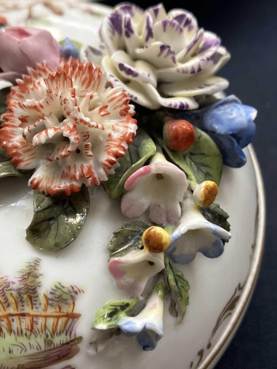 A French porcelain Jacob Petit style clock. With a watch movement by Thomas Woodward Gosport, height including stand 28cm, together with a German porcelain box and cover and a Meissen gilt vine plate. (3) Chips to inner foot rim of Meissen plate rubbing to gilt. Small chips to encrusted flowers on the clock and box. Images of affected areas online.