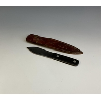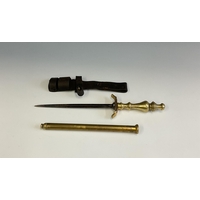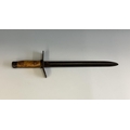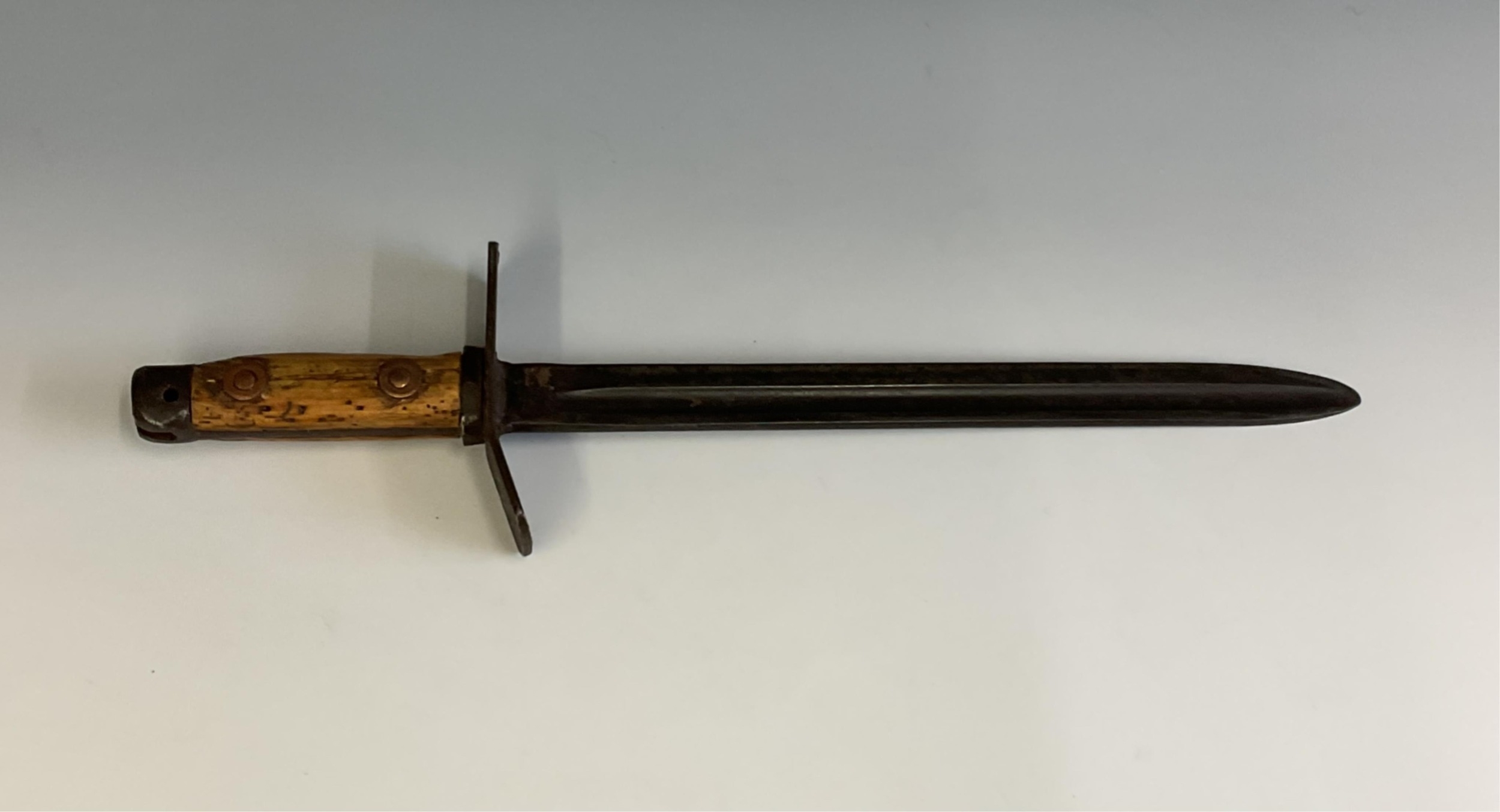 A WWI trench knife fashioned form a bayonet, 27.8cm blue blade, possible stamped 1917?, two part wooden grip, steel flattened crosspiece.