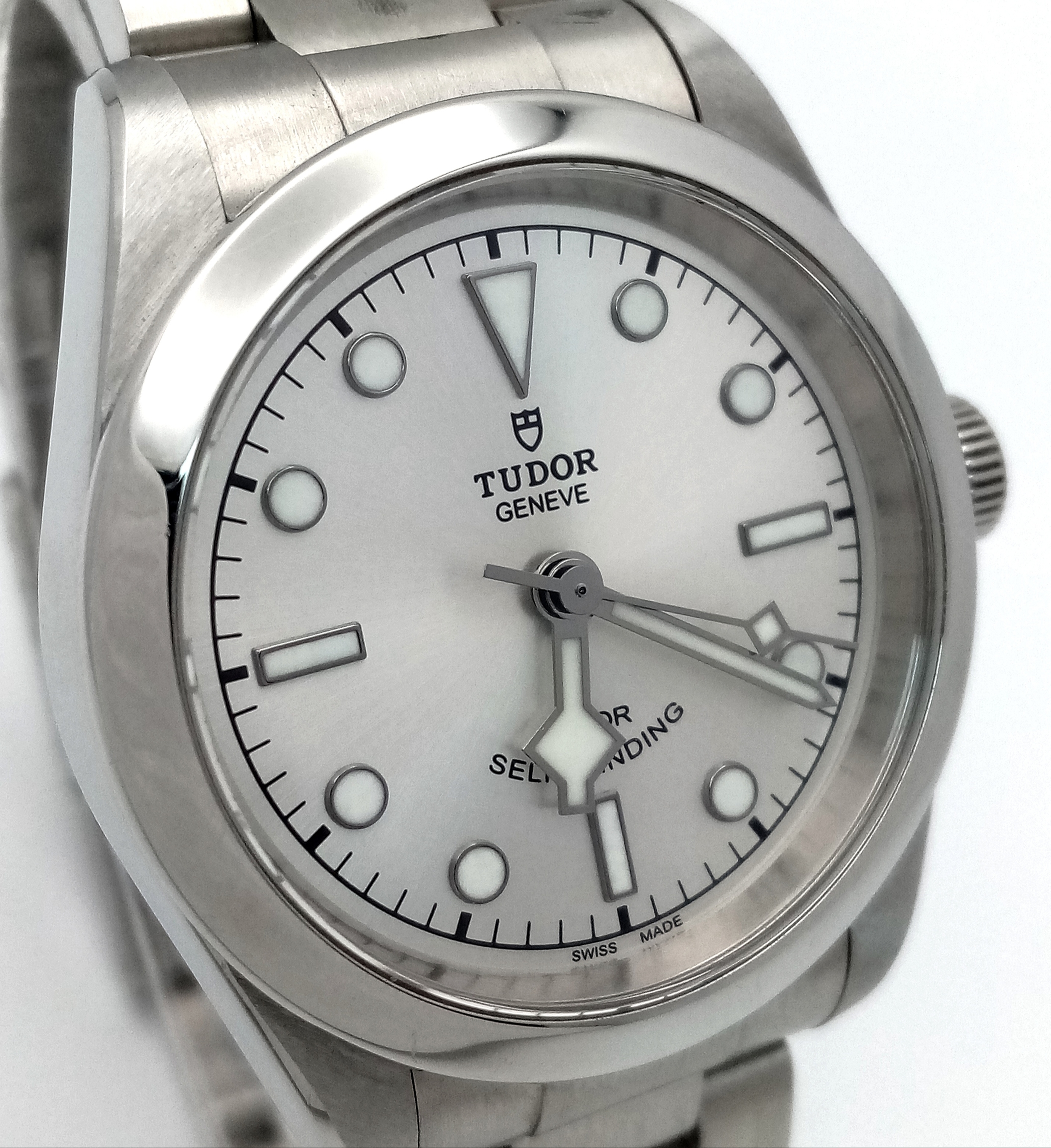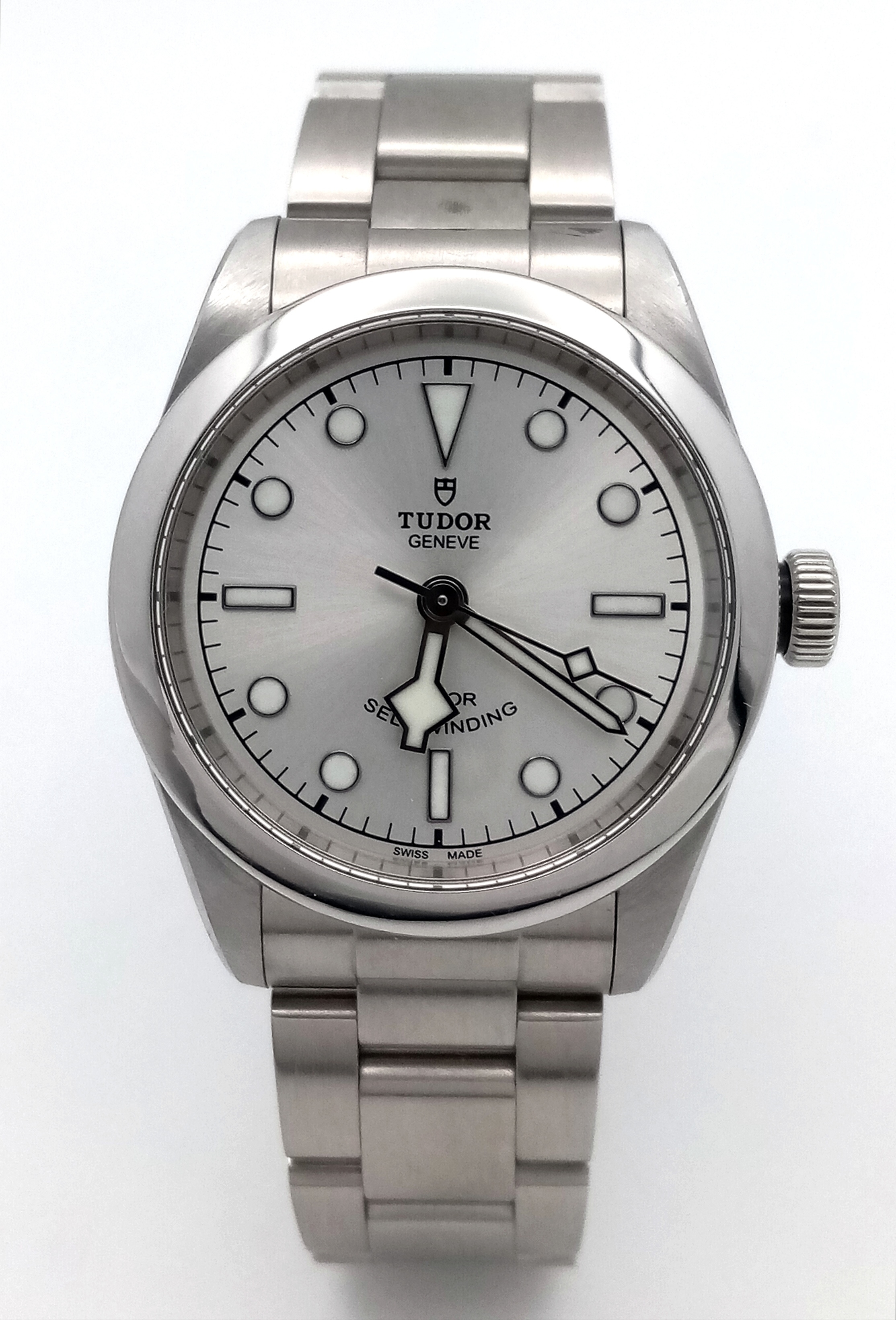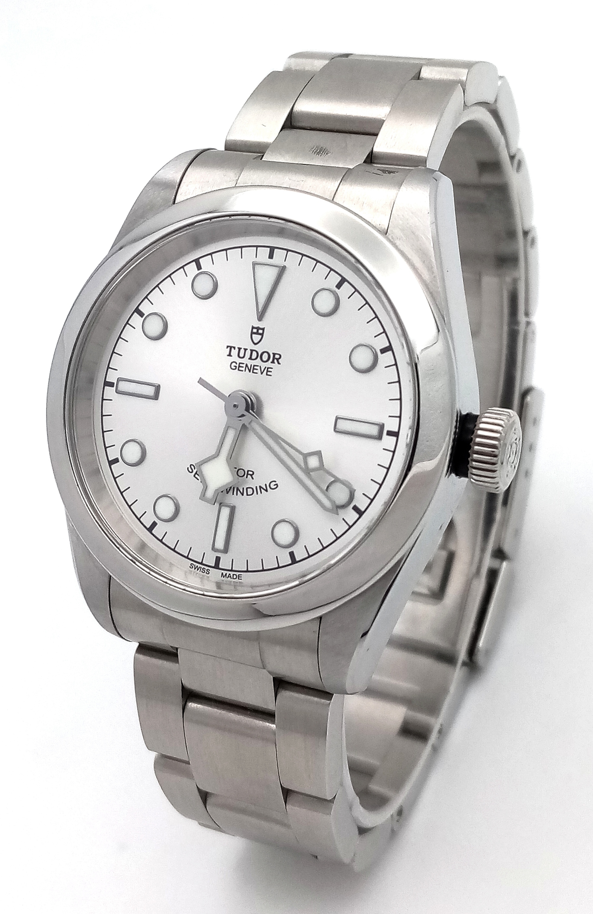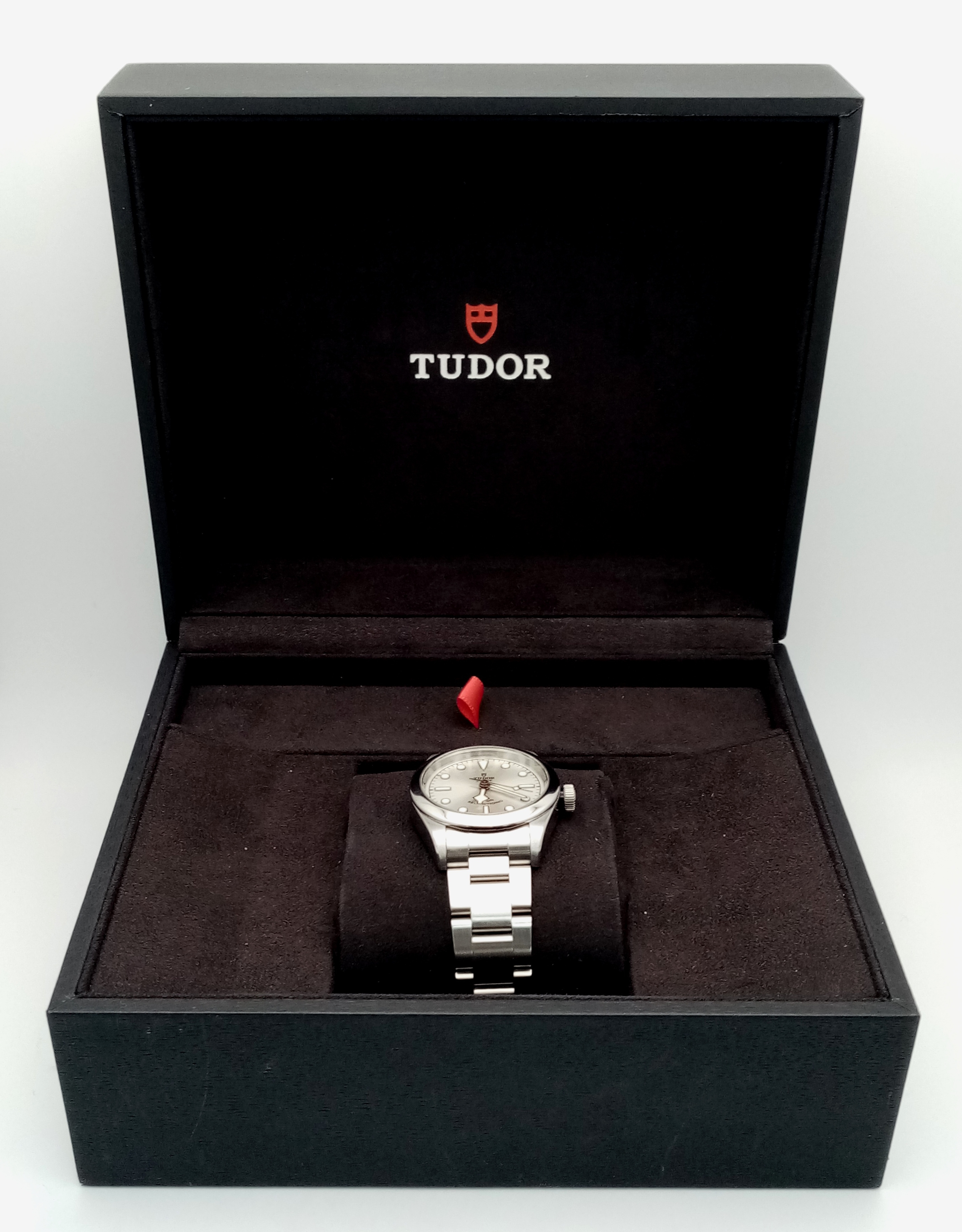 A Tudor Black Bay Automatic Ladies Watch. Model 79580. Stainless steel bracelet and case - 32mm. Silver tone dial. In good condition and working order. Comes with box and papers. Ref: 010234