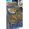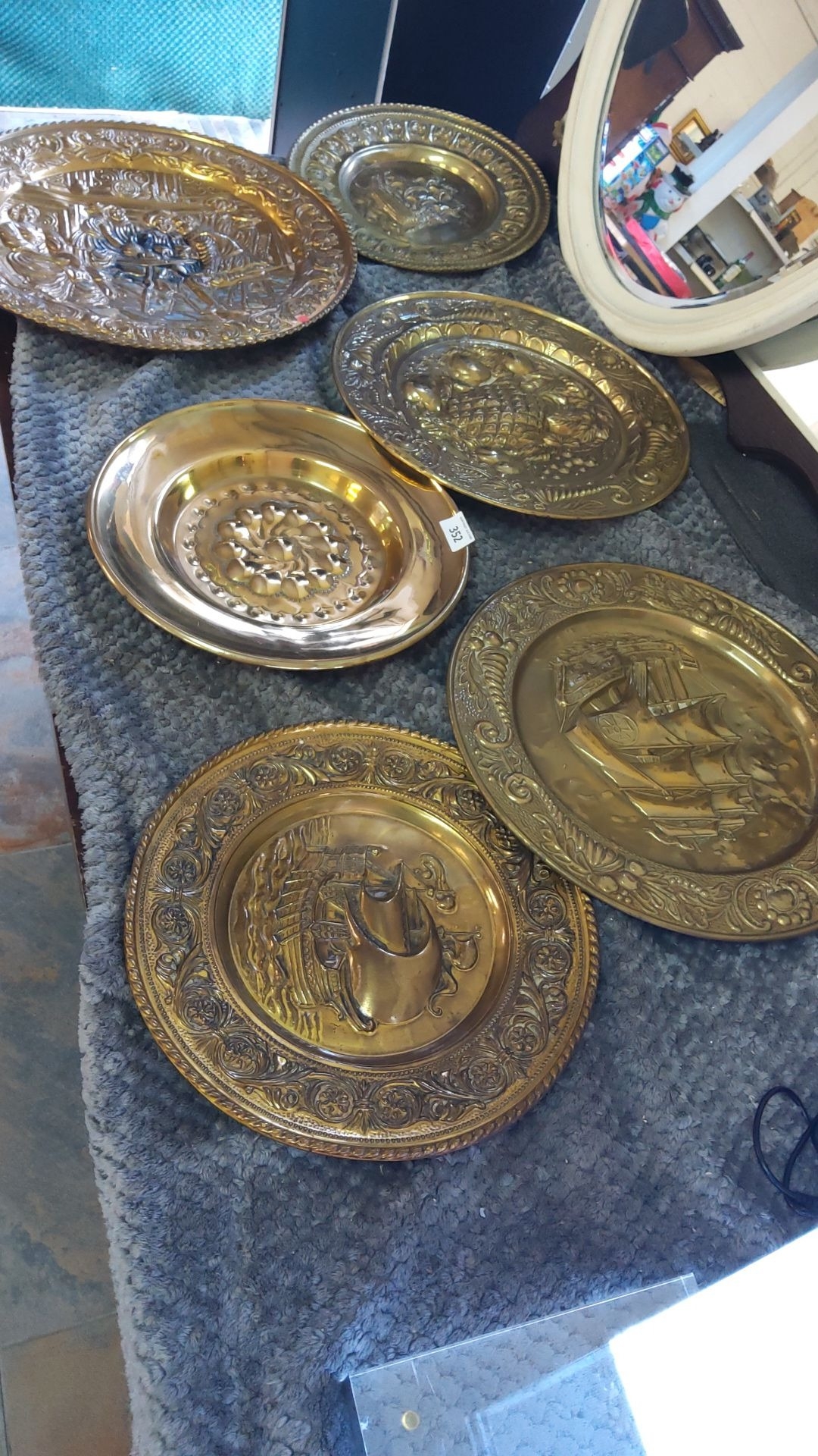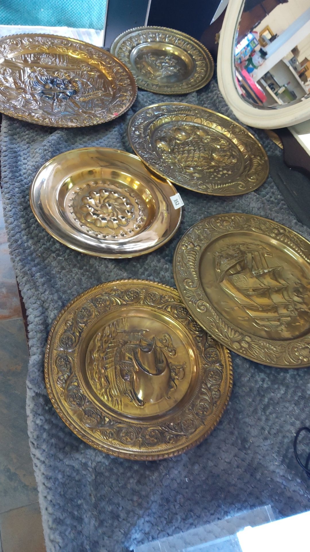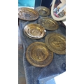 Set of six embossed brass wall plates with maritime and floral motifs.