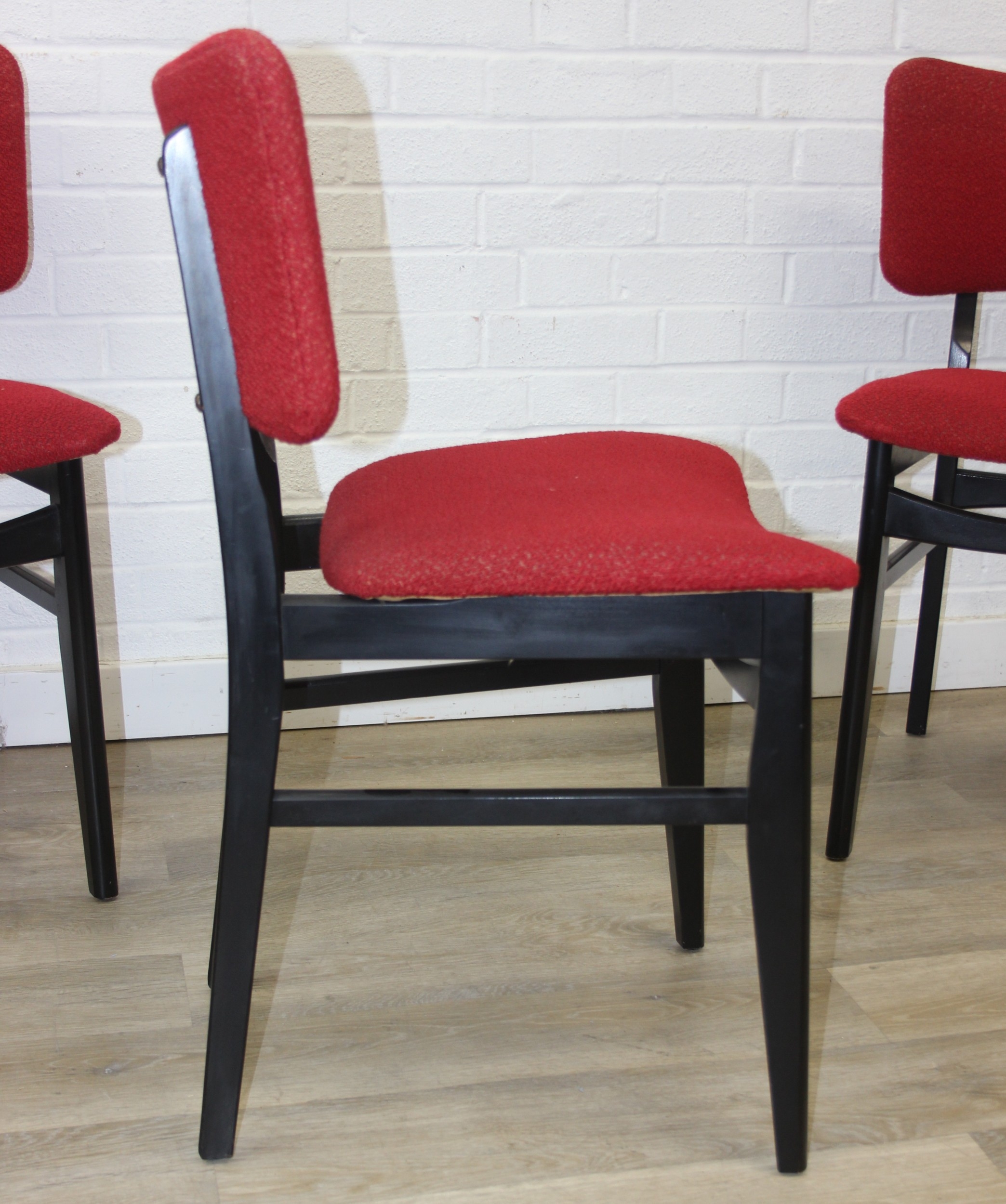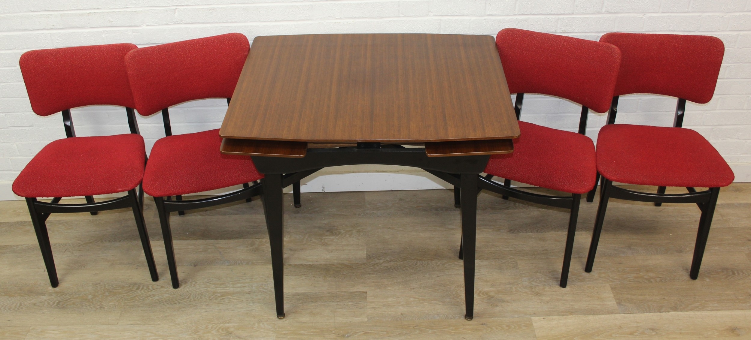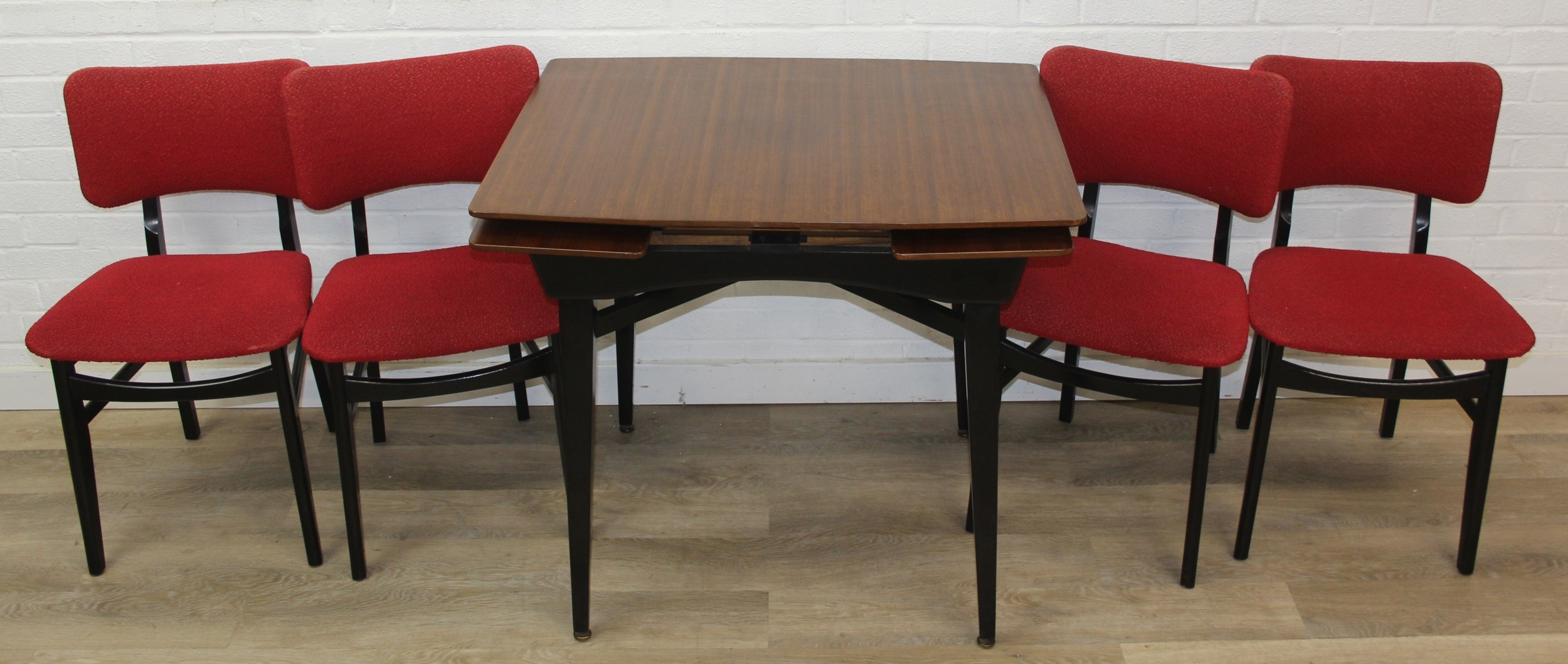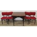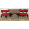 A retro 1950's extending dining table and four chairs, the chairs with red fabric upholstery, seemingly unbranded, the table 92cm x 76cm x 77cm (extending to 145cm)
