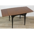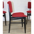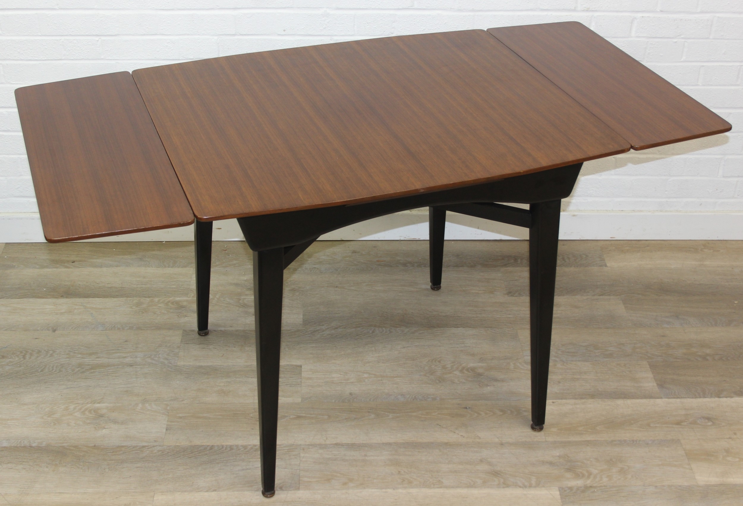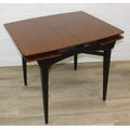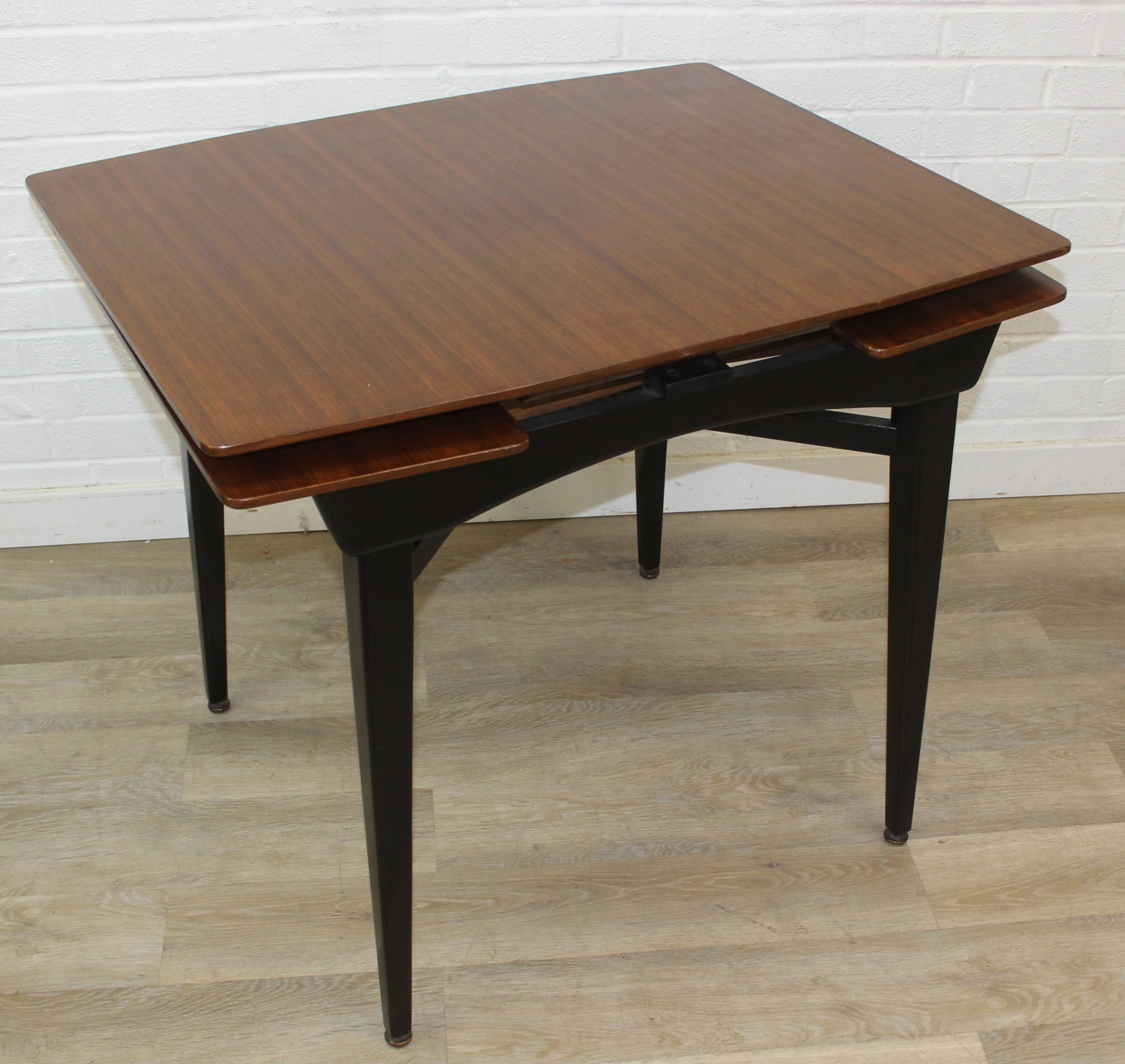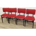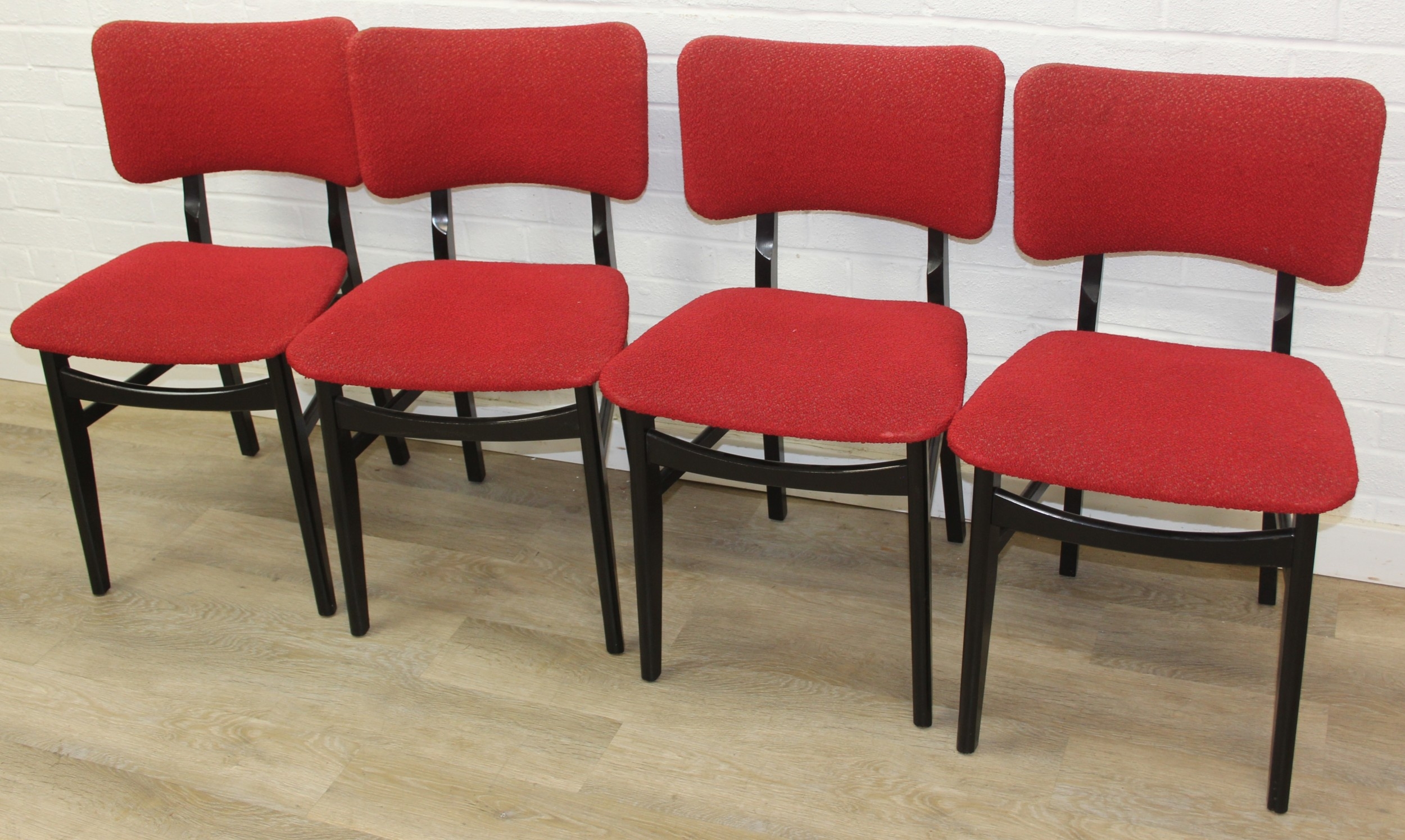 A retro 1950's extending dining table and four chairs, the chairs with red fabric upholstery, seemingly unbranded, the table 92cm x 76cm x 77cm (extending to 145cm)