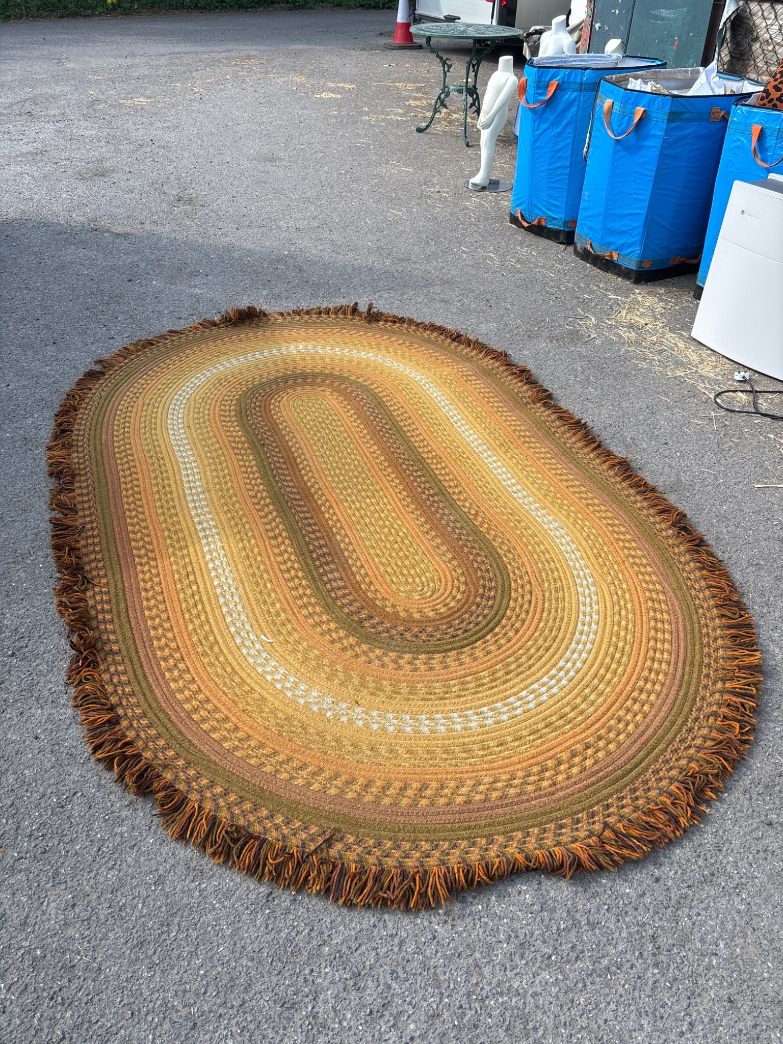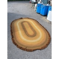 1970s oval braided rug with multicolor design, edged in fringe.not postable
