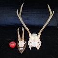 Two fabulous deer antlers including a red deer along with a roe deer mounted on a wooden plaque.