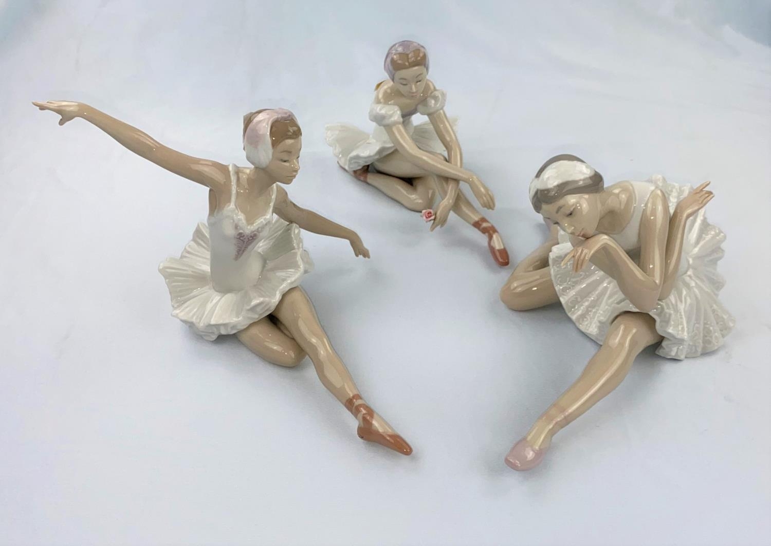 Three Nao figures of girl ballerinas doing floor exercises