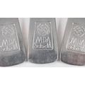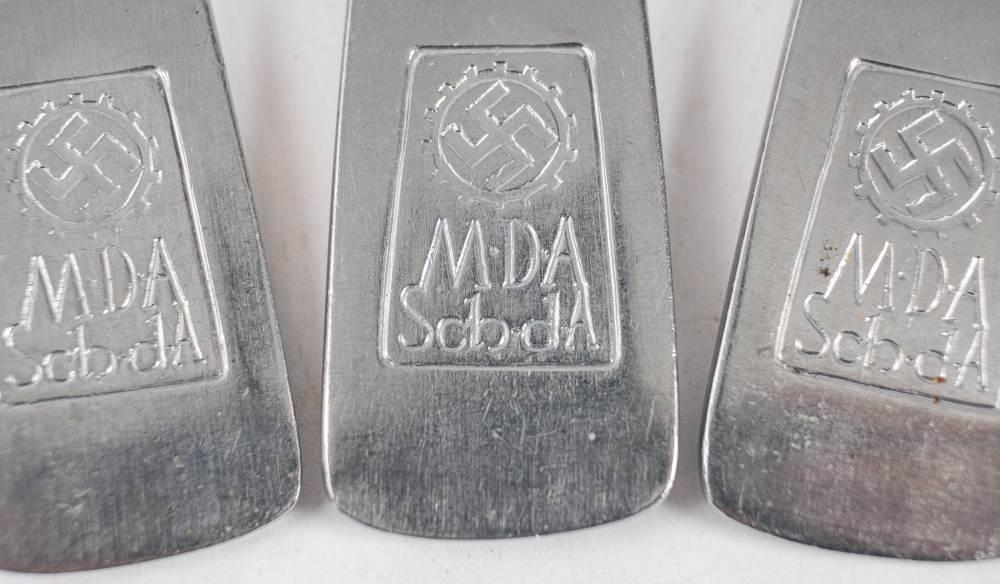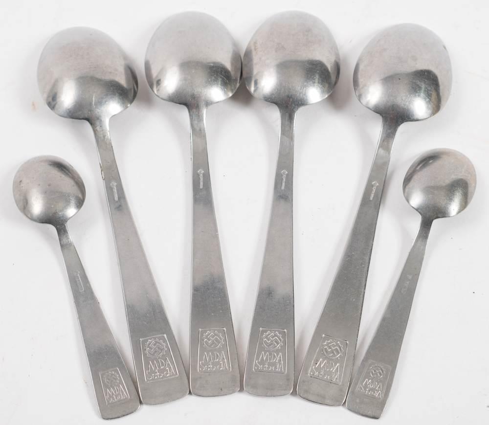 A set of four WWII NSDAP Labour Front table spoons and two matching tea spoons: all stamped with cogwheel motif and marked 'MDA Sch. dA' (6) .