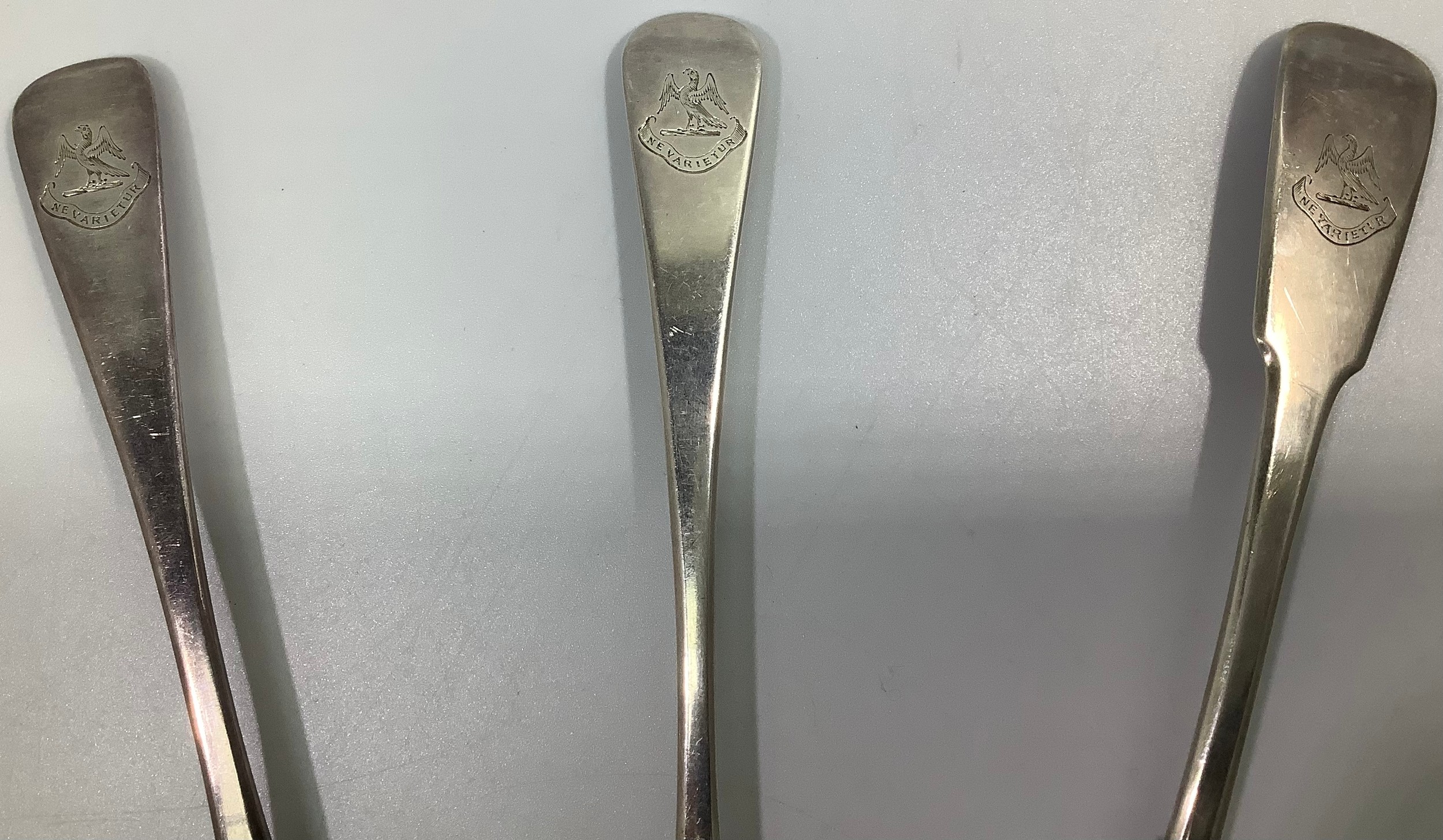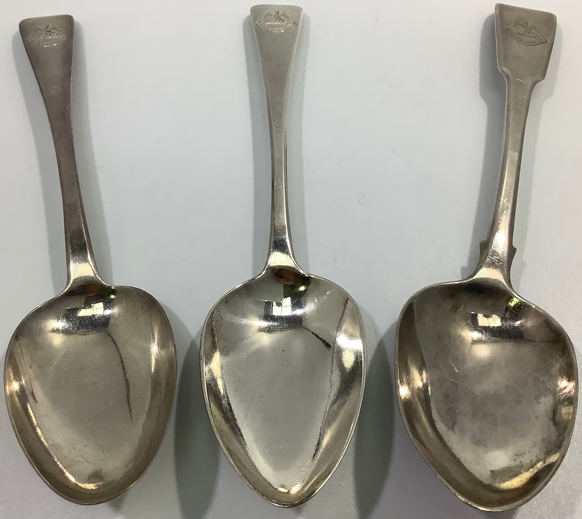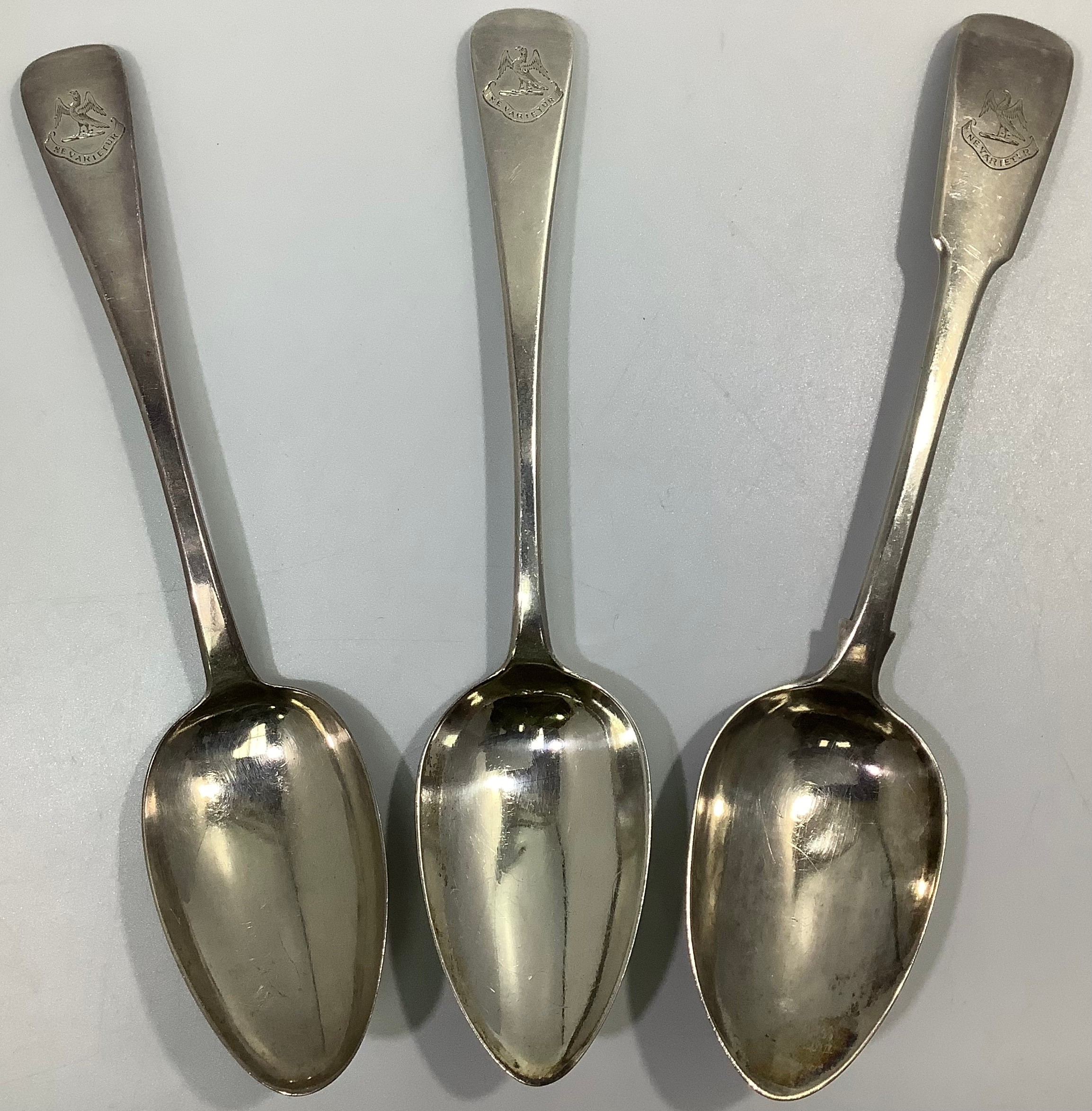 Three Georgian silver old English and fiddle pattern serving spoons, including one by William Woodman, hallmarked Exeter, 1825, all with etched phoenix crest and inscribed ‘Ne Varietur’ (unwavering) gross weight approximately 5.75ozt