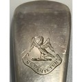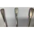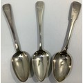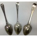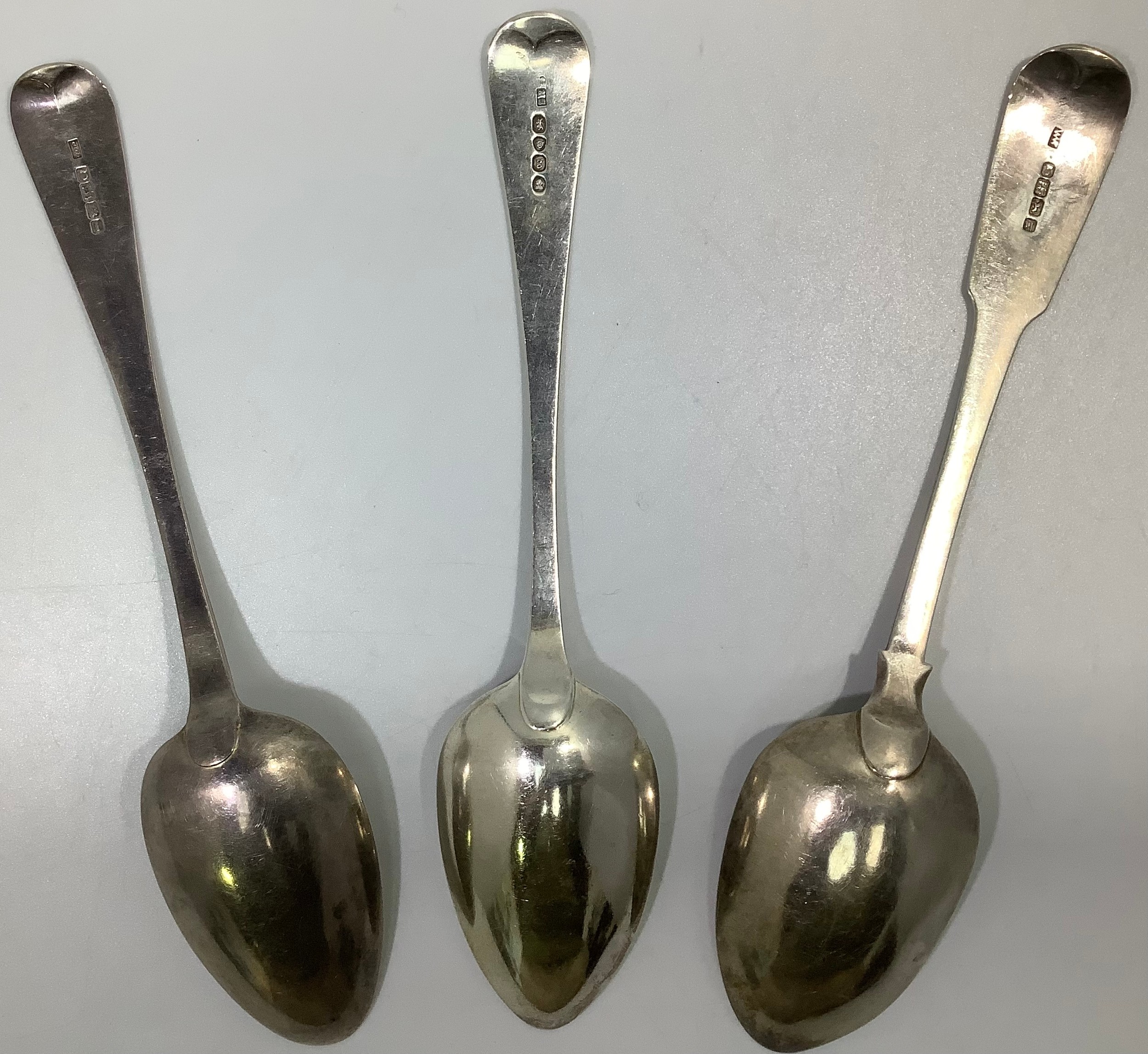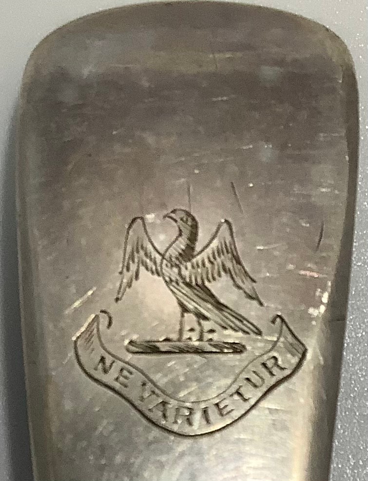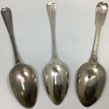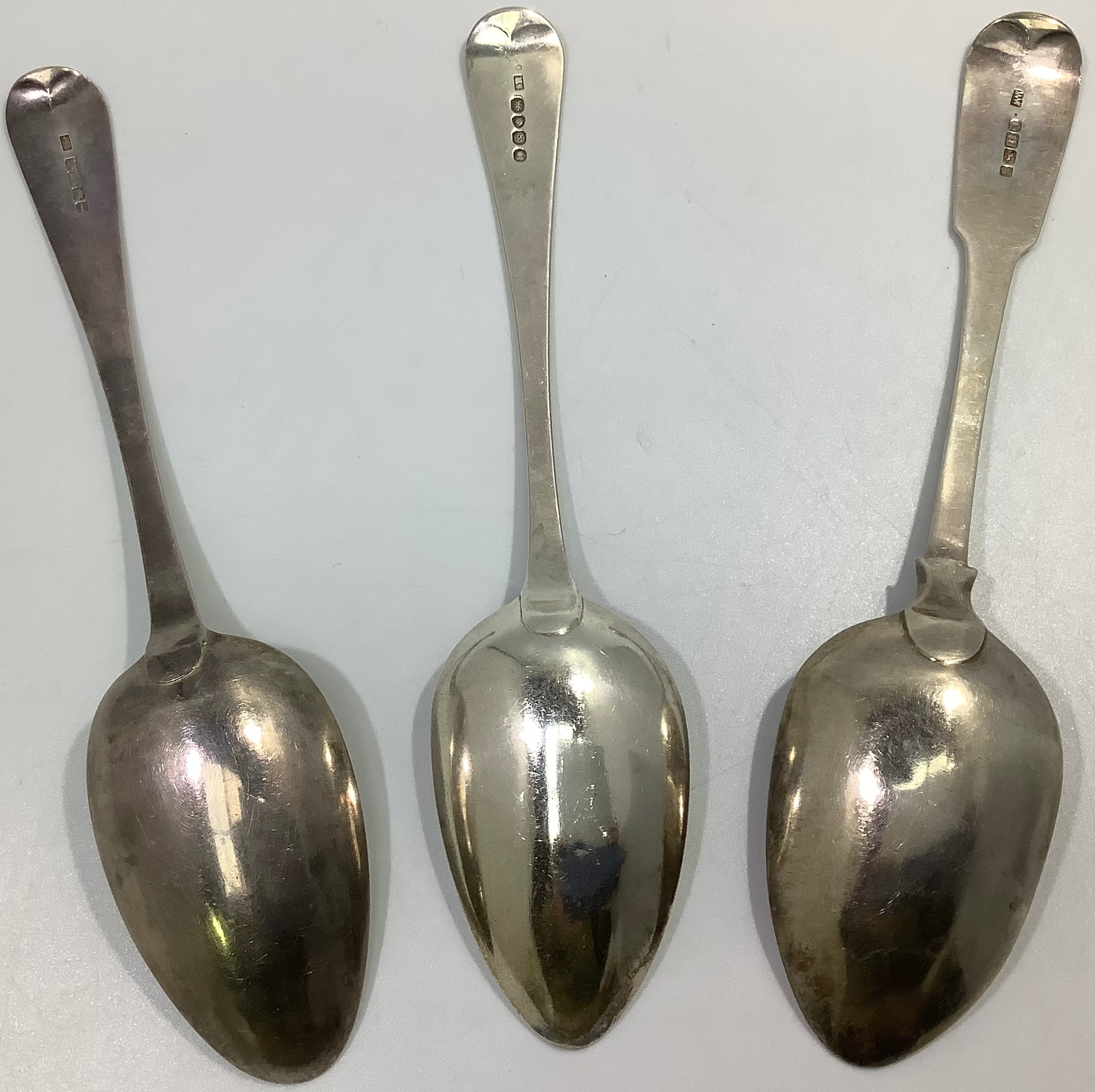 Three Georgian silver old English and fiddle pattern serving spoons, including one by William Woodman, hallmarked Exeter, 1825, all with etched phoenix crest and inscribed ‘Ne Varietur’ (unwavering) gross weight approximately 5.75ozt