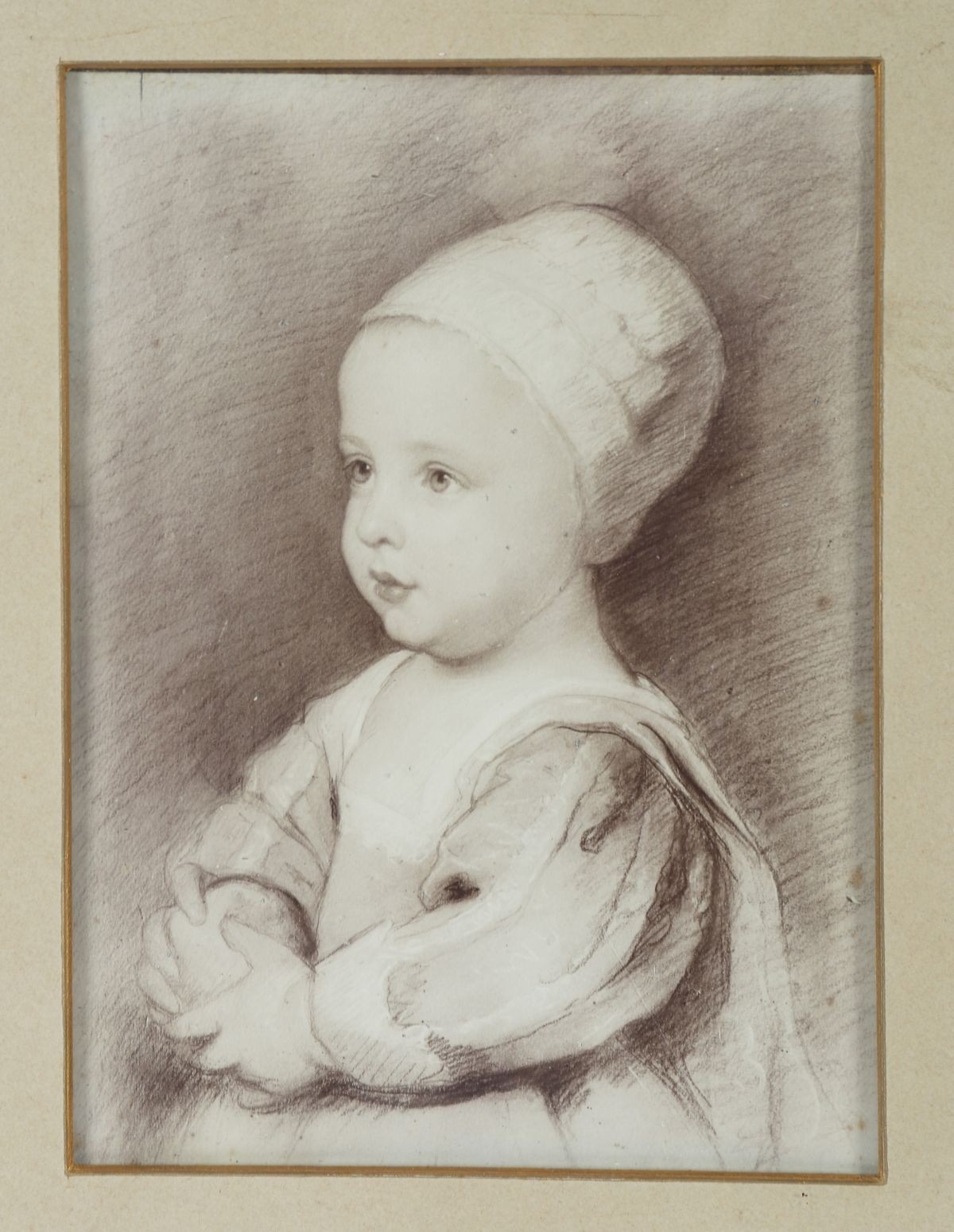 A 19th-century portrait study after Sir Anthony van Dyck, depicting a young woman in three-quarter profile, executed in soft tonal gradation. Mounted and framed.