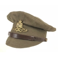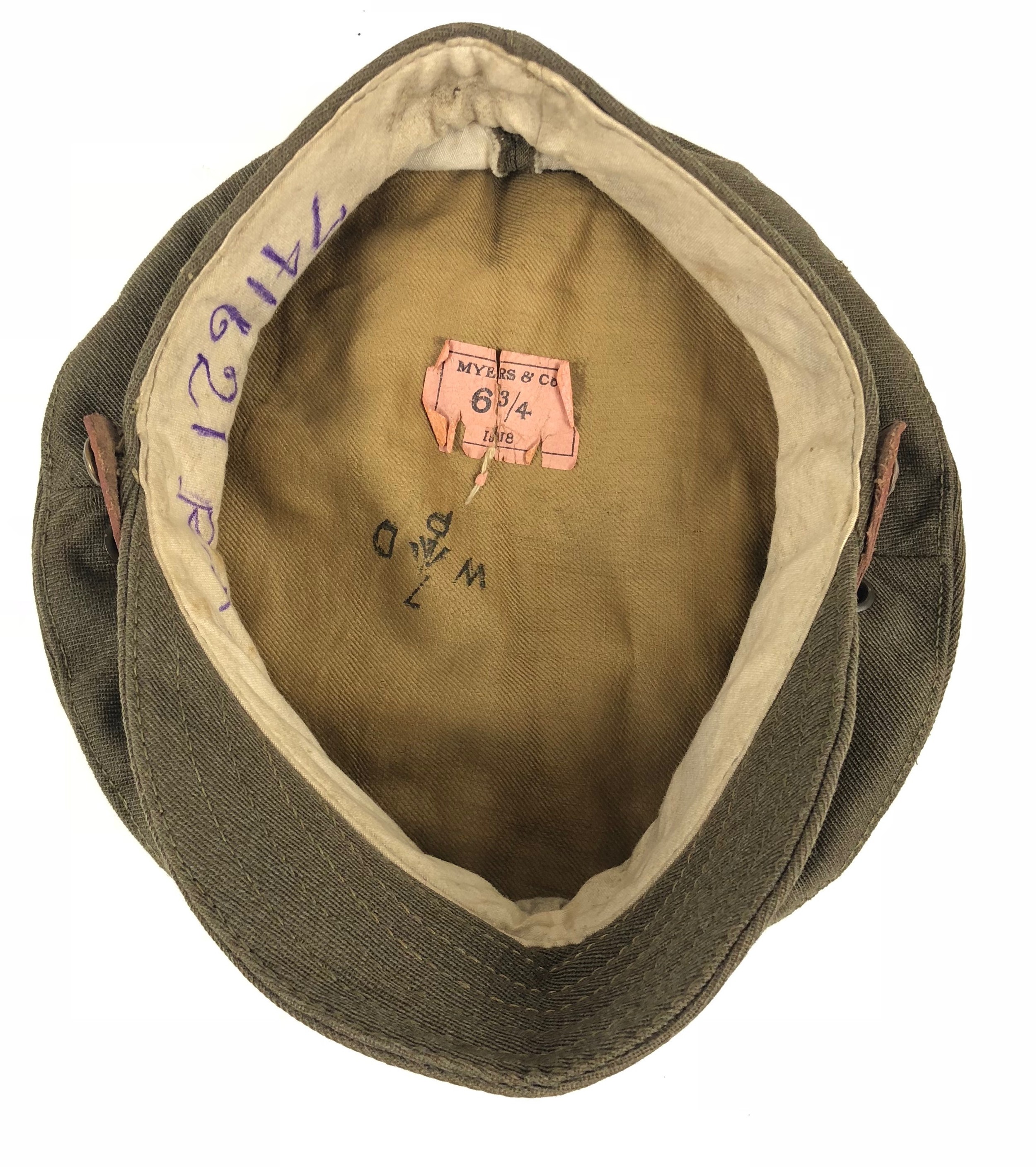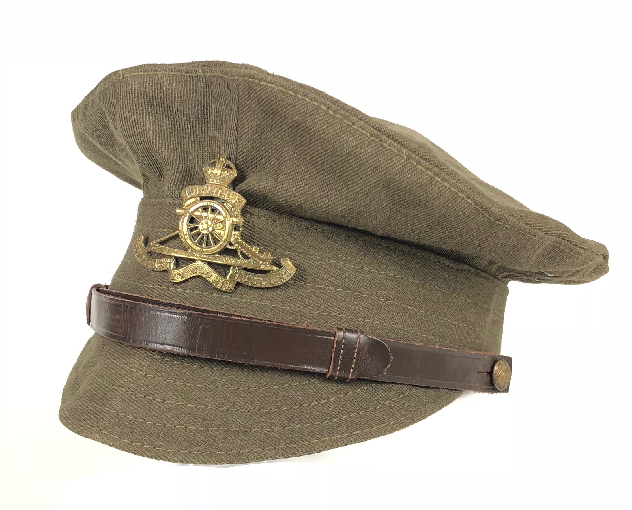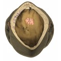 WW1 1918 Royal Artillery Other Rank’s Denim Trench Cap. An exceptional example retaining 1918 paper label and issue stamps to the cotton lining. The wool sweatband with details 741621 RA. Fitted with a brass Royal Artillery cap badge and an incorrect leather chinstrap. VGC.