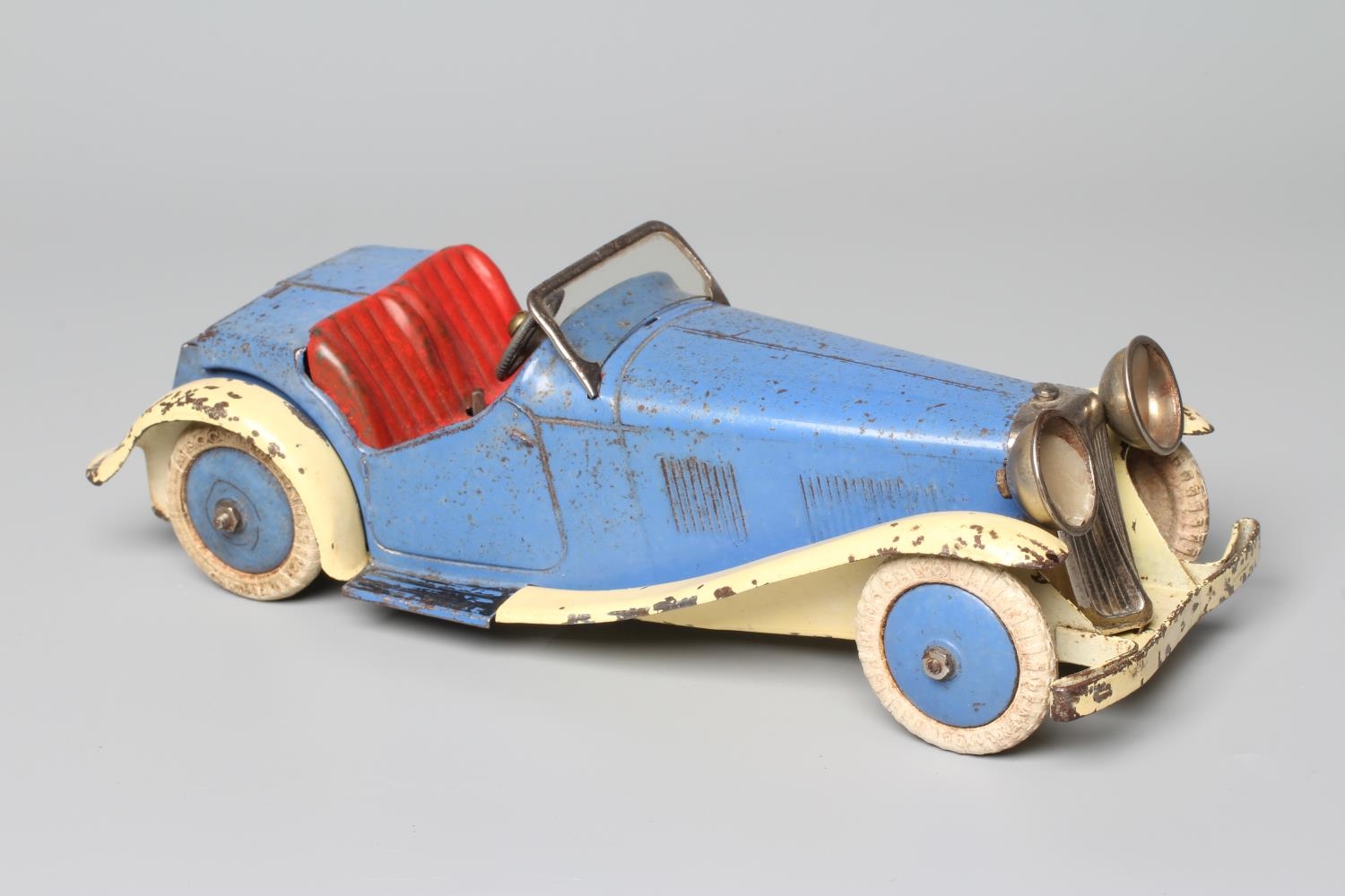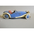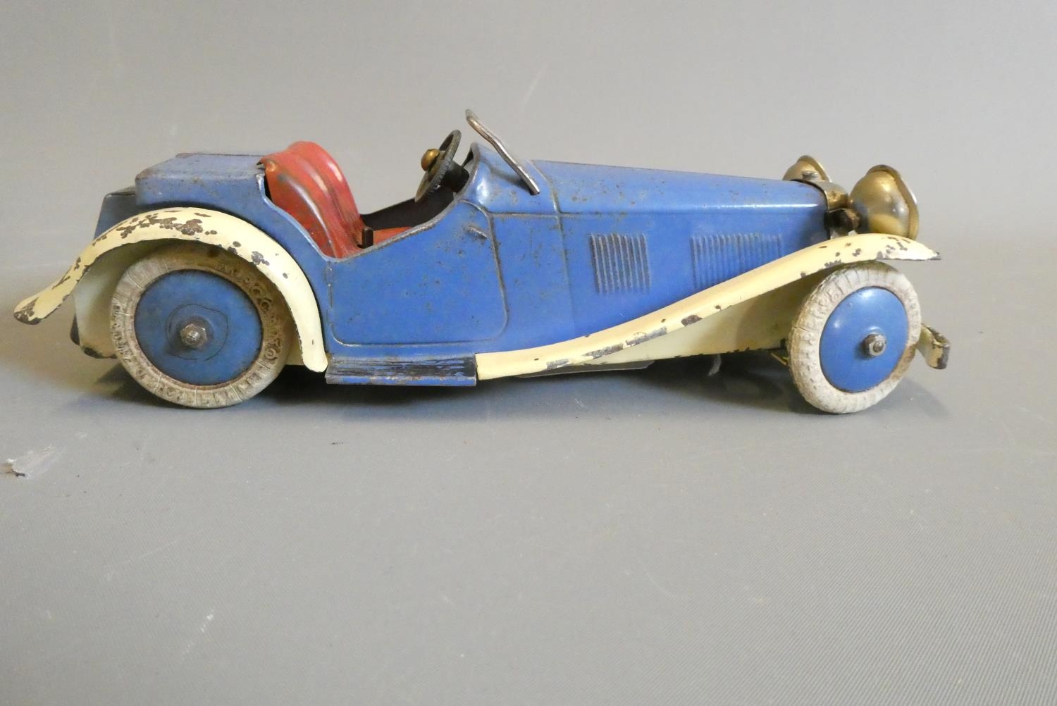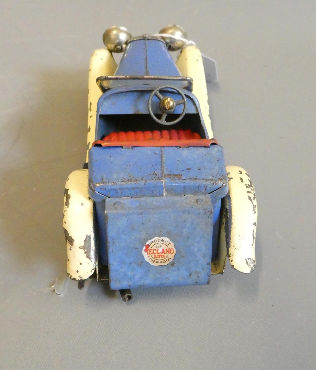 Meccano clockwork car finished in blue and white, some paint loss, minor rusting. Clockwork motor runs but does not drive wheels. Fair