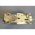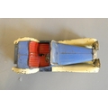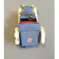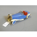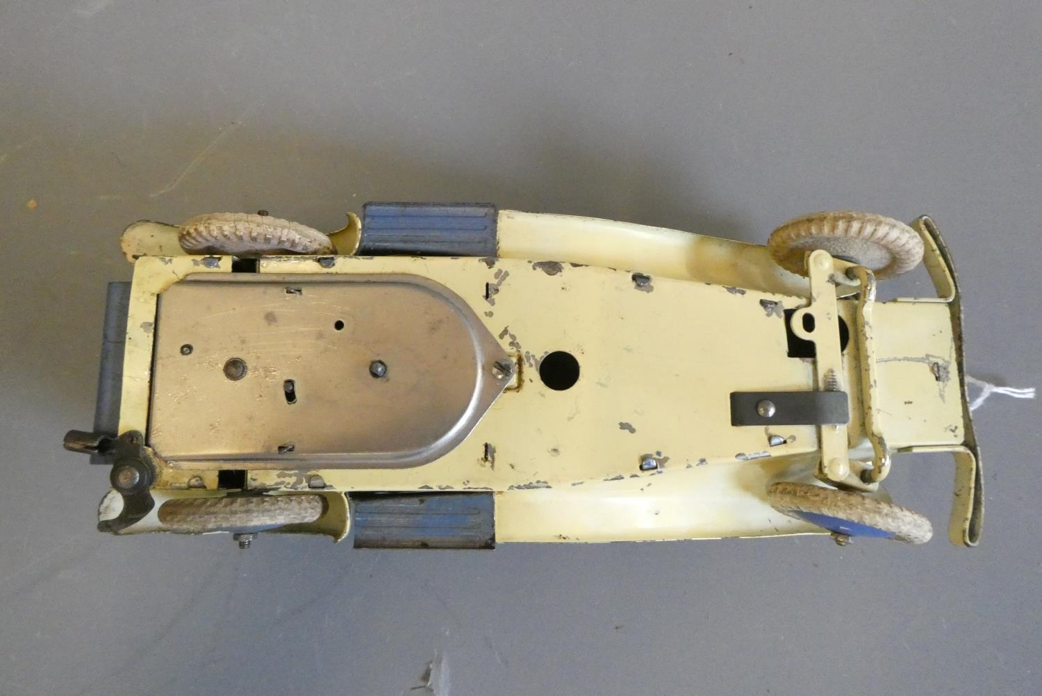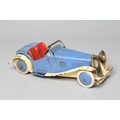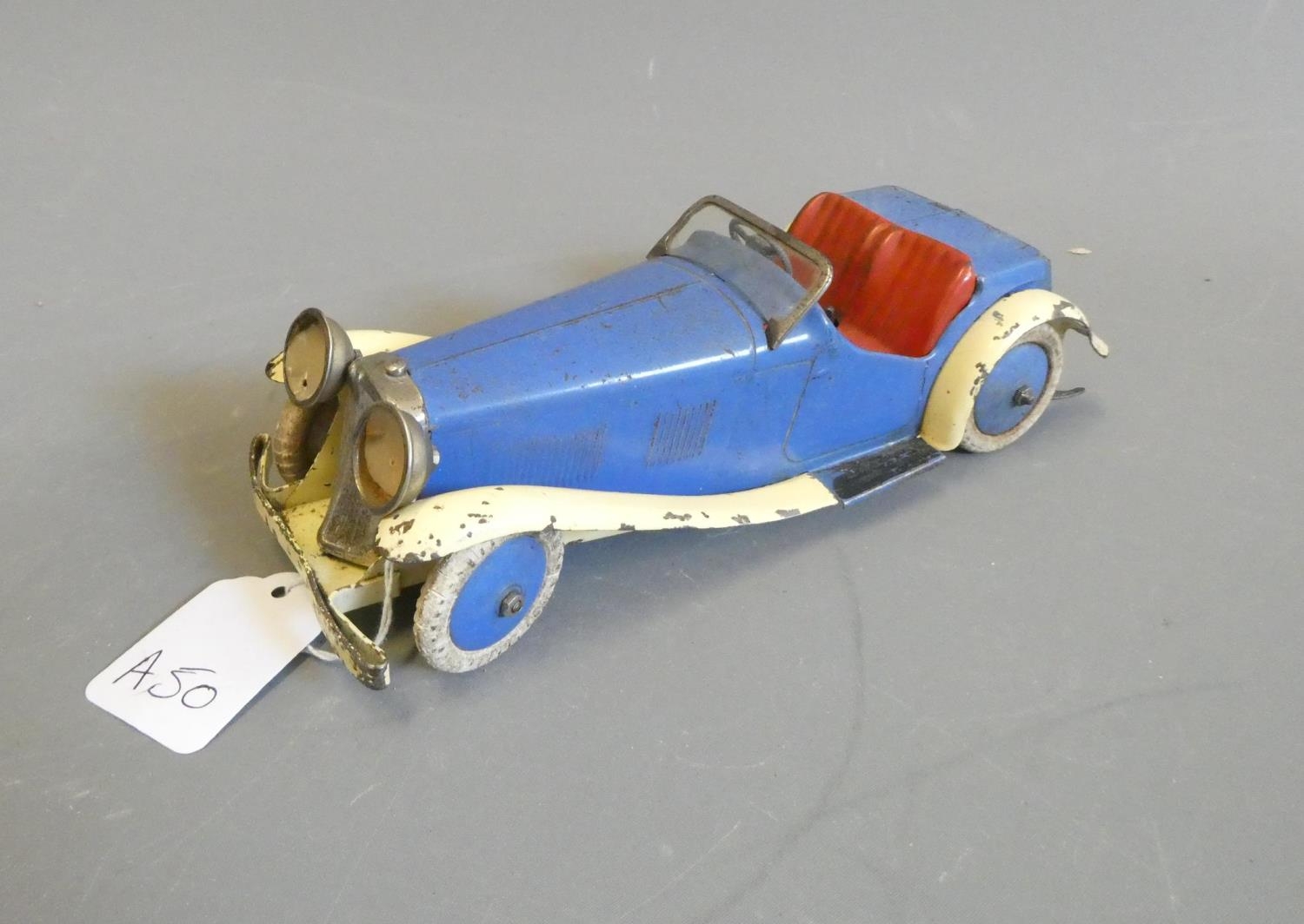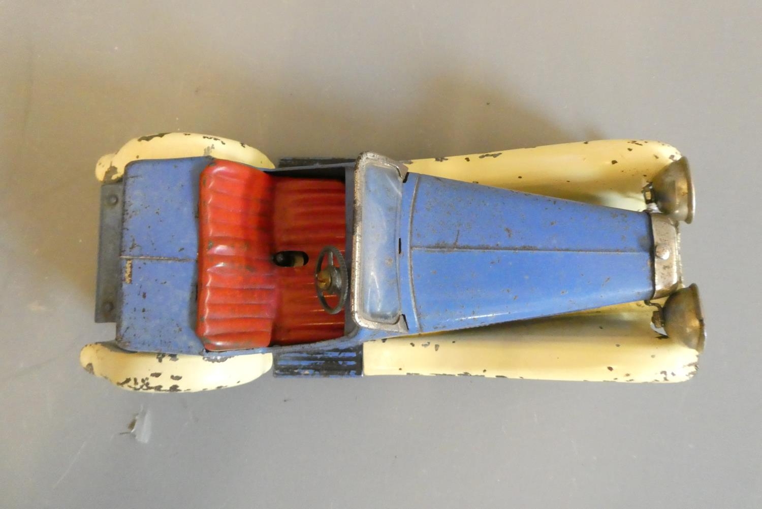 Meccano clockwork car finished in blue and white, some paint loss, minor rusting. Clockwork motor runs but does not drive wheels. Fair