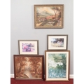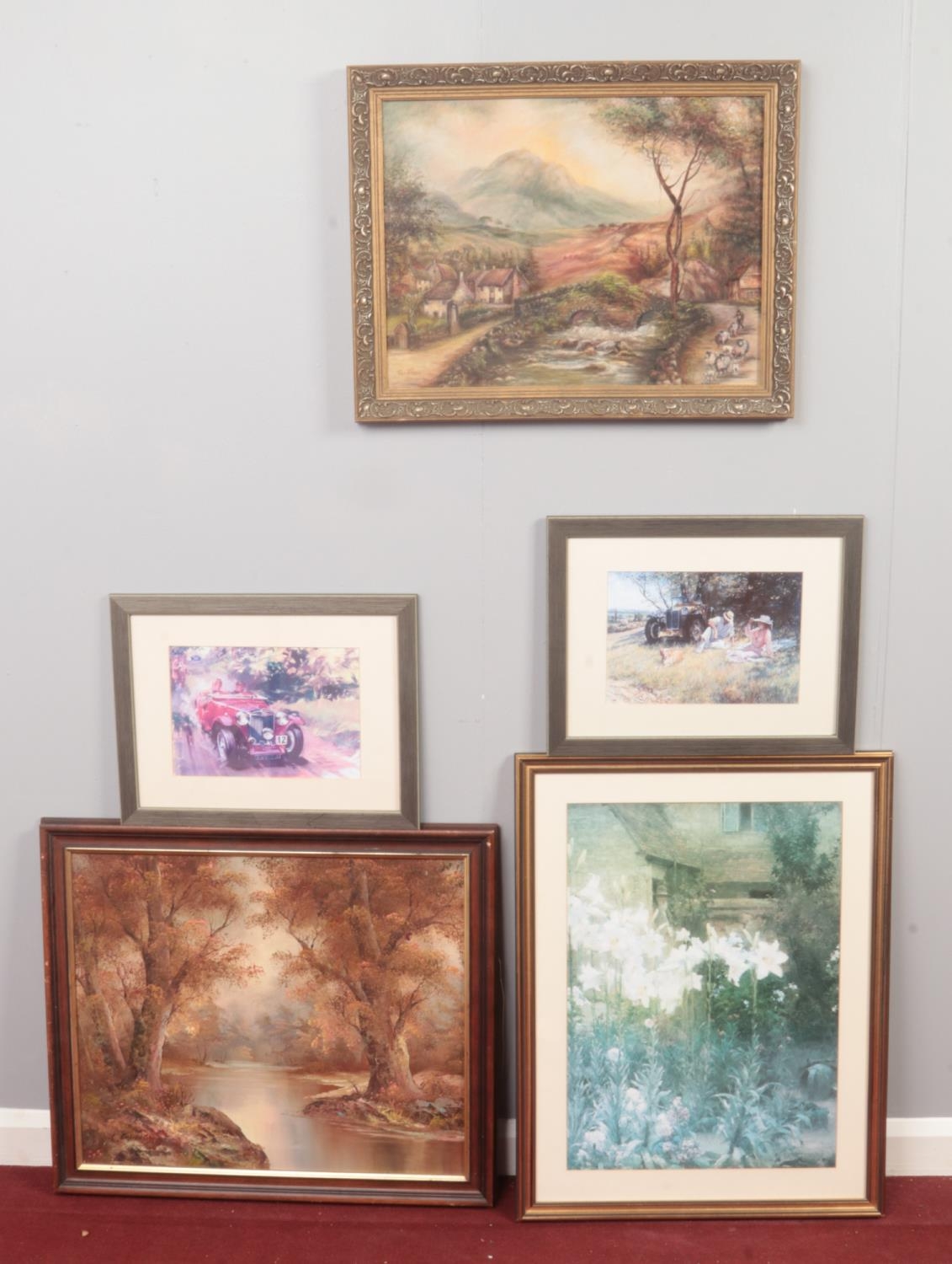 A selection of five paintings and prints. Comprising of an oil on canvas rural scene signed (I Cafiero) H: 50cm, W:59.5cm - an oil on board of a rural scene, signed by (D Harris) H: 39cm, W: 52cm, & three framed prints, one print of a garden scene signed by Walter Osbourne etc.