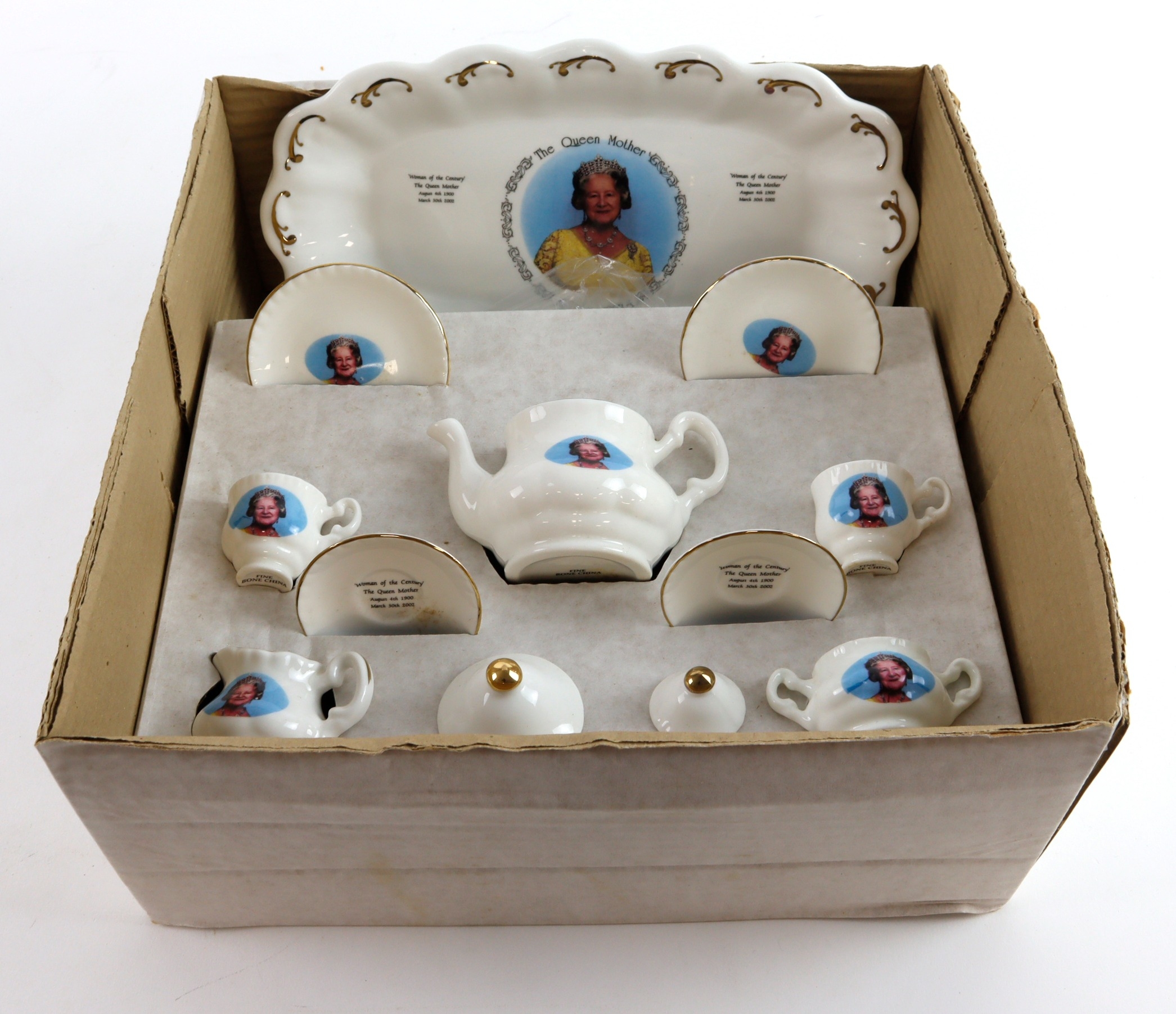 Queen Elizabeth, the Queen Mother fine bone china boxed child's "In Memorium" tea set, comprising, teapot, milk jug, sugar bowl, two cups & saucers & two side plates, dated 2002 (9 pieces in all)