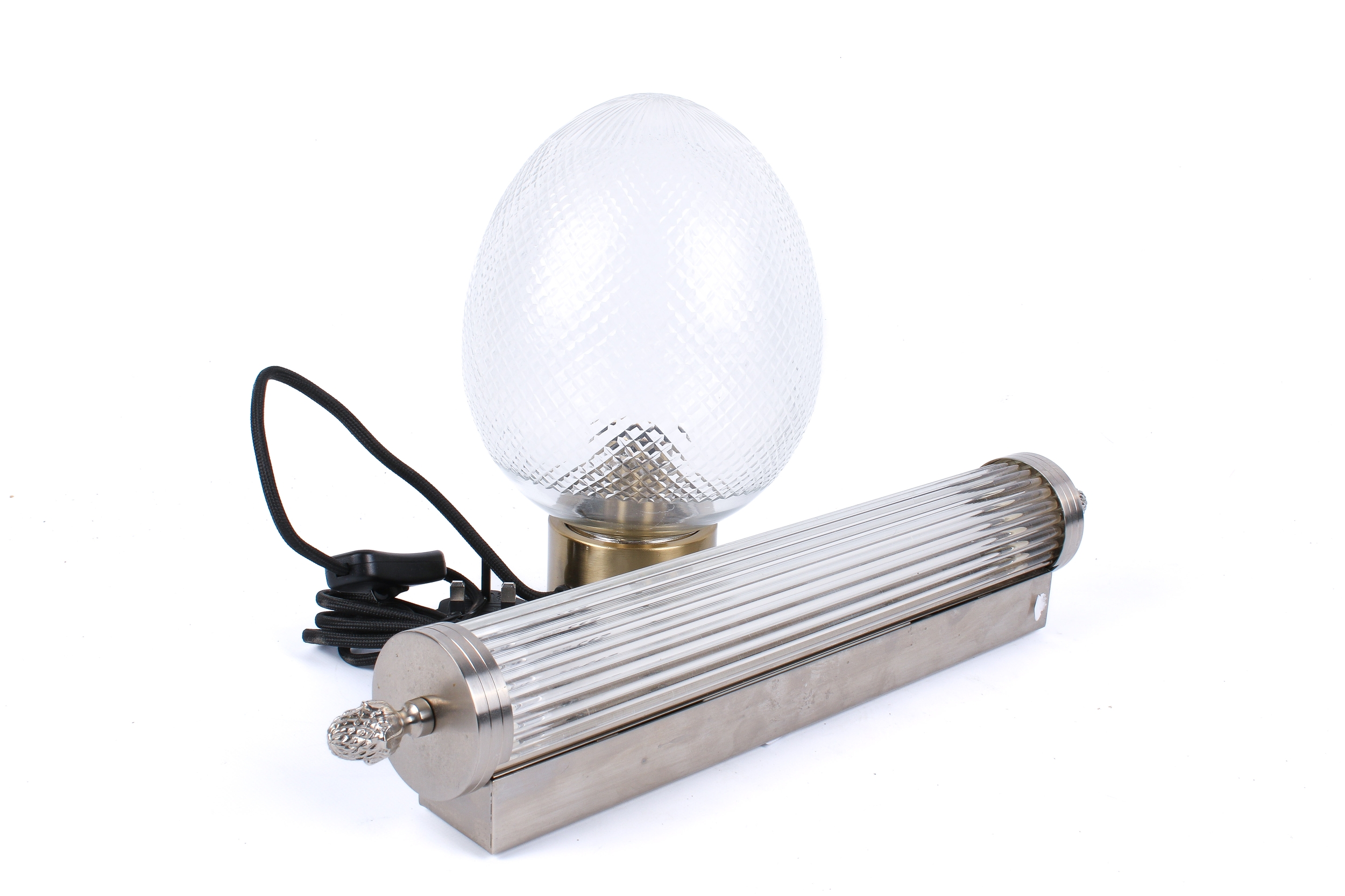 Two assorted modern lights. Including a contemporary Art Deco style wall light with glass rods and pineapple finials plus a globular shaped table lamp. Largest H25cm