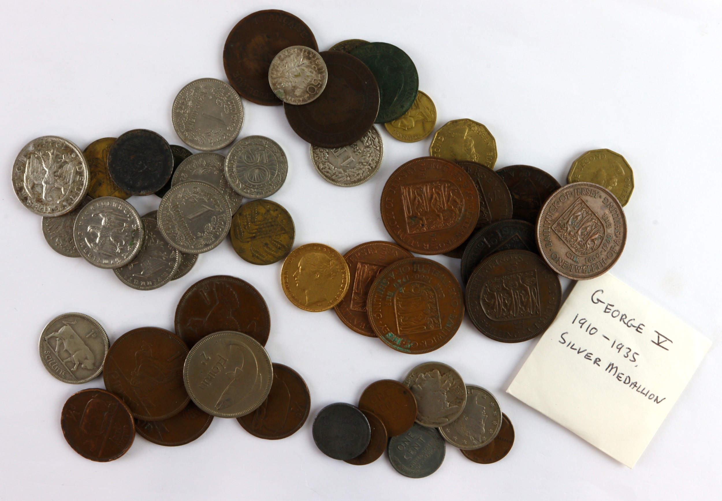 Sovereign 1884M (Melbourne, Australia) St George, GF small edge nick; this along with a group of 45 world coins comprised of: 11x Channel Islands; 7x Ireland; 13x Germany; 7x France; 7x USA; 19th-20thC, a few silver noted; plus a George V Jubilee 1935 small silver medal (surface marks).